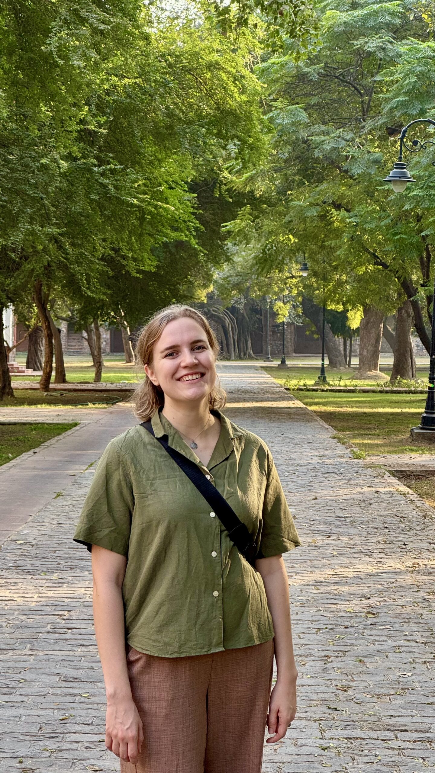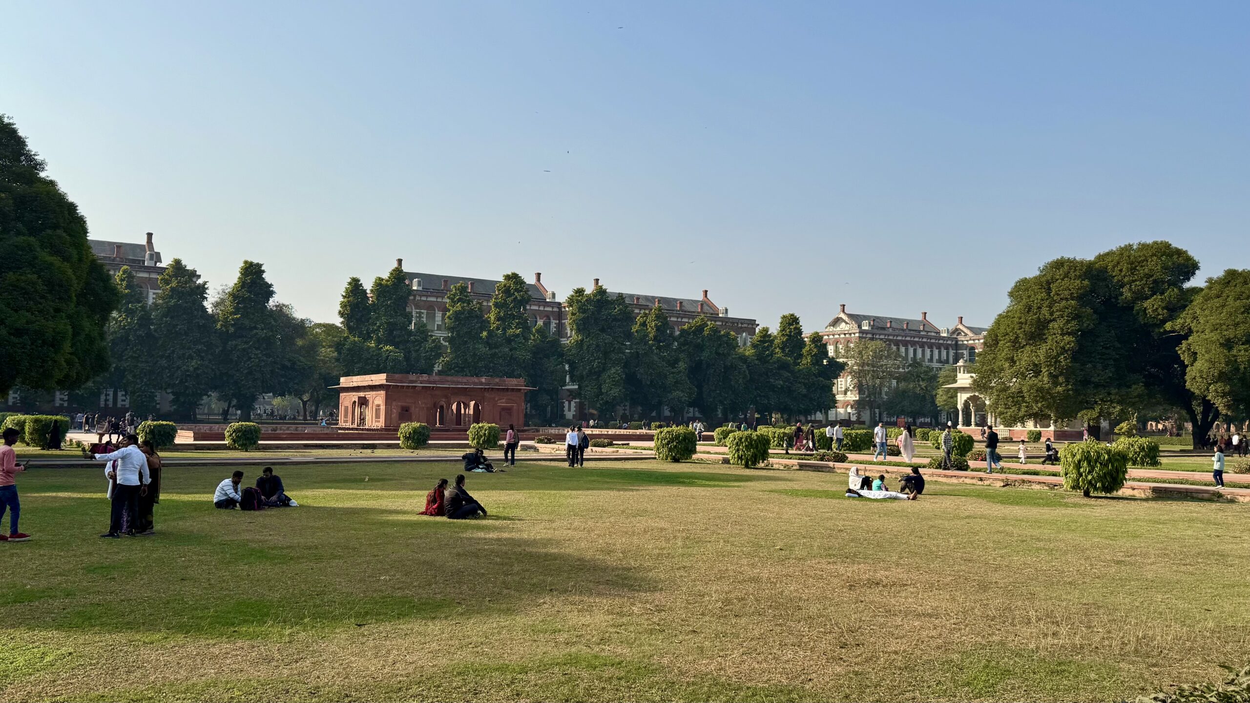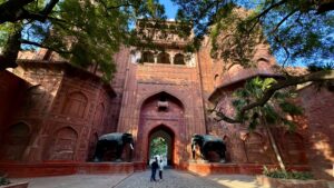 Im Inneren des Red Forts fanden wir zunächst einen kleinen Basar und schließlich eine große grüne Fläche mit vielen einzelnen Gebäuden, die über das Gelände verteilt sind. Wir verbrachten allein in der Anlage etwa zwei Stunden und sind sicher, dass wir nicht mal die Hälfte gesehen haben. Meistens hielten wir uns von den großen Menschenmassen fern, da wir sonst sehr schnell angesprochen wurden, um Fotos zu machen. Dabei entdeckten wir auch abgelegenere Monumente, die leider teilweise in einem schlechteren Zustand waren. Es schien, als würden nur die stark besuchten Bereiche gut instand gehalten, während die Randbereiche der Festung weniger gepflegt werden. Trotzdem konnten wir die Ruhe an diesen Orten genießen und entdeckten dabei zufällig eine kleine Kunstgalerie sowie ein Tor, das von Elefantenstatuen umrahmt war.