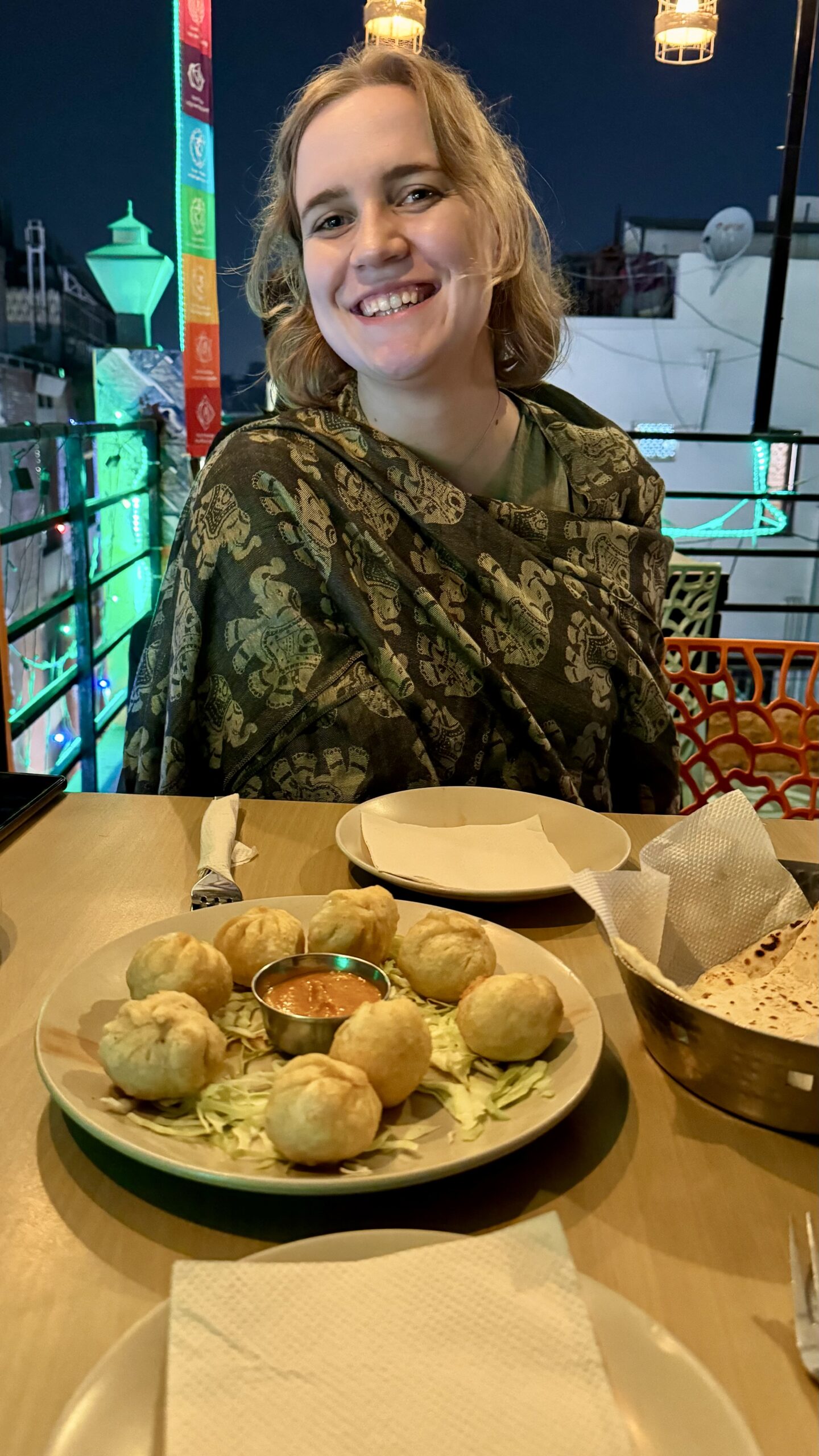 Erfreut, dass das so gut geklappt hatte, bestellten wir uns Kaffee und Tee, dazu ein Garlic Naan und „Momos“. Momos sind gedämpfte oder gebratene Teigtaschen, ähnlich wie Dumplings (oder Maultaschen). Sie sind in Indien, Nepal, Bhutan und Tibet sehr beliebt. Ursprünglich stammen sie aus der tibetischen Küche.