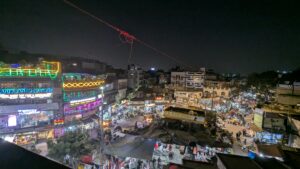 Mit einem Taxi ging es ca. 10 Minuten durch den Stadtverkehr, bevor wir uns schon wieder direkt in den verwinkelten und leuchtenden Gassen von Alt-Delhi aufhielten. Kaum 10 Minuten Fußweg weiter, überquerten wir einen kleinen Platz, schlängelten uns an Kühen, Straßenständen mit Obst und Gemüse vorbei, bis wir schließlich das „Everest Kitchen“ fanden. Ein kleines nepalesisches Restaurant mit einer Dachterrasse.