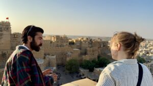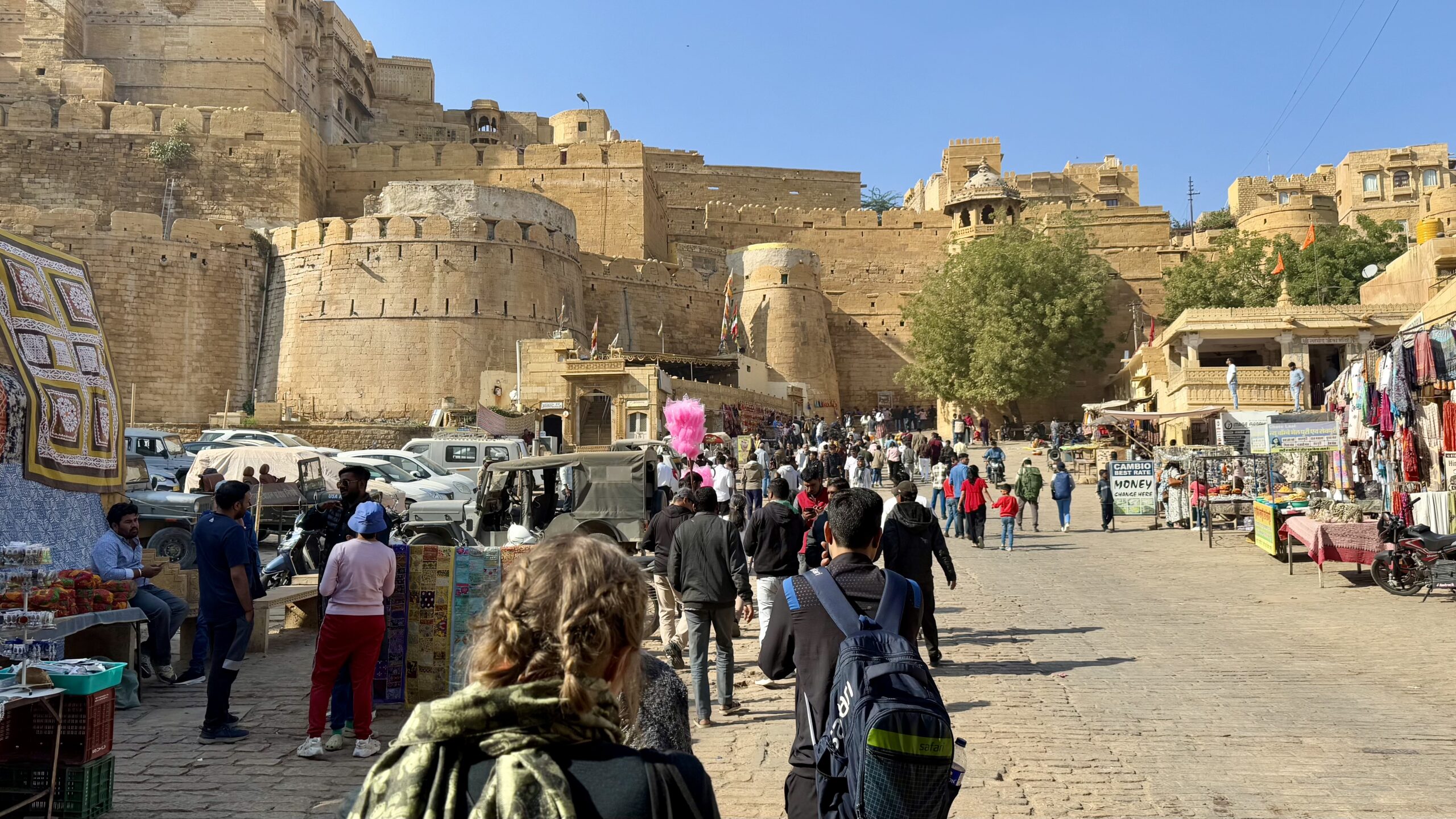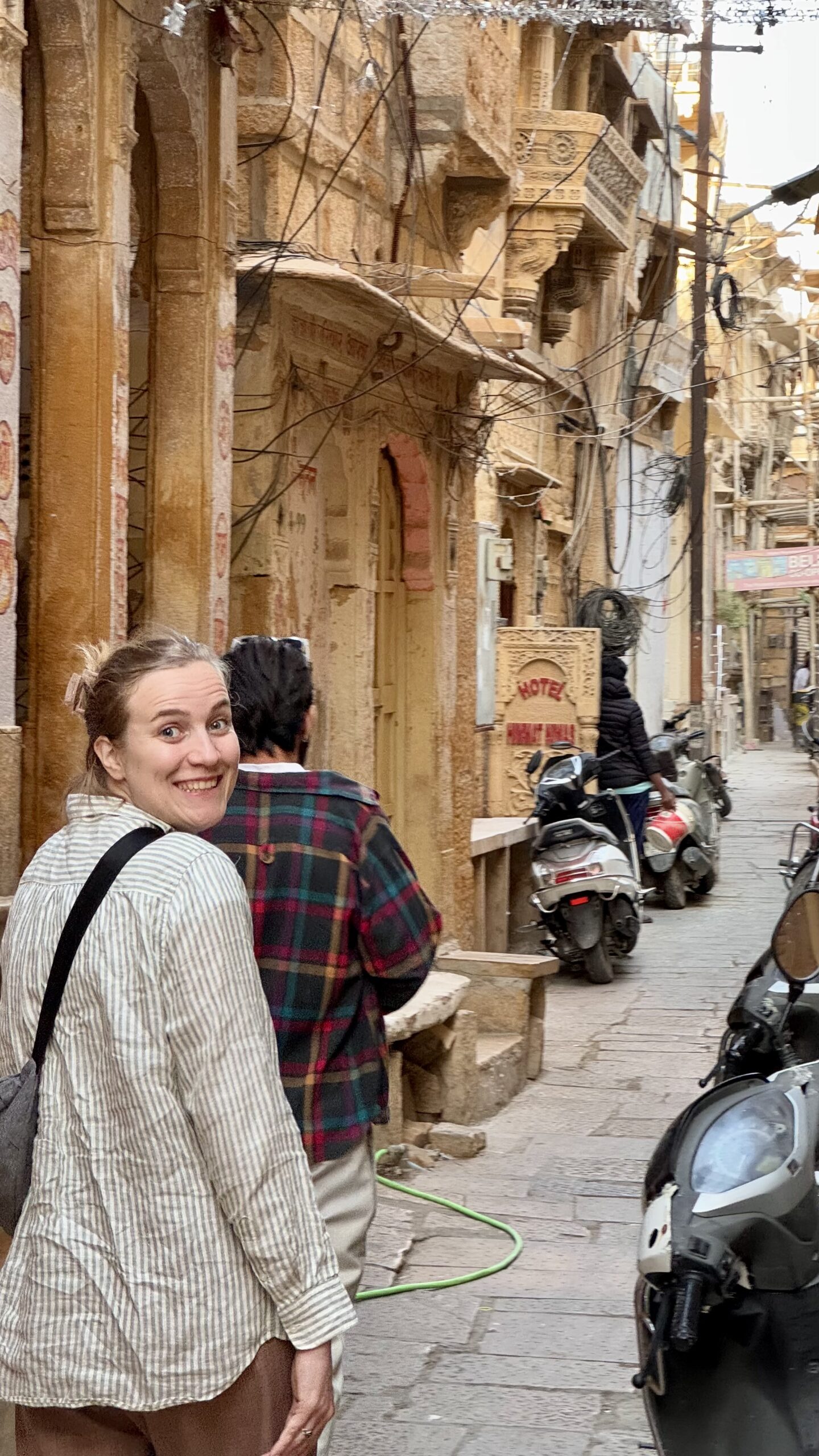 Aber beginnen wir am 11. Dezember: Wir verabschiedeten uns von Sunil, der uns gegen 14 Uhr am Eingang des Forts von Jaisalmer absetzte. Dort empfing uns unser neuer Gastgeber Ashish, bei dem wir für die nächsten drei Tage übernachten sollten.Jaisalmer ist eines der wenigen Forts, in denen die Menschen noch innerhalb der Festung wohnen. Diese ist auch ganz anders aufgebaut als die, die wir bisher gesehen haben. Während wir den Weg in die Festung gemeinsam mit Ashish zurücklegten, erklärte er uns viel zur Geschichte des Ortes. Zum Beispiel gelangt man über drei Tore in die Festung. Diese wurden so angelegt, dass man vom ersten Tor aus nicht das zweite sieht und vom zweiten nicht das dritte. Da es früher keine Karten oder GPS gab, wussten Eindringlinge nicht, wann sie wirklich im Inneren angekommen waren. Zudem sind die Aufgänge so eng gebaut, dass immer nur ein Elefant um die Kurven und durch die Tore passte. Dadurch konnten die Tiere nicht als Rammböcke genutzt werden, da sie durch die engen Kurven ausgebremst wurden.