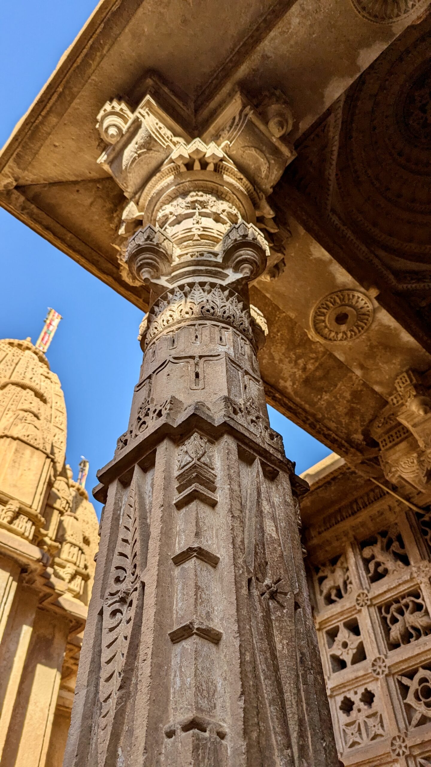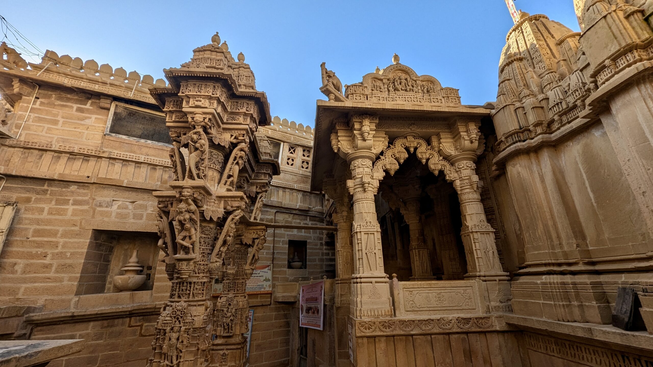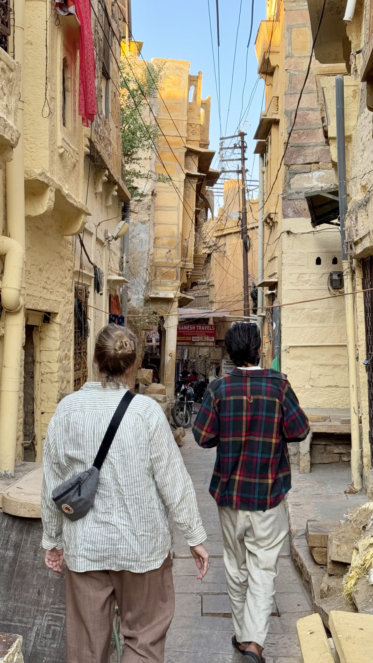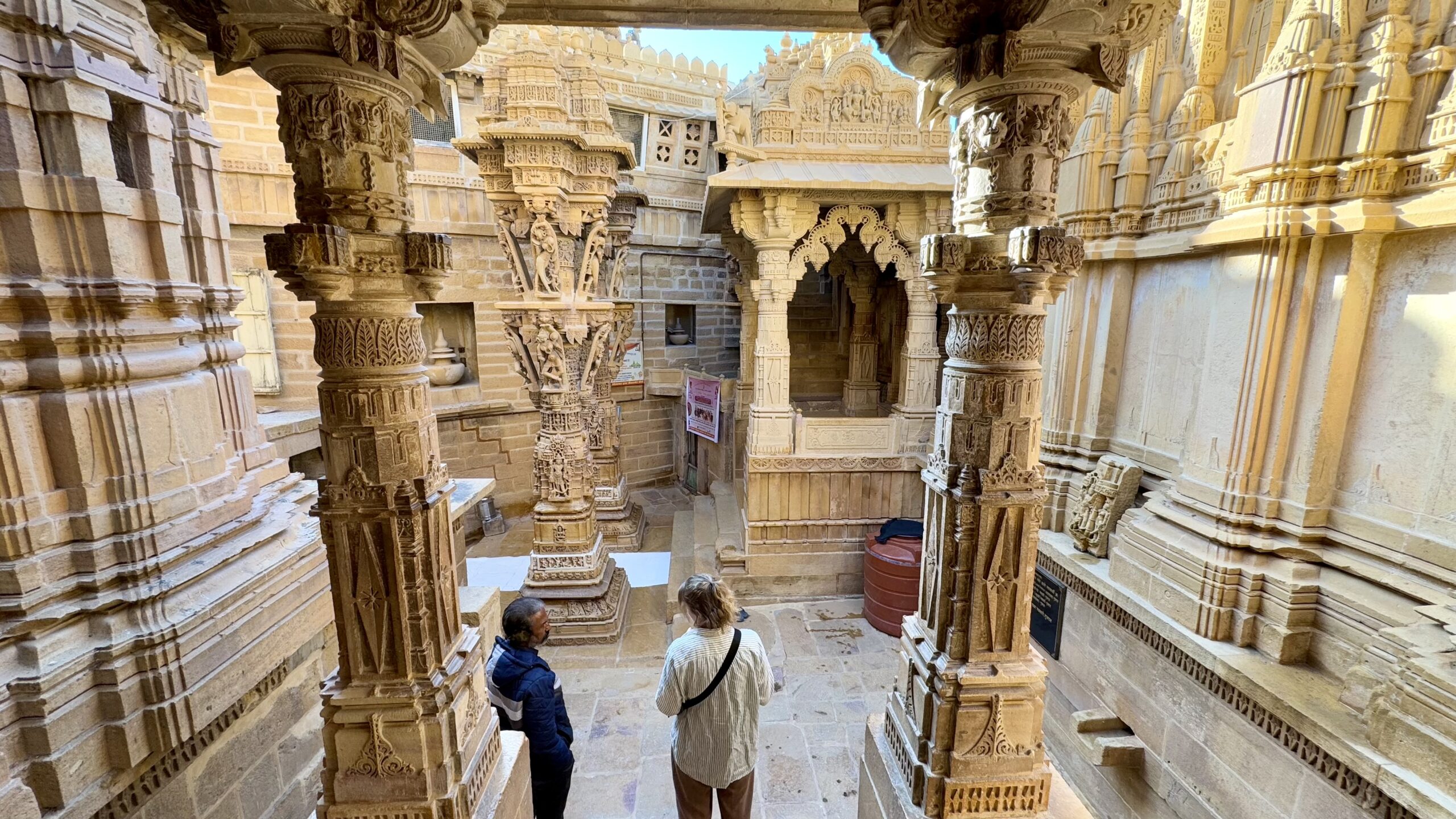 Ein Fenster, wie das, das wir bestaunen durften, hatte damals eine Bauzeit von bis zu zwei Jahren. Heutzutage wird diese Kunst nicht mehr so umgesetzt, was ich sehr schade finde. Man muss sich auch klarmachen: Ein einziger Fehler im Stein hätte das gesamte Gebäude unbrauchbar gemacht. Umso beeindruckender war der Balkon, den wir sahen – vollständig mit detailreichen Steinmetzarbeiten verziert. Ich hoffe, das Bild fängt seine Pracht ein. 😊Nach dem Rundgang genossen wir einige Aussichtspunkte innerhalb des Forts, von denen aus wir die gesamte Festung überblicken konnten: groß, golden, ikonisch. Kein Wunder, dass die Stadt als „Wüstenjuwel“ bekannt ist.Später trafen wir bei einem Spaziergang eine deutsche Berufsschullehrerin namens Gabriele. Sie befindet sich seit September im Sabbatical und reist ein Jahr lang durch Asien. Wir tauschten einige Geschichten aus: Sie hatte unter anderem Kirgistan und Nepal bereist und engagierte sich bei verschiedenen sozialen Projekten. Mit Gabriele verbrachten wir einen entspannten Abend in einem nahegelegenen Restaurant und verabschiedeten uns am nächsten Morgen. Vielleicht kreuzen sich unsere Wege ja in einem anderen Land erneut!Am Morgen des 12. Dezember besuchten wir den Jain-Tempel. Ein Gläubiger des Jainismus führte uns durch den Tempel und erklärte uns vieles über die Religion und ihre Bräuche.