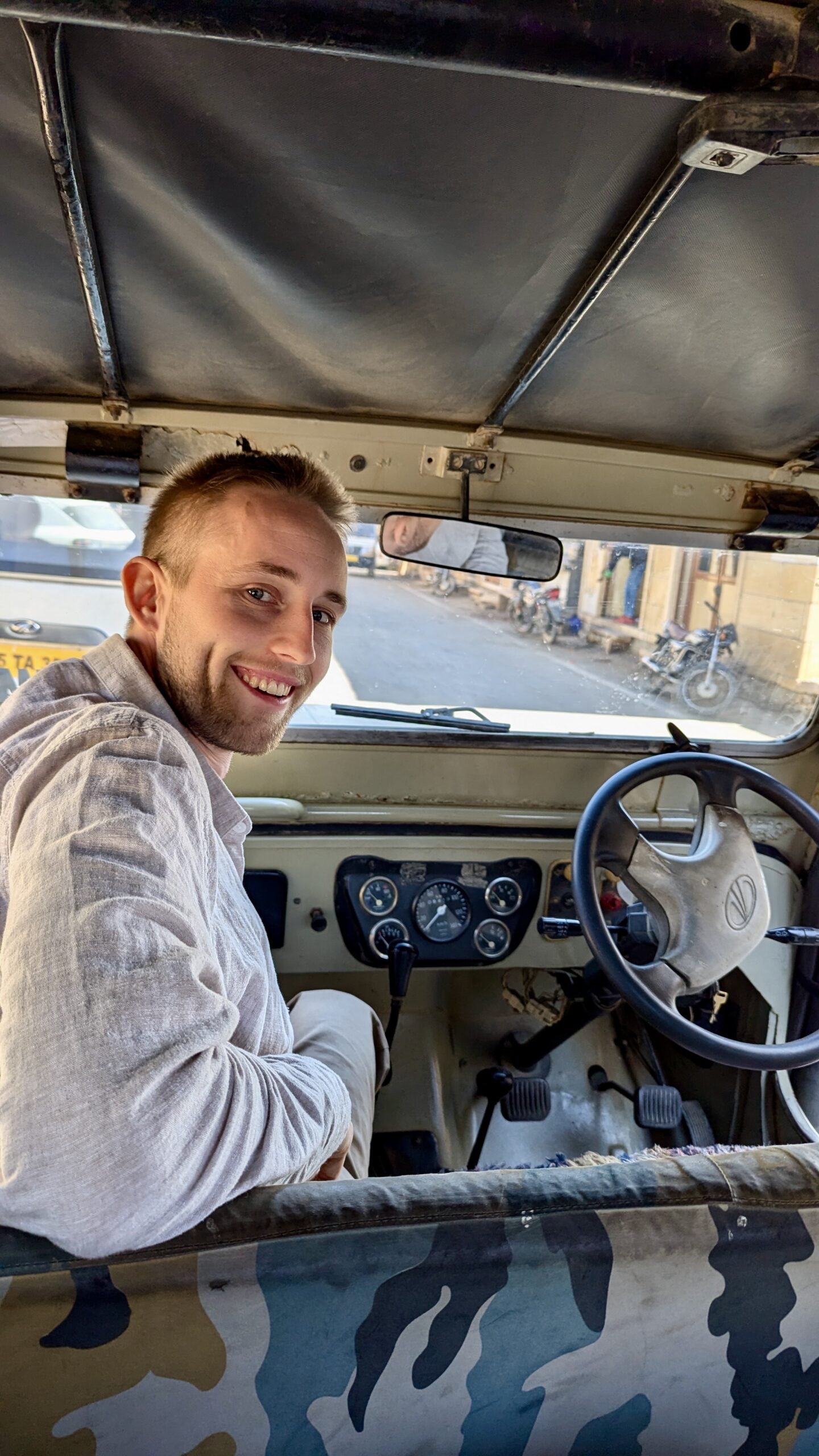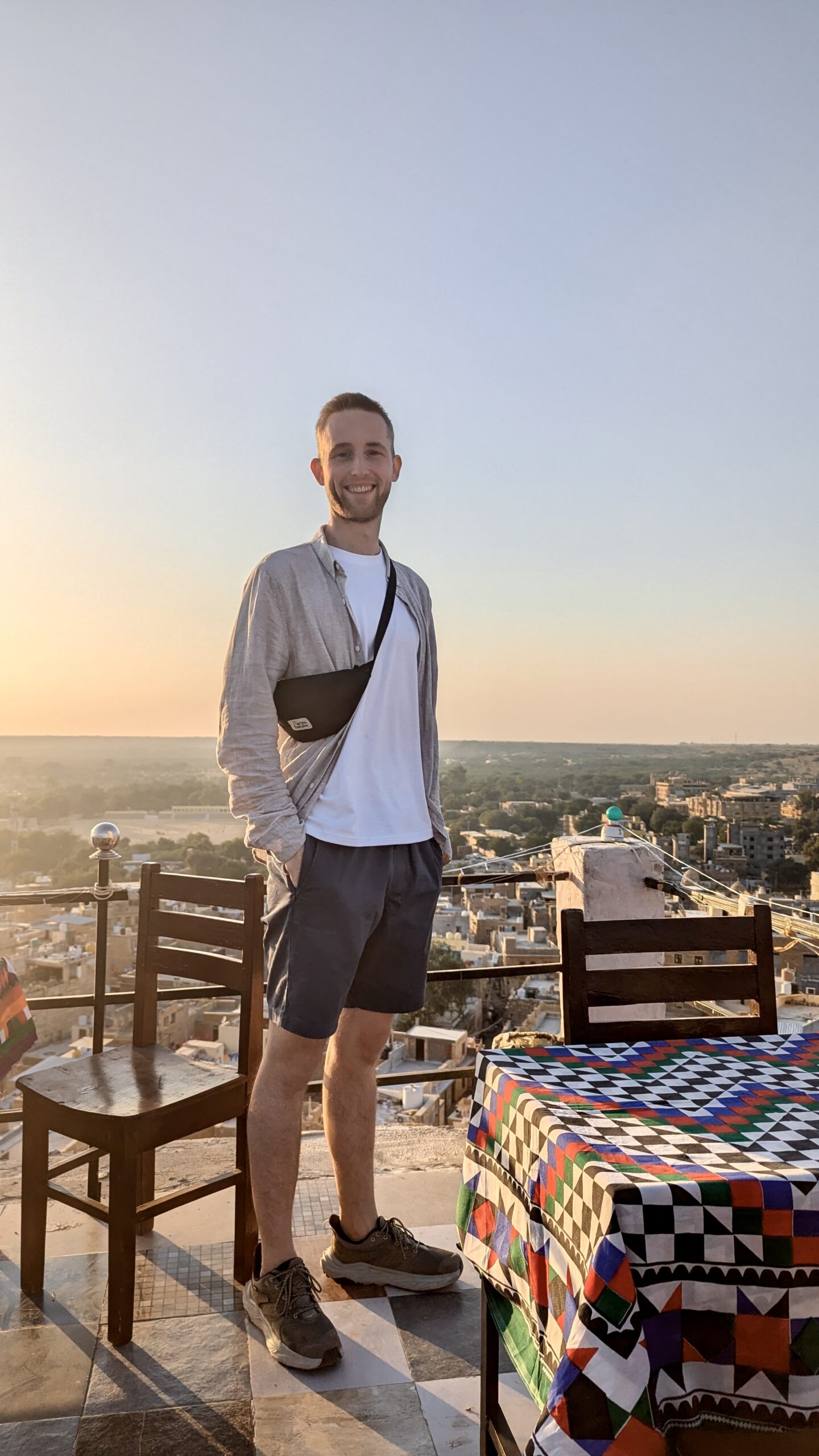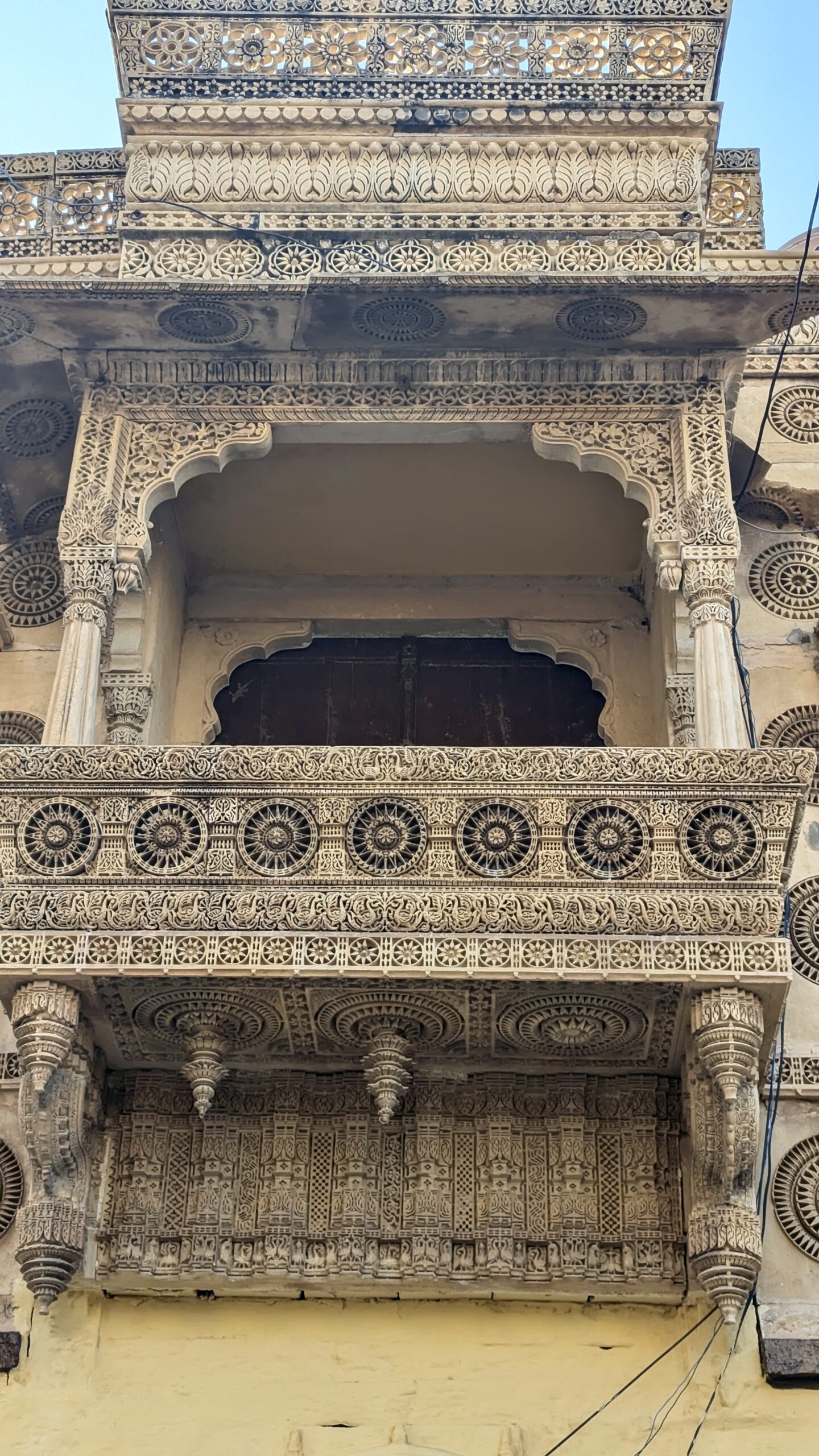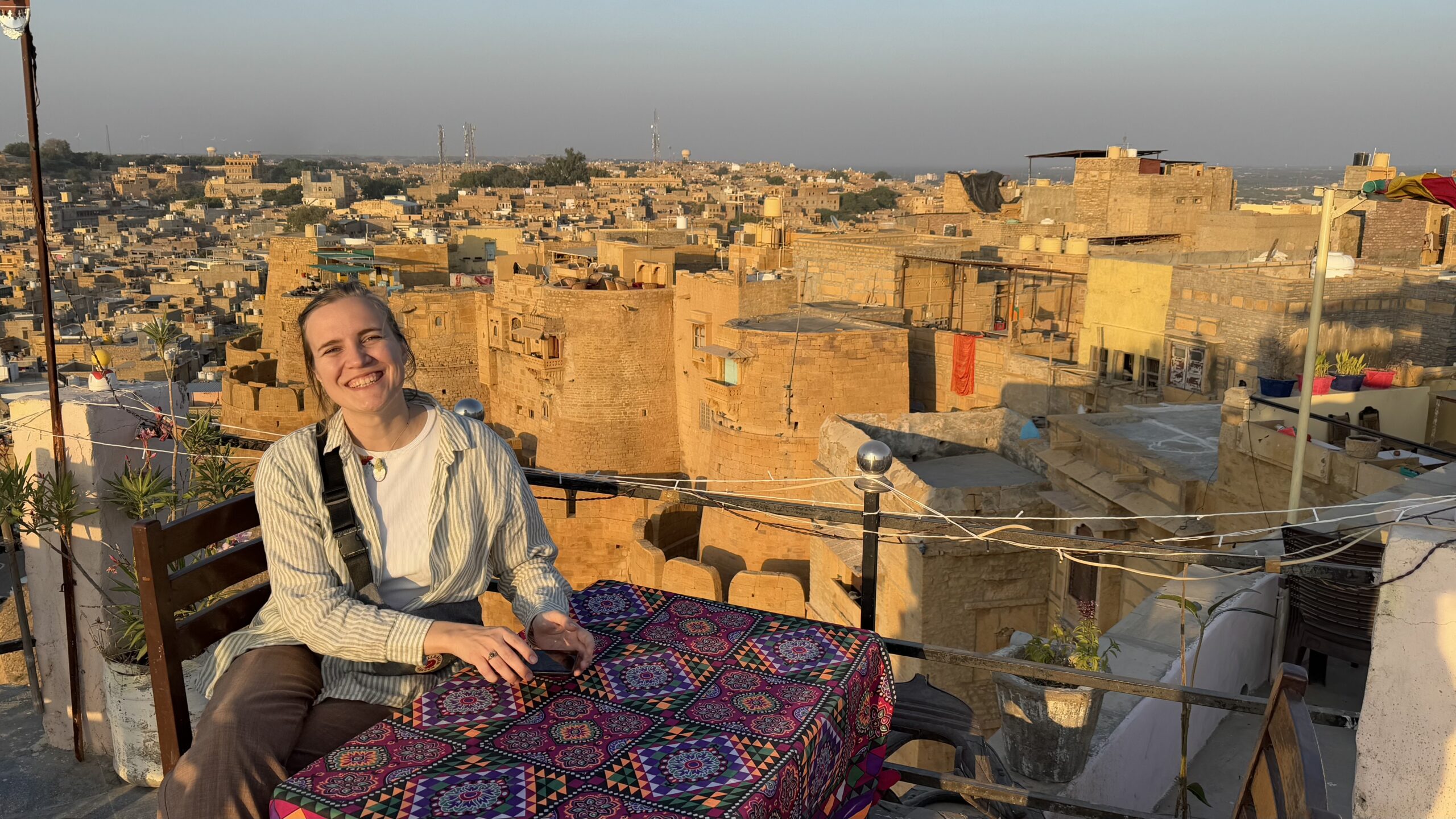 Ein Fenster, wie das, das wir bestaunen durften, hatte damals eine Bauzeit von bis zu zwei Jahren. Heutzutage wird diese Kunst nicht mehr so umgesetzt, was ich sehr schade finde. Man muss sich auch klarmachen: Ein einziger Fehler im Stein hätte das gesamte Gebäude unbrauchbar gemacht. Umso beeindruckender war der Balkon, den wir sahen – vollständig mit detailreichen Steinmetzarbeiten verziert. Ich hoffe, das Bild fängt seine Pracht ein. 😊Nach dem Rundgang genossen wir einige Aussichtspunkte innerhalb des Forts, von denen aus wir die gesamte Festung überblicken konnten: groß, golden, ikonisch. Kein Wunder, dass die Stadt als „Wüstenjuwel“ bekannt ist.Später trafen wir bei einem Spaziergang eine deutsche Berufsschullehrerin namens Gabriele. Sie befindet sich seit September im Sabbatical und reist ein Jahr lang durch Asien. Wir tauschten einige Geschichten aus: Sie hatte unter anderem Kirgistan und Nepal bereist und engagierte sich bei verschiedenen sozialen Projekten. Mit Gabriele verbrachten wir einen entspannten Abend in einem nahegelegenen Restaurant und verabschiedeten uns am nächsten Morgen. Vielleicht kreuzen sich unsere Wege ja in einem anderen Land erneut!Am Morgen des 12. Dezember besuchten wir den Jain-Tempel. Ein Gläubiger des Jainismus führte uns durch den Tempel und erklärte uns vieles über die Religion und ihre Bräuche.