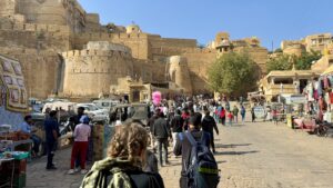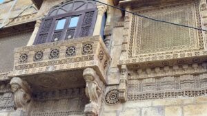 Die Einwohner der Festung waren schon immer sehr reich, was besonders von der hiesigen Jain-Religion geprägt war – eine der ältesten Glaubensrichtungen im Hinduismus.Jaisalmer wird auch die „Goldene Stadt“ genannt. Durch den gelben Stein, aus dem die Festung erbaut wurde, wird sofort klar, warum. Auch innerhalb der Festung erzählen viele Orte von der einstigen Pracht. Überall findet man jahrhundertealte Steinarbeiten, die Türen, Fenster, Balkone und ganze Häuser schmücken. Daneben sieht man jedoch auch viele neuere Steinarbeiten. Der Unterschied ist unübersehbar: Die neuen Werke sind deutlich gröber und weniger filigran. Ashish erklärte uns während eines Rundgangs, dass dies mit den damaligen Bezahlungsumständen der Steinmetze zu tun hatte. Wenn der hiesige Maharadscha mit der Arbeit oder den Verzierungen nicht zufrieden war, gab es für die Arbeiter kein Essen. Entsprechend wurde sehr sorgfältig und kunstvoll gearbeitet.