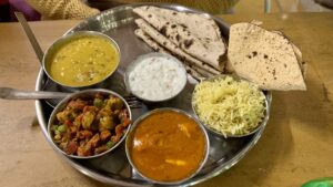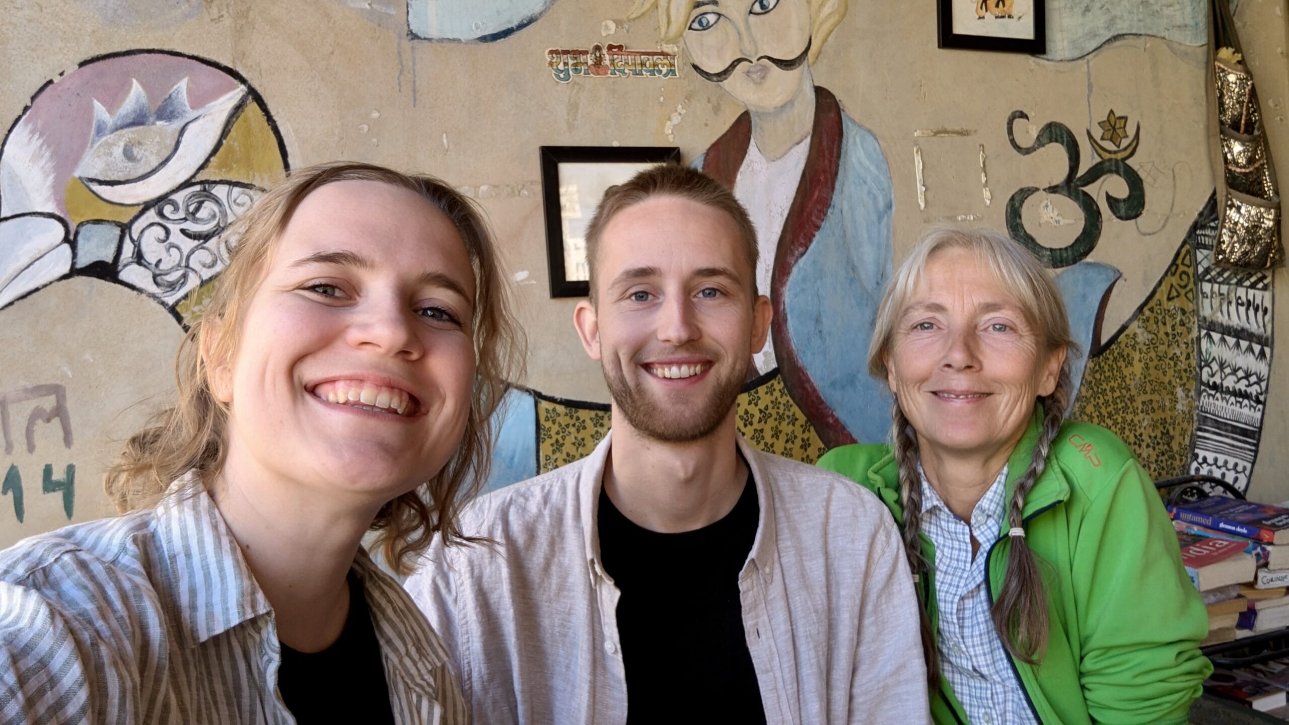Carmen (die Studentin, die wir in Jodhpur kennengelernt hatten) schrieb uns via WhatsApp, ob wir mit ihr essen gehen wollten. Wir trafen uns kurze Zeit später in einem kleinen Restaurant außerhalb der Festungsmauer und aßen gemeinsam verschiedene Currys. Alles war sehr lecker und tat nach dem kargen Frühstück richtig gut. Da sie am nächsten Tag auch von Jaisalmer nach Delhi zurückfliegen würde, beschlossen wir, uns das TukTuk zu teilen, um Geld zu sparen, und verabredeten uns für den nächsten Mittag an unserem Hostel.Sascha und ich gingen zurück zu unserem Hostel, setzten uns auf die Terrasse und tranken mindestens fünf Kannen Ingwer-Zitronen-Honig-Tee, da wir beide leicht verschnupft und Halsschmerzen hatten. Ich glaube, wir haben über die drei Tage hinweg den gesamten Vorrat von Ashish aufgetrunken. Zwischendurch mussten wir eine der Rechnungen fürs Essen im Voraus bezahlen, weil er meinte, er müsste neue Zitronen kaufen. Hoppala! 😄 War aber auch wirklich lecker, der Tee!
