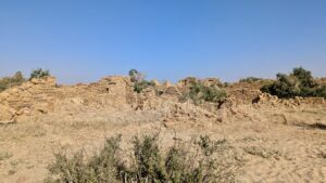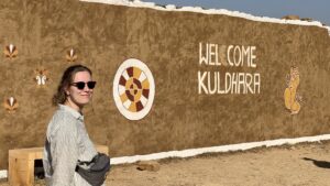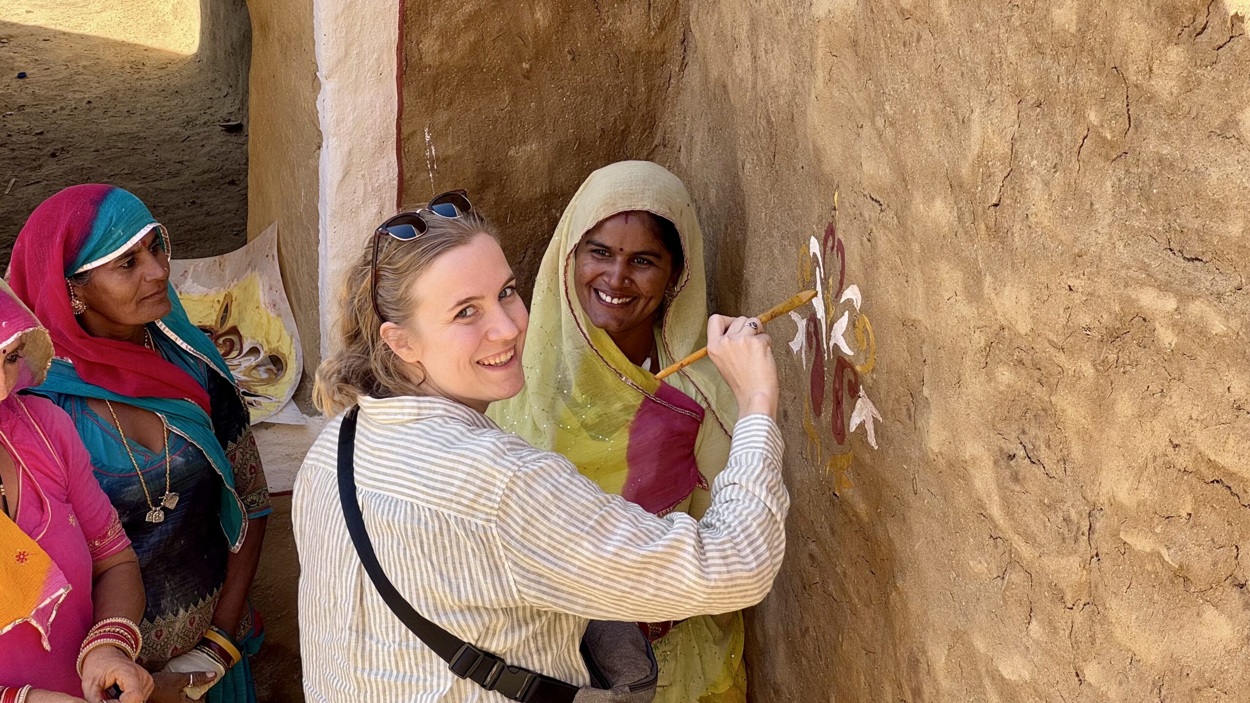 Was am Ende stimmt, kann niemand mehr sagen. Es gibt keine Geschichtsbücher, keine Schriften zu diesem Ort. Keine Malerei an den Wänden der Ruinen, die von irgendetwas zeugen, was vor einigen Jahrhunderten hier passiert ist. Fest steht: Die Menschen ließen alles stehen und liegen und verschwanden einfach. Unsere kleine Reisegruppe tummelte sich ca. 30 Minuten durch die Ruinen. Selbst hier vermüllt der Ort jedoch durch Touristen.Das Archäologiezentrum von Indien kümmert sich mit einer kleinen Eintrittsgebühr und der Hilfe der Wüstenbewohner um den Erhalt der Stadt und baut die Häuser zum Teil wieder auf. Auch damit man nicht nur die schlichten Ruinen sieht, sondern die mehrstöckigen Häuser aus Stein und Holz sowie den Tempel, in dem die Menschen damals gebetet haben.Eine Gruppe Frauen lud mich auch dazu ein, ein bisschen etwas an der Wand nachzumalen. Ich fand das wirklich sehr schön und hielt nur zu gerne den Pinsel, um ein Ornament an der Hauswand nachzumalen, nur um nach wenigen Sekunden nach Geld gebeten zu werden. Das machte es dann wieder etwas kaputt. Sehr schade.
