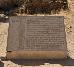 Am frühen Mittag ging es zusammen mit vier weiteren Indern aus Jaipur, Mumbai und Maharadscha mit einem Jeep los (es tut mir schrecklich leid, aber ich habe ausnahmslos alle Namen vergessen, die waren nicht einfach zu merken). 40 km sollte uns dieser von Jaisalmer entfernen.Zuerst ging es nach Kuldhara, einer Stadt, die zum einen aus über 84 kleineren Dörfern bestand, welche über Nacht im 19. Jahrhundert allesamt verlassen wurden. Das Dorf Kuldhara wurde 1291 von den Paliwal Brahmanen gegründet und war eine wohlhabende Gemeinde, dank ihrer Fähigkeit, üppige Ernten im trockenen Wüstengebiet anzubauen. Doch eines Nachts im Jahr 1825 verschwanden alle Dorfbewohner von Kuldhara und den 83 umliegenden Dörfern spurlos. Die offizielle Geschichte lautet, dass es höchstwahrscheinlich große Dürren oder Erdbeben gab, weswegen die hiesigen Menschen in Kuldhara die Stadt aufgaben.Die vier Inder, die uns durch die Ruinen begleiteten, hatten jeder eine andere Folklore zu dem Dorf. Anscheinend ranken sich vielerlei Mythen um diesen Ort. So heißt es bei einem, dass eines Tages ein Mönch in die Stadt kam und von den Stadtbewohnern verspottet wurde, woraufhin er Kuldhara verfluchte und die Menschen nichts mehr ernten konnten und das Wasser sich vergiftete. Daraufhin verließen sie das Dorf. Eine andere Geschichte besagt, dass alle Menschen die Stadt verließen, um ein einziges Mädchen zu retten: Der Legende nach hatte der böse Minister Salim Singh die Tochter des Dorfvorstehers begehrt und erklärte, er würde sie heiraten, mit oder ohne ihre Zustimmung. Er drohte den Dorfbewohnern mit schweren Konsequenzen, wenn sie sich nicht fügten. Anstatt seinen Forderungen nachzugeben, beschloss der Dorfrat, ihre Heimat über Nacht zu verlassen. Bevor sie gingen, verfluchten sie Kuldhara, sodass niemand jemals dort siedeln könnte.