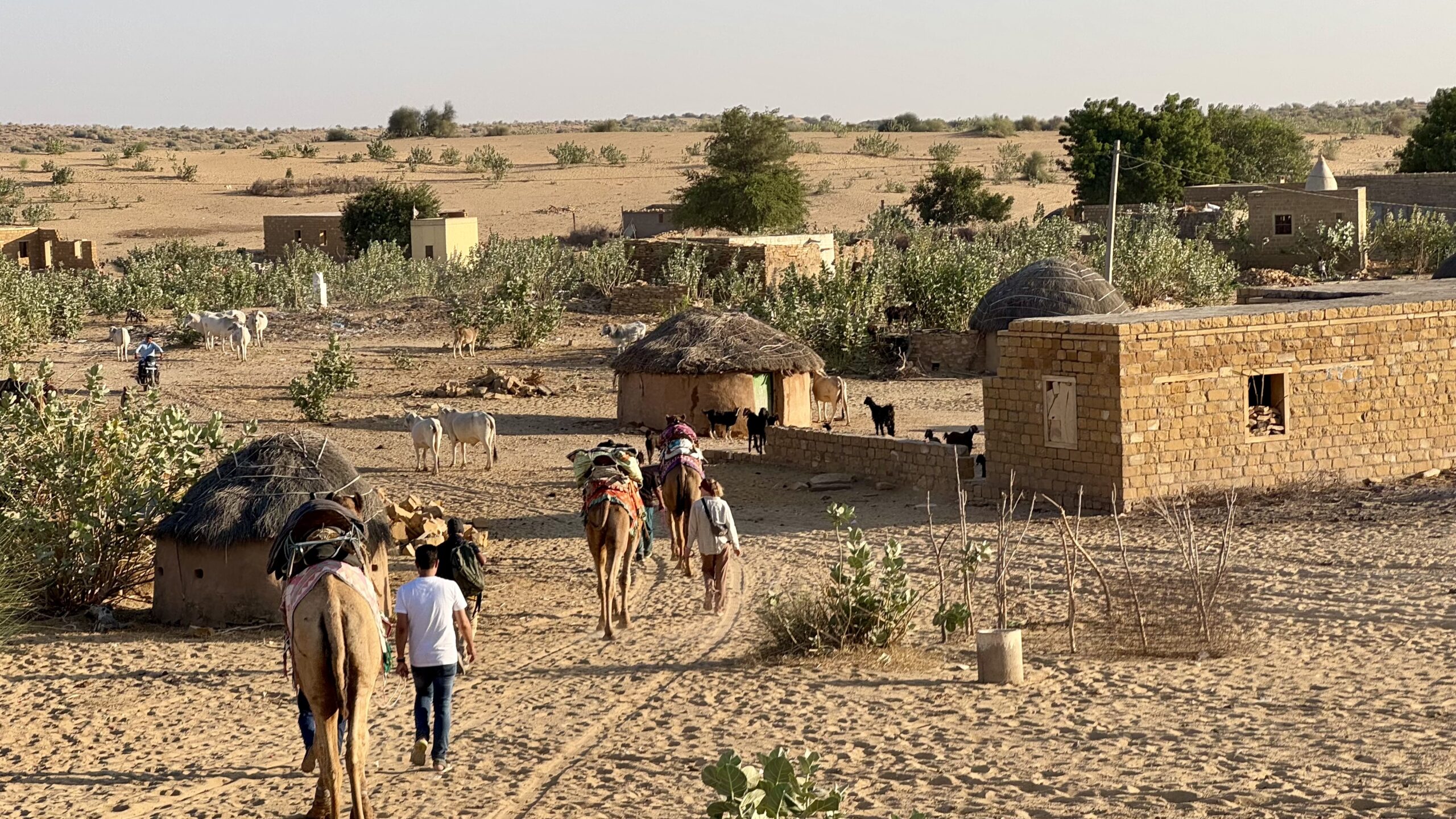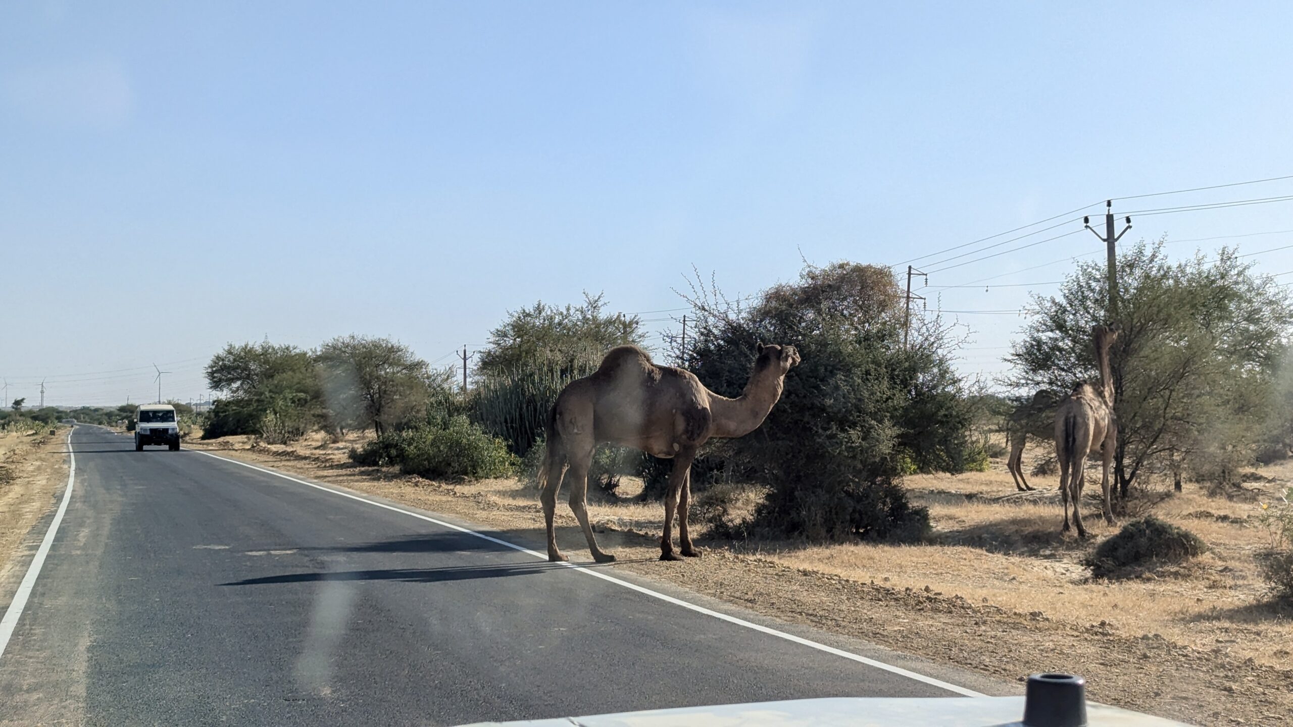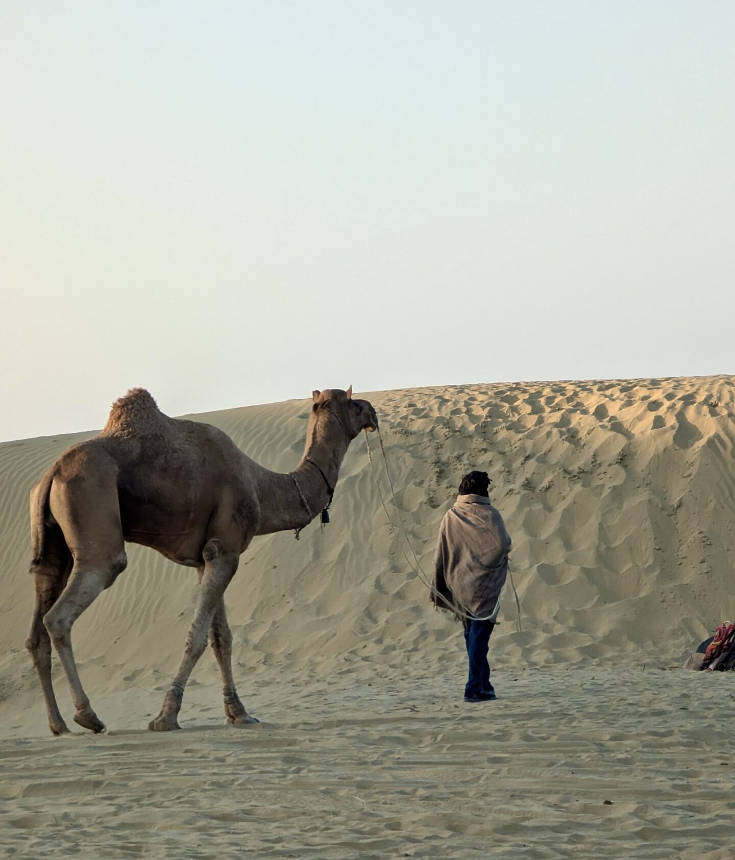 Am Mittag brachen wir zu einer Wüstentour auf. Ashish arbeitet mit Einheimischen zusammen, die Kamel-Touren abseits der großen Touristenrouten anbieten. Wir waren gespannt und ein wenig aufgeregt. Wir wussten nur, dass uns eine Nacht unterm Sternenhimmel, ein Kamelritt und der Besuch einer Geisterstadt erwarteten.