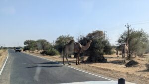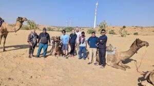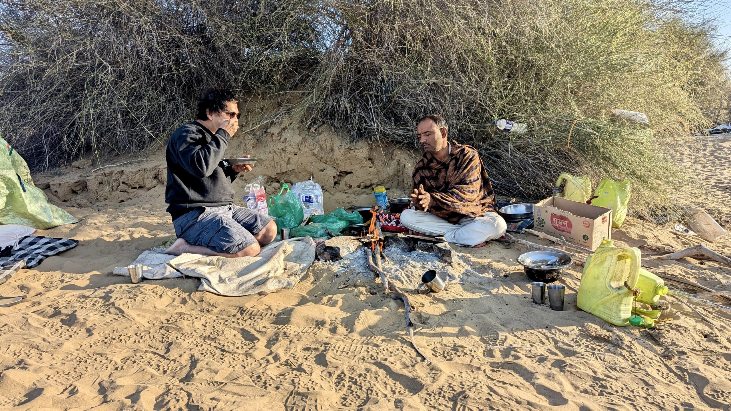 Gegen 7.30 Uhr hatte Akbar bereits wieder ein Feuer entzündet und den ersten Chai aufgesetzt, den er uns ans Bett brachte.Wir können kurz noch erwähnen, dass die Kälte nachts wirklich eisig war. Alles außerhalb der Decken war innerhalb von Sekunden kalt. Da ist nichts mit einem Fuß unter der Decke rausschauen lassen zum Abkühlen. Saschas Nase und Ohren waren durch den heruntergerutschten Merinoschal eiskalt geworden. Ich habe nachgeschaut, die nächtliche Temperatur lag bei 7°C. Wir warteten, bis der Chai uns einigermaßen auch innerlich wieder gewärmt hatte, bevor wir unter den Decken herauskrabbelten und uns ans Feuer gesellten, wo Toasts über dem Feuer getoastet wurden und anschließend mit Marmelade bestrichen werden konnten. Dazu kochte Akbar einen gesüßten Hirsebrei, der uns ein wenig stärkte, und es gab ein paar leckere Kekse. Dann wurde das Lager wieder zusammengeräumt und alles gut verstaut.Vishram hatte in der Zeit, in der wir gefrühstückt hatten, alle Kamele wieder zusammengesucht, was locker über eine Stunde in Anspruch genommen hatte. Er sattelte die Kamele, bevor es auf den Tieren zurück zum Dorf ging, wo der Jeep uns dann wieder nach Jaisalmer bringen sollte.Dort machten wir noch ein gemeinsames Abschiedsfoto, bevor es wieder in die Stadt ging.