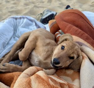 Um ein wenig mehr Dunkelheit in dieser Nacht zu bekommen, zog sich Sascha irgendwann seinen Merinoschal bis hoch über die Augen, und ich legte mir meinen mitgebrachten, neu gekauften Kashmirschal über das Gesicht.Mehrmals in der Nacht wurden wir jedoch von einem streunenden Hund geweckt, der bei uns auftauchte und neugierig an unseren Gesichtern schnüffelte. Gegen 2 Uhr nachts tauchte dann auch noch ein kleiner Welpe auf, der sich an meine Seite kuschelte und bei uns nächtigte.