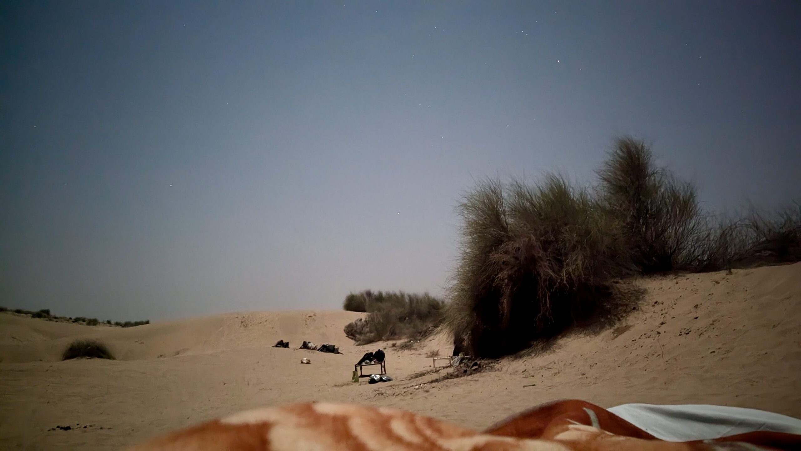 Um 5 Uhr morgens wurde ich dann von Sascha angestoßen und aufgeweckt. Der Mond war untergegangen, und plötzlich erstrahlte der Himmel über uns mit seinen tausenden von Sternen. Zwar war weiterhin keine Milchstraße zu sehen, dafür aber so viele Sterne, wie ich davor noch nie entdeckt hatte. Ich kuschelte mich an Sascha, versuchte noch ein paar Fotos zu machen (funktionierte ja mal so gar nicht, haha) und schlief schließlich wieder ein.  Ja da sind wirklich Sterne auf diesem Bild. Das ist kein Staub auf eurem Bildschirm. 😄Um kurz nach 6 trottete ein klingelndes Kamel dann an uns vorbei (es hatte eine Glocke um seinen Hals), und kurz darauf tauchte wieder einer der größeren Hunde auf, stieß mir mit seiner Schnauze ins Gesicht (ich war gerade wieder eingeschlafen), und ich schreckte dermaßen auf, dass ich kerzengerade auf der Matratze saß. Der Hund nahm das als Einladung, sich hinter mich auf die warme Matratze zu legen und Sascha zu beschnuppern, der auch aus dem Schlaf hochfuhr.