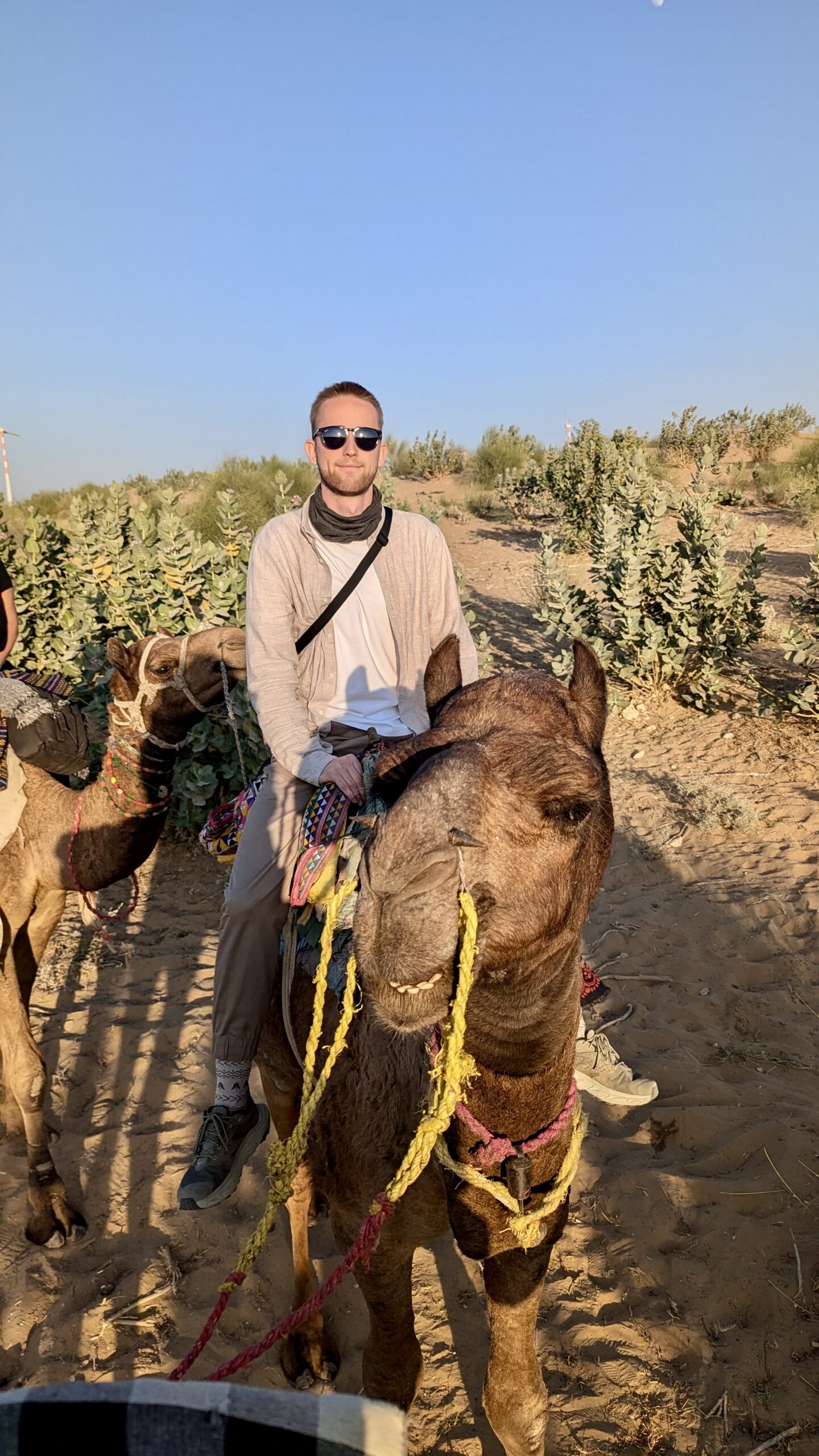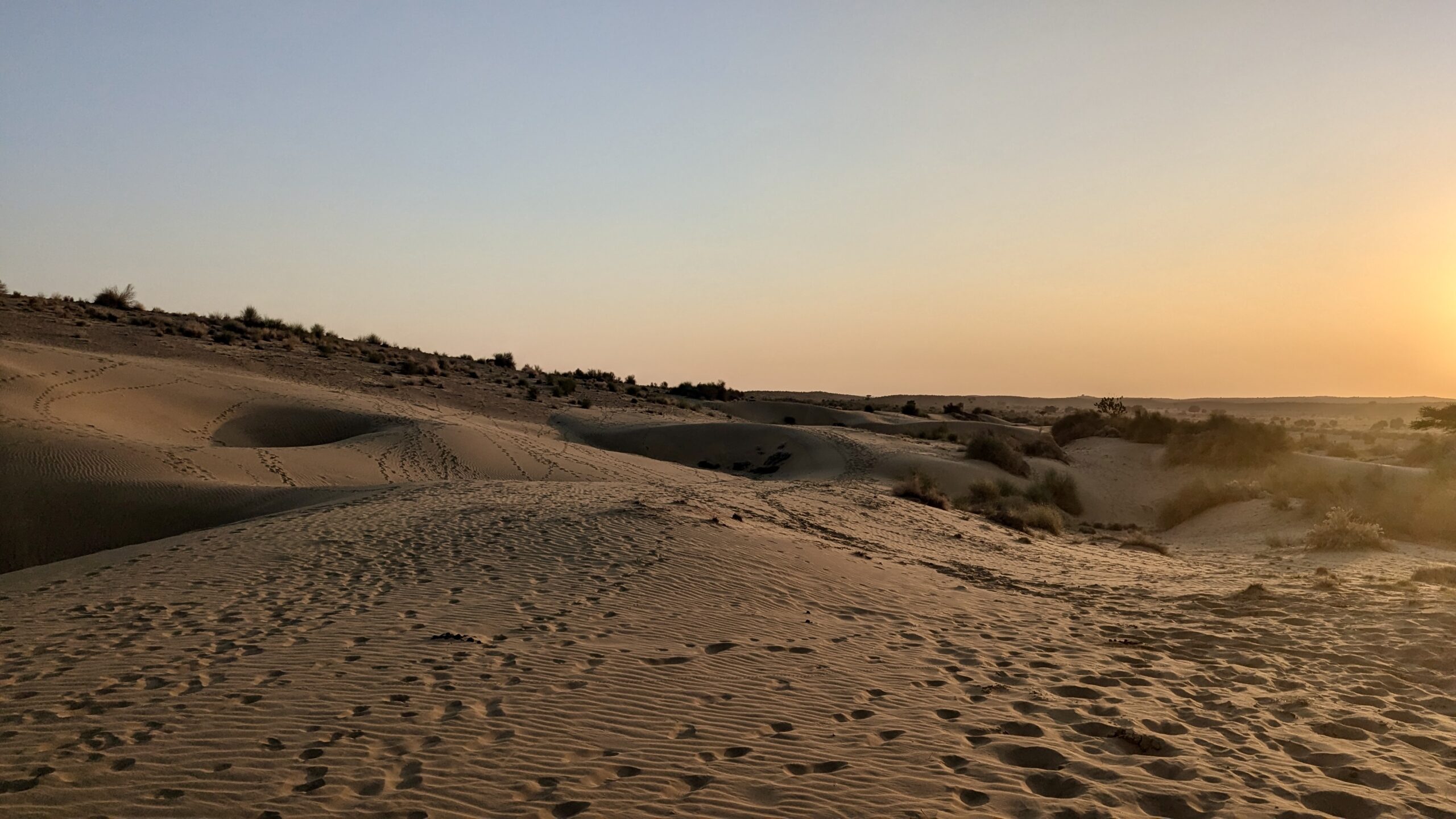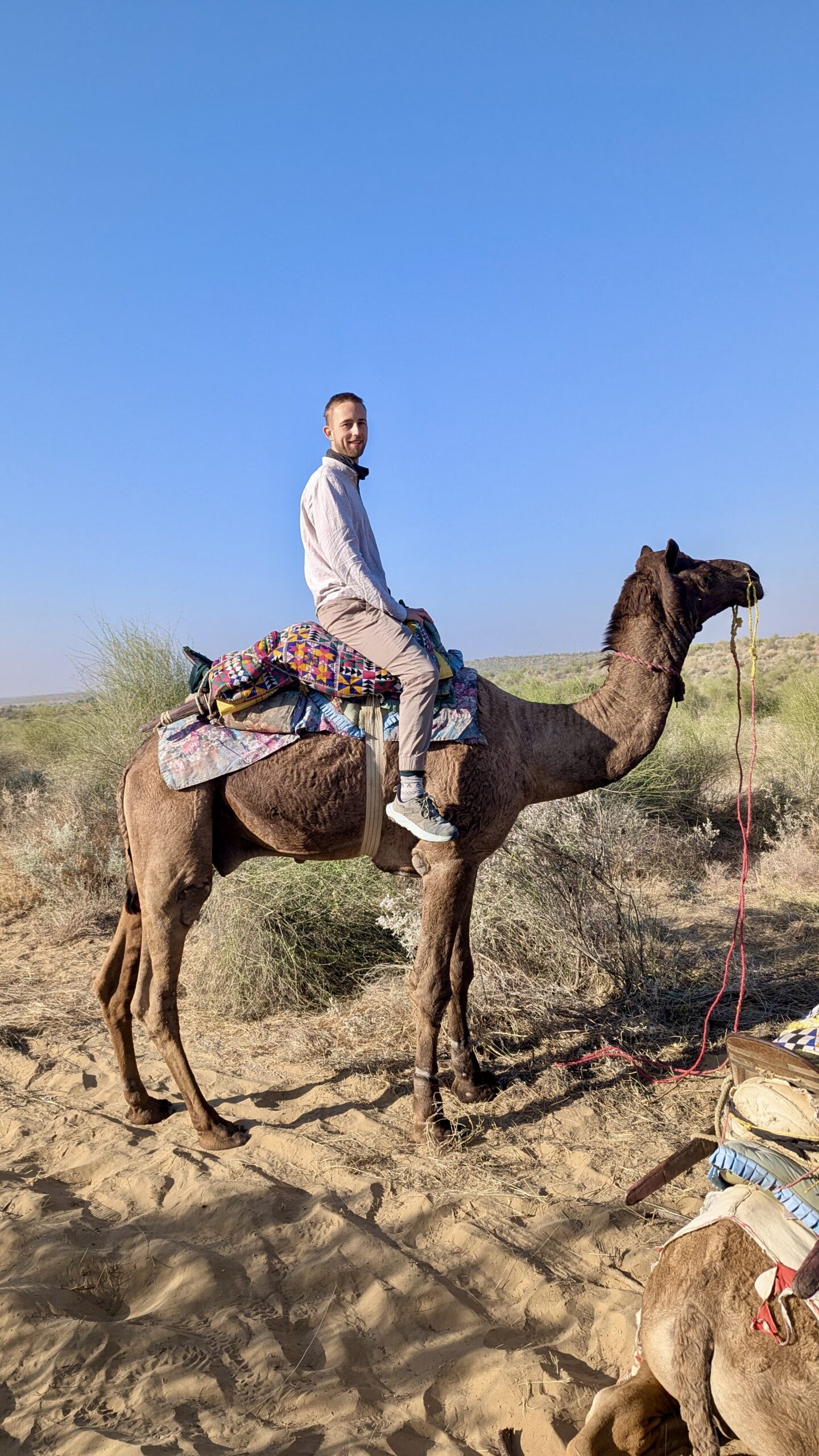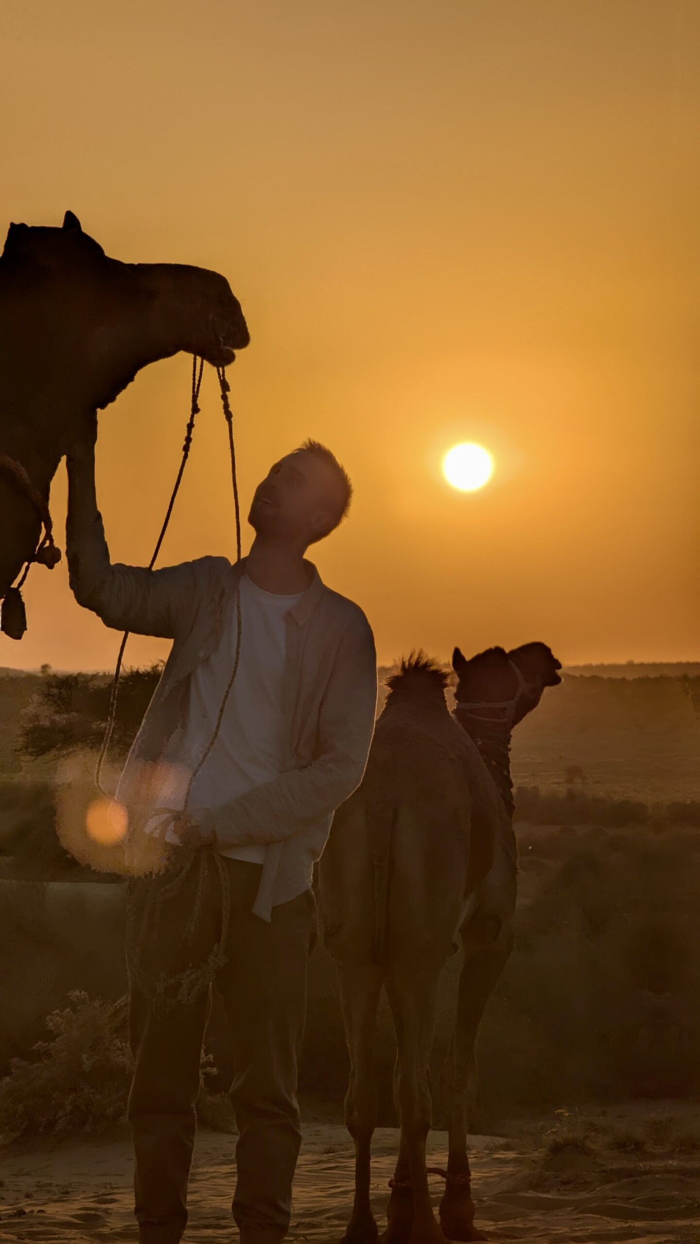Einige hundert Meter weiter hielt unser Jeep dann an, und wir wurden von unseren beiden Kamelführern Akbar und Vishram herzlich willkommen geheißen. Sie hatten bereits auf uns gemeinsam mit einer Italienerin gewartet, die bereits mit den beiden zwei Tage in der Wüste unterwegs gewesen war und so noch einiges mehr gesehen hatte.Innerhalb der nächsten 10 Minuten wurden uns die Kamele (eigentlich Dromedare) zugeteilt und wir setzten uns in die Stoffsättel. Ich kann nur sagen, das ist was komplett anderes, als auf einem Pferd zu sitzen. Deine Beine sind in keinen Steigbügeln, sondern hängen einfach an dem Kamel herunter. Sascha und ich stellten schnell fest, wie unsportlich wir sind, weil, sobald wir versuchten, unsere Beine an den Körper der Kamele anzudrücken, unsere Muskeln schon zitterten. 😄 Das Aufstehen der Tiere ist auch etwas Besonderes: Erst kippt man nach vorne, weil die Hinterbeine sich zuerst aufrichten, dann kippt man nach hinten, weil die Vorderbeine sich aufstellen, und plötzlich ist man 2,3 m über der Erde und sitzt auf dem unbequemsten Tierrücken, den man sich wahrscheinlich vorstellen kann. Nach 10 Minuten stellten Sascha und ich unabhängig voneinander fest: „Kann man mal gemacht haben, müssen wir jetzt aber auch nicht nochmal machen.“Akbar führte unsere Gruppe an, und wir machten uns auf zur ersten Wasserquelle, wo die Kamele nochmals trinken sollten für den kommenden Tag, um uns anschließend in ein Dorf zu führen, in dem die Leute noch wirklich von Viehzucht leben. Große Lehmhütten und Steinhäuser erwarteten uns dort, Kinder, die aufgeregt zu uns rannten und mal nicht um Geld bettelten, sondern es einfach nur toll fanden, uns zu sehen. Der Dorfvorsteher kochte für uns allen einen leckeren Masala Chai (Gewürztee) mit Kamelmilch, und Sascha und ich schauten uns in der Gegend ein wenig um. Wie wir erfuhren, kümmern sich hier die Frauen um die Tiere, während die Männer am Morgen mit der frisch gezapften Milch von Kühen, Kamelen und Ziegen in die Stadt fahren, alles verkaufen und anschließend mit dem Geld wieder etwas Nahrung einkaufen und zurück in die Wüste fahren. Auch hier gibt es natürlich Autos, jedoch habe ich keinen Strommasten in der Nähe gesehen. Hier lebt man also wirklich noch etwas ursprünglicher. Einen Chai später führten wir unsere Kamele einmal durch das Dorf, bevor wir wieder aufsetzten und zu unserem Nachtlagerplatz geführt wurden, mitten in den sandigen Dünen der Thar-Wüste.Der Sonnenuntergang hier war gigantisch, wie ihr bestimmt am Titelbild schon gesehen habt. 😊 Die Kamele wurden abgesattelt, wir durften noch ein paar Fotos mit ihnen machen, und dann wurden sie einfach freigelassen. Ein paar ließen sich an Ort und Stelle nieder, einige sprinteten beinahe schon los und entfernten sich ein gutes Stück von der Gruppe.Unser Jeepführer, der nicht mit den Kamelen mitgeritten war, war vorgefahren und hatte bereits angefangen, ein Feuer zu machen und den ersten Chai vorzubereiten, mit dem er unsere siebenköpfige Gruppe dann empfing. Wir alle machten es uns am Feuer bequem, unterhielten uns über alles Mögliche, und Akbar kümmerte sich um das Essen. Es wurde Gemüse geschnitten, in Teig gewälzt und in Öl leicht frittiert und uns als Vorspeise serviert, bevor es ans Dal, Reis und Gemüsecurry ging. Und alles schmeckte ausnahmslos köstlich. Mit Rücksicht auf unseren europäischen Gaumen wurde die Chilipaste separat zubereitet und unter den Indern auf den Tellern verteilt. Der Inder aus Jaipur gab mir auch ein wenig davon auf den Teller und meinte, dies sei nicht so scharf, ich sollte es einfach unter die Linsen mischen und mit dem Reis zusammen essen, das würde richtig gut schmecken.
