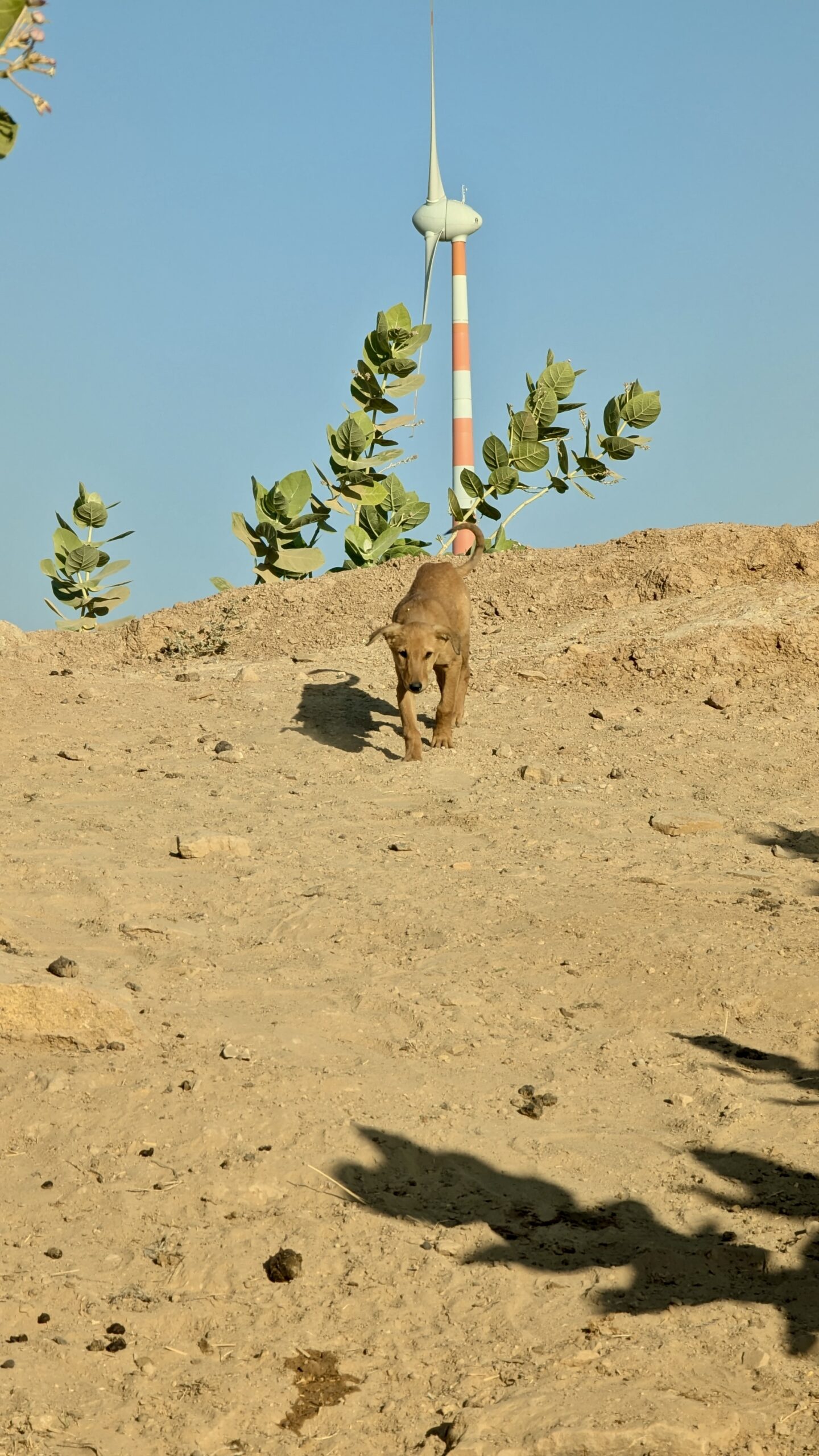 Für uns ging es im Jeep dann weiter. Nach wenigen Minuten bogen wir von der befestigten Straße ab und ratterten in dem alten Auto über Schotterpisten und Sandwege. Ich fühlte mich beinahe wie in einem Indiana-Jones-Filmsetting. Der ruckelnde Wagen, keine Türen, Sascha und ich mit dem Fahrer auf der Vorderbank, Staub und Sand umwirbelten uns, und mit einem Mal kreuzten wilde Kamele unseren Weg und überquerten im gemütlichsten Tempo der Welt die Sandpiste vor uns. Ich war hellauf begeistert. Auch wenn ich mir eine Wüste bei weitem nicht so buschig vorgestellt hatte, wie es hier der Fall war. Trotzdem erkannte man, dass die Dorfbewohner hier dem Boden alles abzugewinnen versuchten, was möglich war. Wir sahen plötzlich einen kleinen Acker vor uns, der frisch umgepflügt war. Leider versäumten wir zu fragen, was die Leute aus der Gegend dem Boden abgewinnen können, wenn es doch so trocken hier ist.Hinter einem kleinen Hügelpiste erblickte ich plötzlich etwas, mit dem ich am wenigsten gerechnet hatte: Windräder. Die Wüstenlandschaft war von so vielen Windrädern durchbrochen, dass man sagen könnte: Hier stehen definitiv mehr als Bayern jemals besitzen wird.