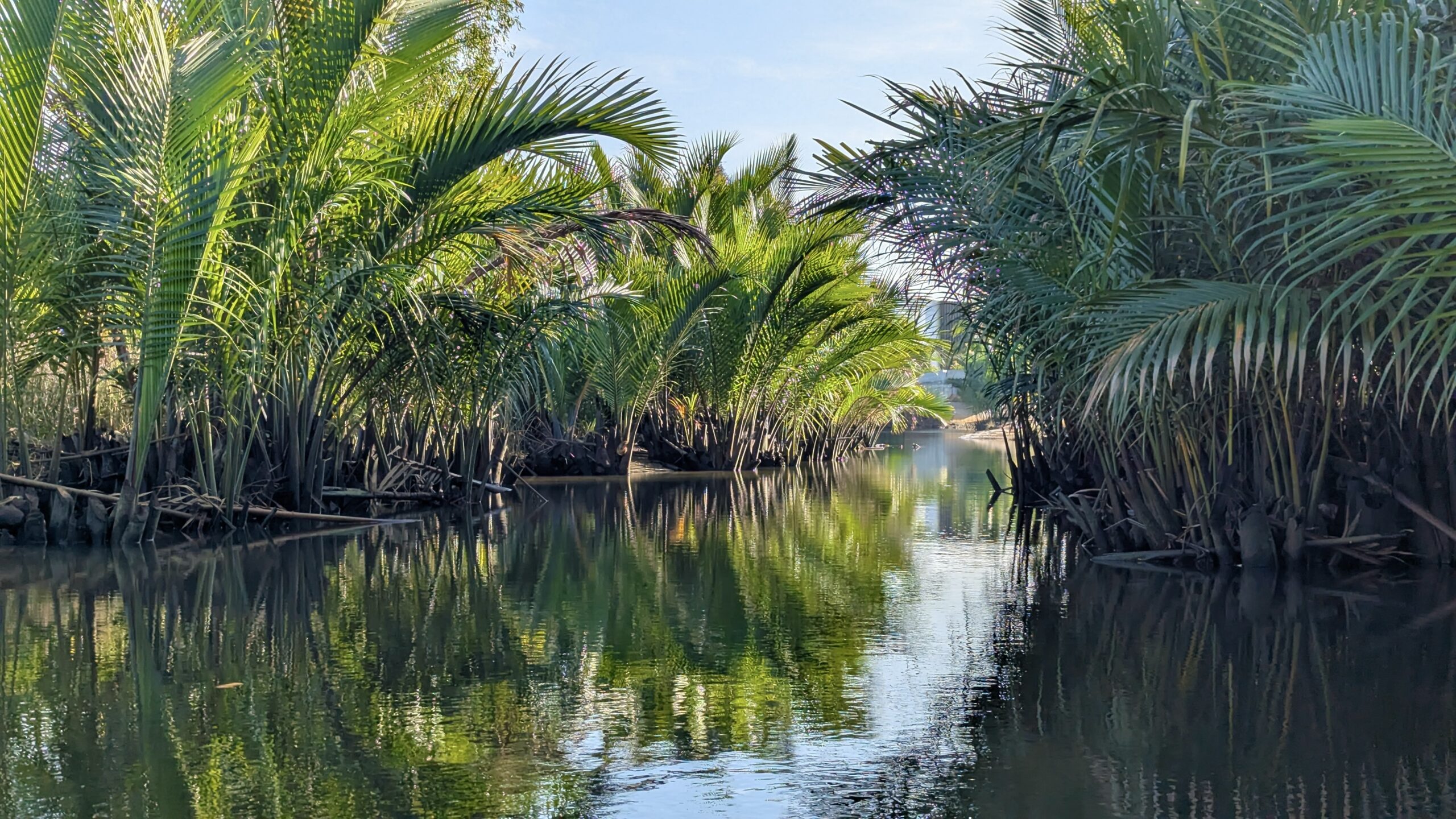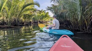 Mit dem Roller fuhren wir die knapp 40 Kilometer, die wir im Park zurückgelegt hatten, zurück zum Hotel und legten dort eine kurze Verschnaufpause ein, bevor es zu unserer geplanten Kajaktour auf dem Tuek-Chhu-Fluss ging. Dort befindet sich der sogenannte Green Cathedral Loop – eine etwa drei Kilometer lange Rundtour durch üppiges, grünes Pflanzendickicht entlang des Flusses.
