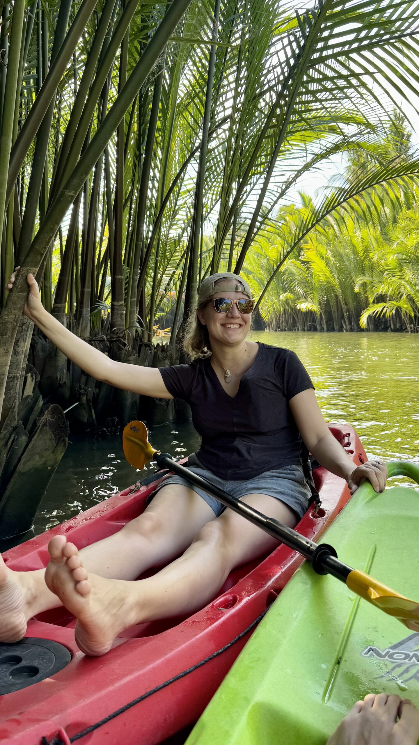 Jeder von uns schnappte sich ein Kajak und machte sich daran, sich durch den Fluss zu kämpfen. Bei Sascha klappte das deutlich besser als bei mir. Ich sage euch, mein Kajak hatte eine Fehlfunktion oder so – so oft, wie ich mich drehte oder in irgendwelche Bambusbüsche und Stechpalmen fuhr … Das hatte ganz sicher nichts mit der Fahrerin zu tun!!