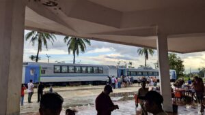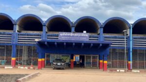 Mit der Fähre fuhren wir von Koh Rong Sanloem nach Sihanoukville. Da Sascha keine Lust hatte, mit Taxi- oder Tuk-Tuk-Fahrern zu verhandeln (Beim Transfer vom Flughafen zum Hafen wurden wir erneut abgezockt. Da es dort keinen Bus gibt, ist man auf Taxis angewiesen, und die Fahrer verlangen stolze 20 Dollar für eine Fahrt, die eigentlich nur 5 Dollar kosten sollte.) marschierten wir bei brütender Hitze eine halbe Stunde durch den Ort bis zum Bahnhof. Von dort aus sollte unser Zug nach Kampot abfahren. Der Bahnhof hier sieht auch irgendwie rudimentär, lustig aus.
