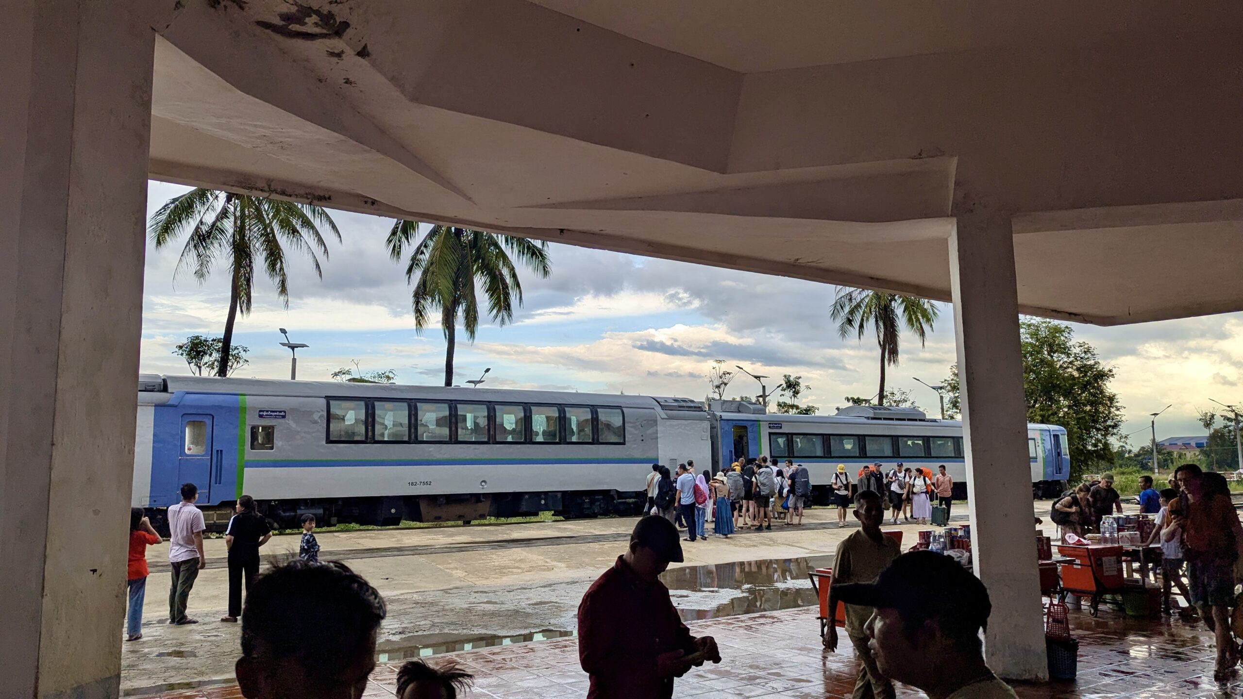 Deutsche Pünktlichkeit lässt grüßen: Wir waren satte 1,5 Stunden zu früh am Bahnhof. Keine Sorge, es war praktisch unmöglich, in den falschen Zug einzusteigen – es fuhr nämlich genau eine einzige Bahn pro Tag. Diese führte von Sihanoukville nach Phnom Penh und machte einen Stopp in Kampot. Also wirklich idiotensicher. 😁