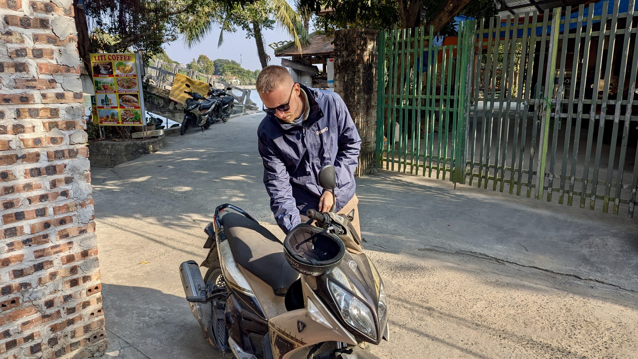 Die Pagode konnten wir schon von weitem sehen. Während wir uns näherten, veränderte sich die Landschaft um uns herum: Die grünen, sanften Hügel wichen zunehmend trockenerem, braunen Terrain, bis wir schließlich auf einem riesigen, leeren Parkplatz landeten. Die schiere Größe war komisch – allein die Fahrt mit dem Roller vom Eingang des Parkplatzes bis zum vorgesehenen Stellplatz für Roller dauerte gut fünf Minuten. Vielleicht ein erstes Warnsignal?
