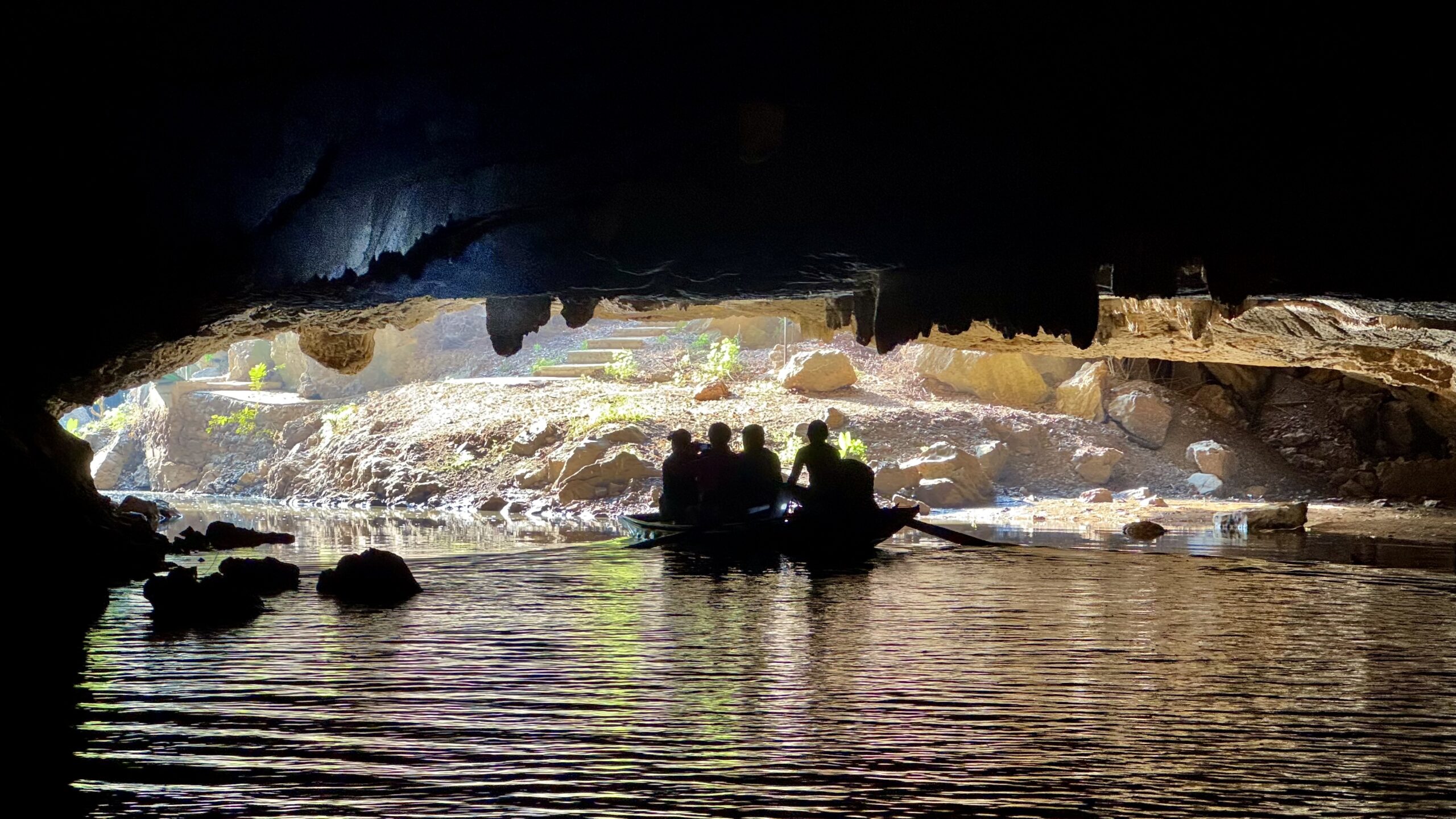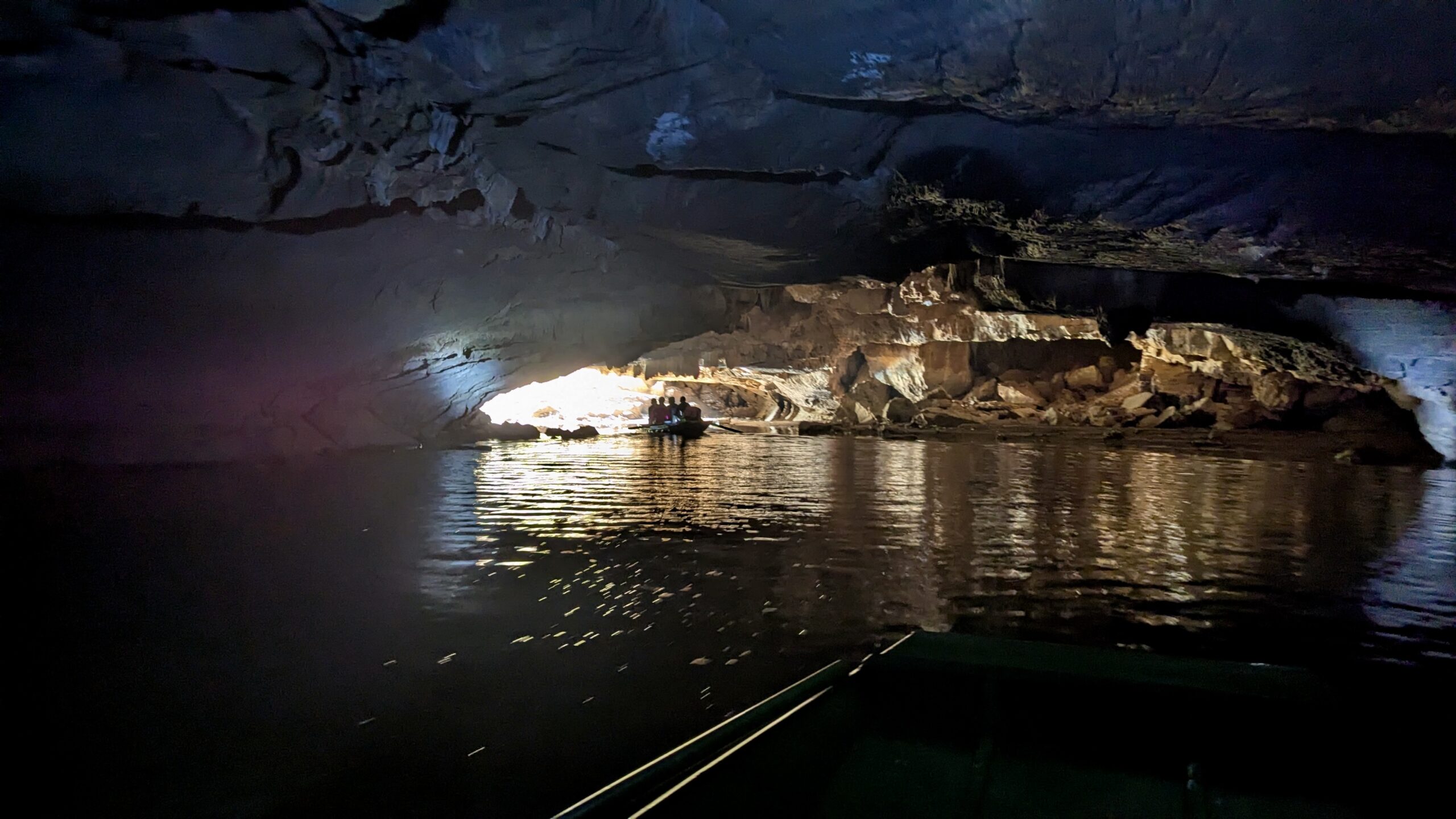 Wir starteten mit der Bootsfahrt und waren ziemlich überrascht, als unser Ruderer hinter uns plötzlich seine Beine (im wahrsten Sinne des Wortes) in die Hand nahm und anfing, mit seinen Füßen zu rudern! Gekonnt manövrierte er uns durch die Höhle, zeigte uns einen Felsen, der mit etwas Fantasie einem Buddha ähnelte, und wir mussten uns mehr als einmal tief ducken, um nicht an den tiefhängenden Stalaktiten anzustoßen.