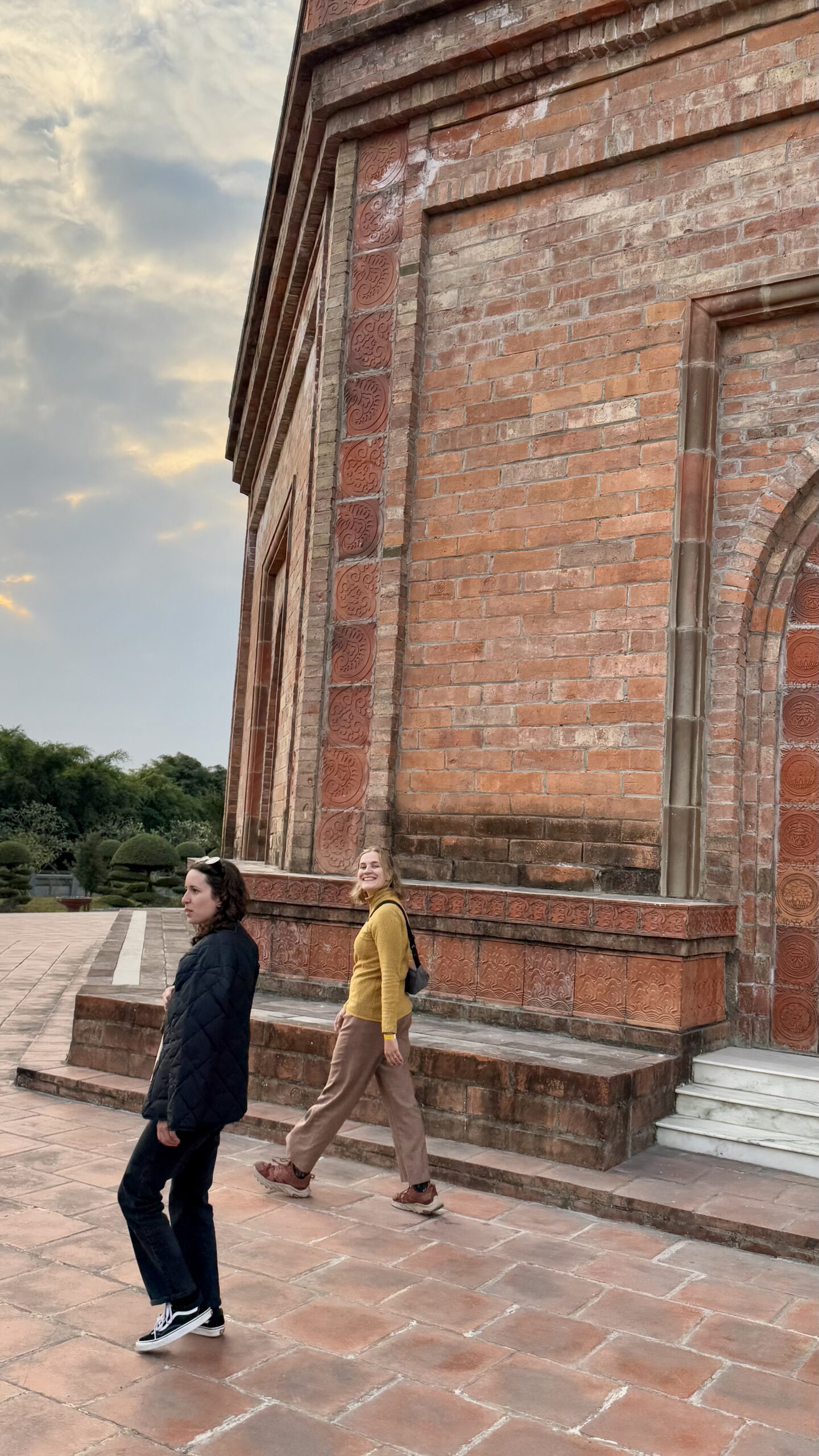 Kurz darauf saßen wir gemeinsam mit Jordan und Patrice in einem kleinen Elektrobus. Die Fahrt führte uns etwa zehn Minuten durch ein riesiges Tor, hinter dem sich der erste Tempel offenbarte. Unser Fahrer hielt abrupt an – und ließ uns wortlos aussteigen. Wir warfen uns verwirrte Blicke zu, doch da wir nun einmal hier waren, umrundeten wir einen kleinen Brunnen und betraten den Tempel. Dieser erstreckte sich nach links und rechts in lange, weitläufige Gänge.