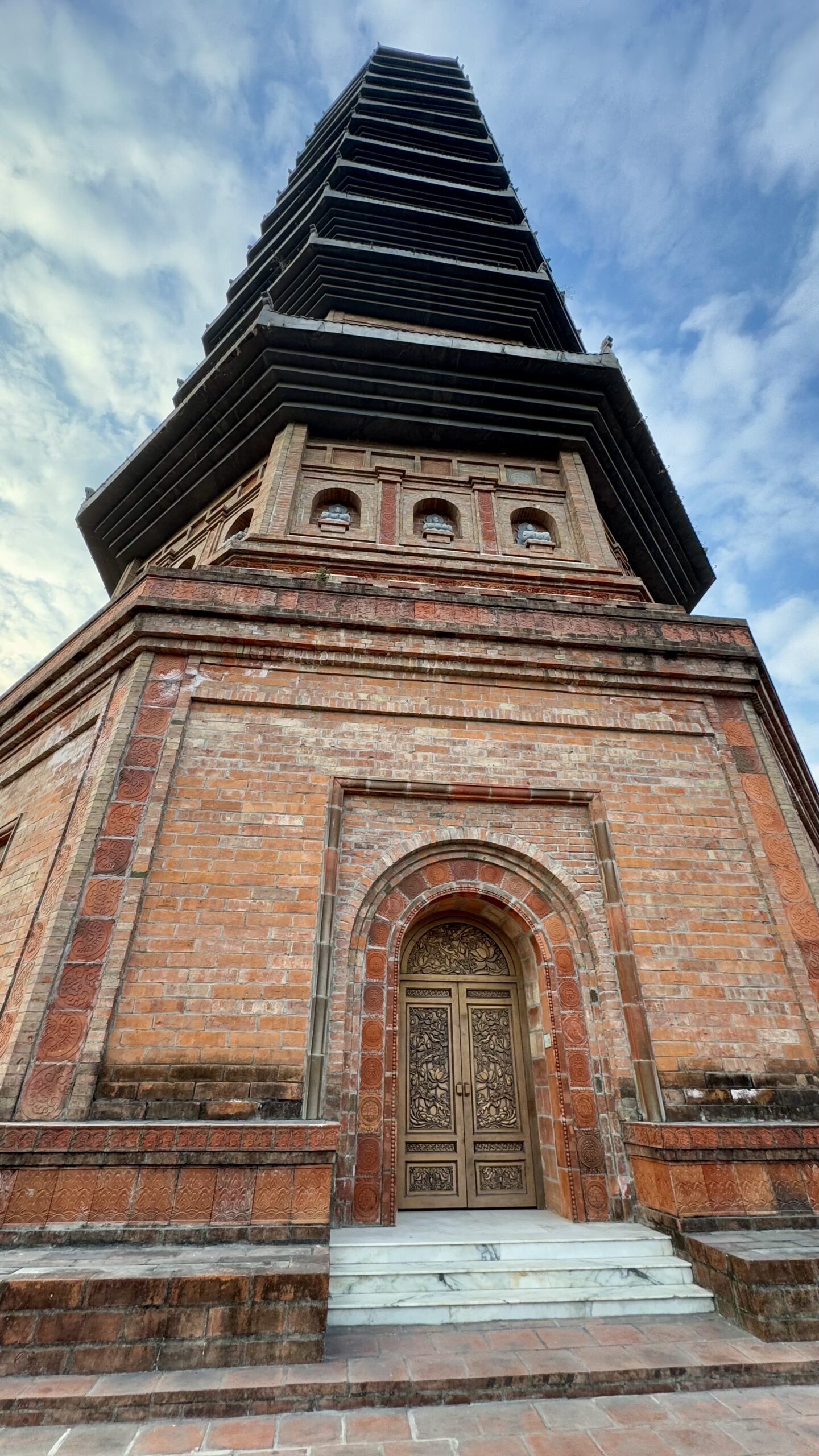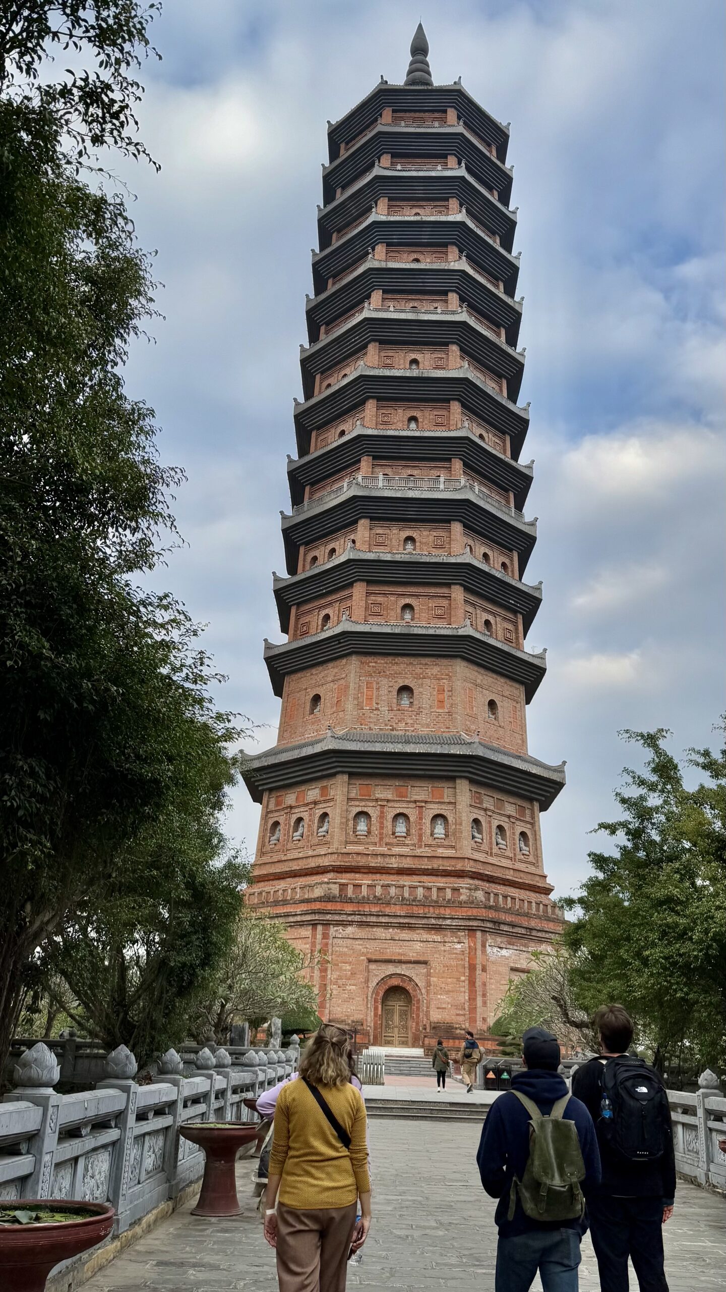 Wieder zu acht liefen wir zurück zum ursprünglichen Absetzpunkt und machten uns endlich auf den Weg zur Pagode, wegen der wir eigentlich hierhergekommen waren. Majestätisch erhob sie sich vor uns, ragte über 14 Stockwerke in die Höhe und versprach einen atemberaubenden Panoramablick.