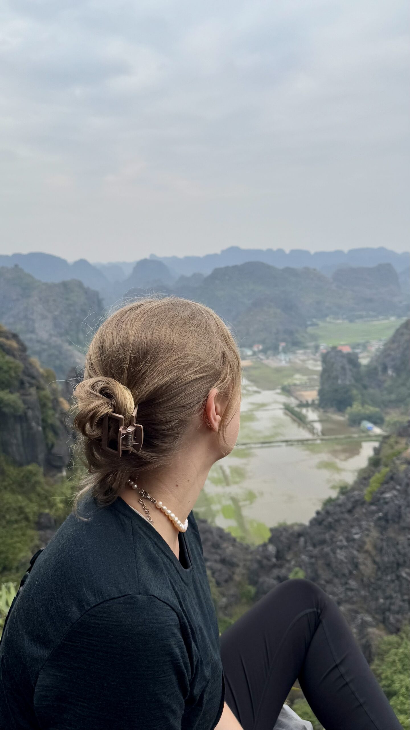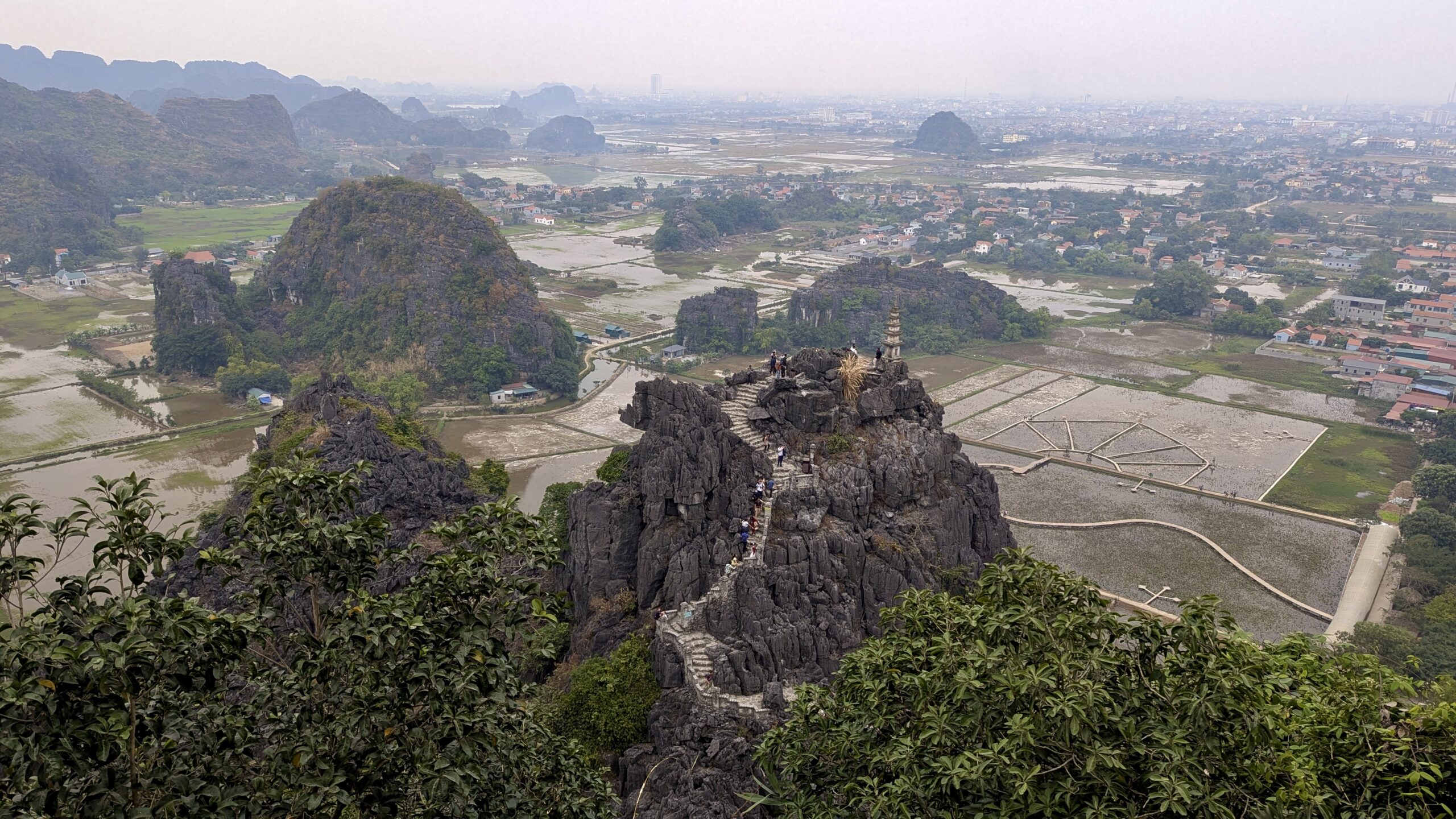 Dort oben erwartete uns jedoch ein beeindruckendes Panorama auf den Ngo Dong-Fluss und die umliegenden Reisfelder (die leider aktuell nicht grün sind). Trotzdem war es den Aufstieg alle mal wert. Wir genossen die Aussicht bei lauen Temperaturen und bewölkten Himmel.