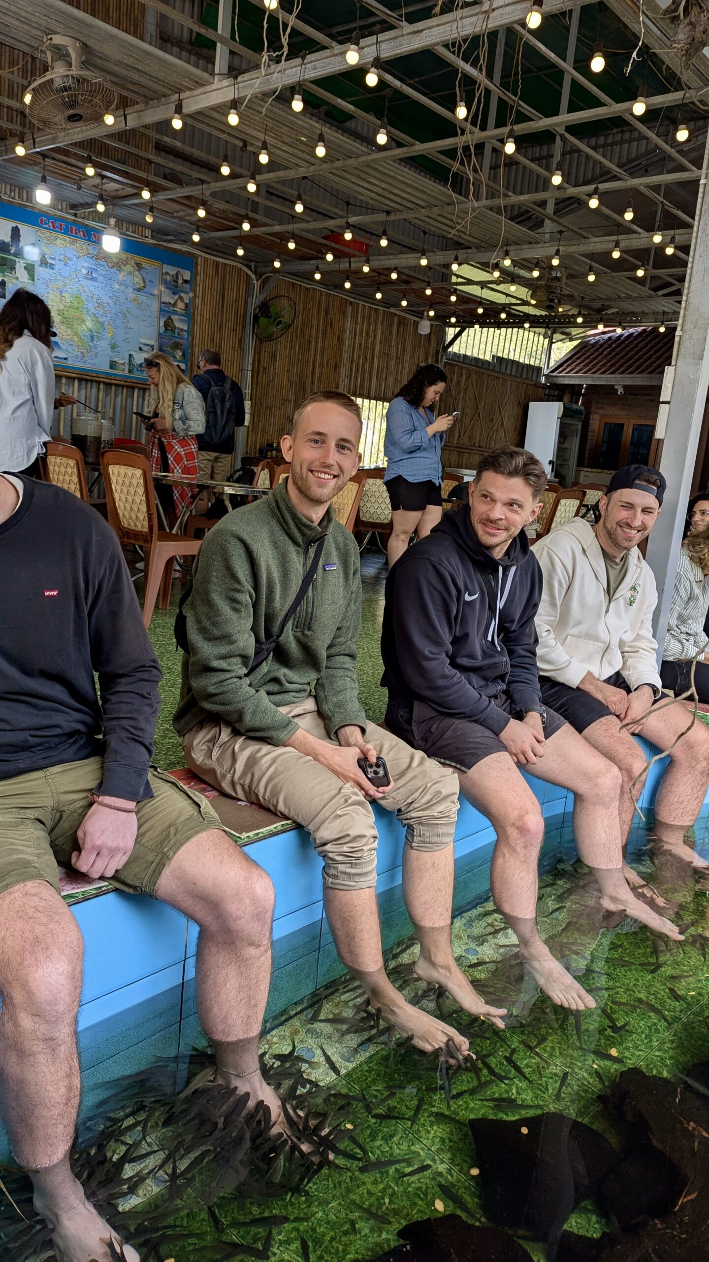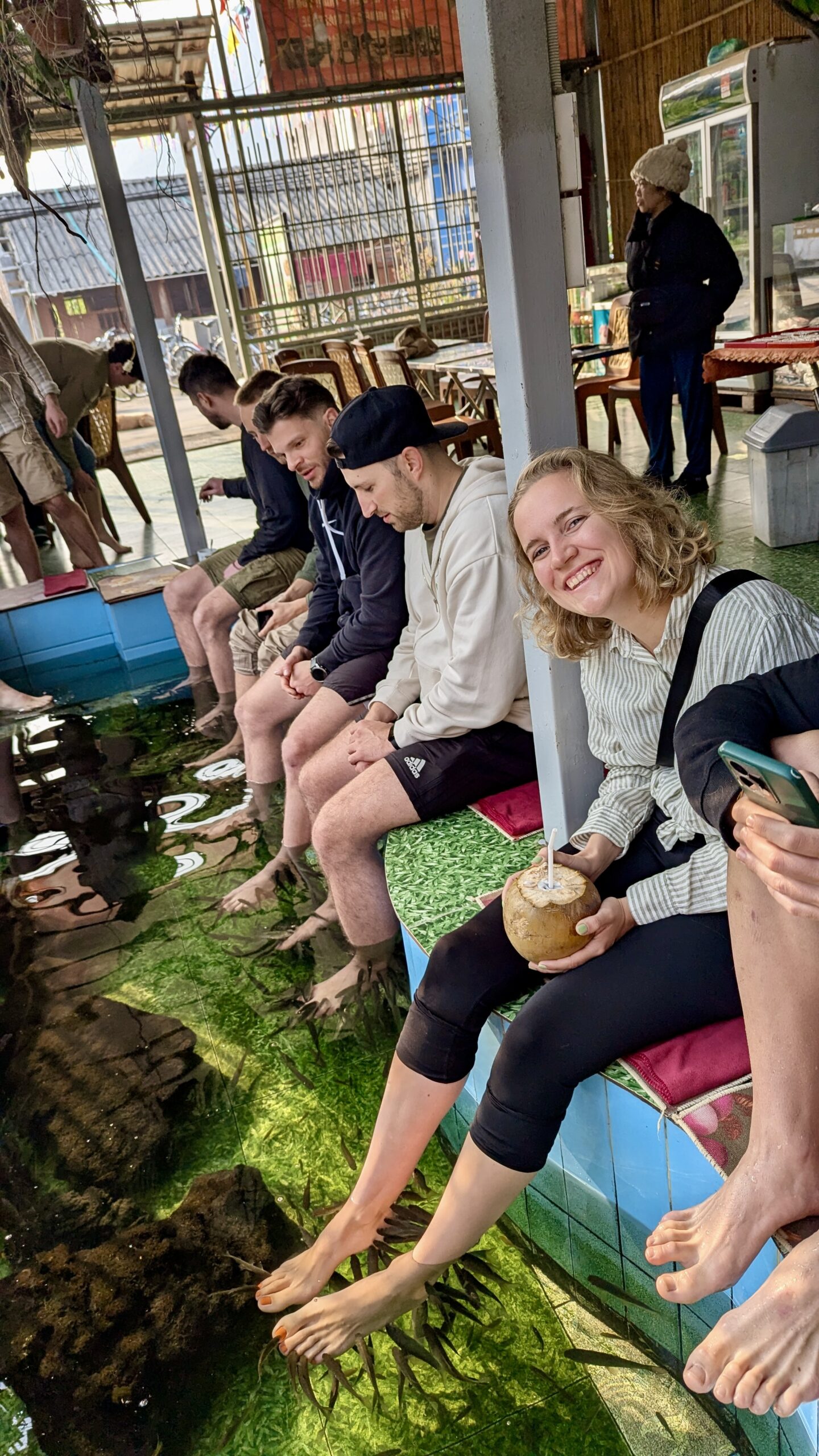 Weder Sascha noch ich trauten uns daran, aber stattdessen wagten wir uns an ein Fischbecken, in das wir unsere Füße hielten. Sofort knabberten unzählige kleine Fischis an unseren Zehen – das war echt kitzlig!