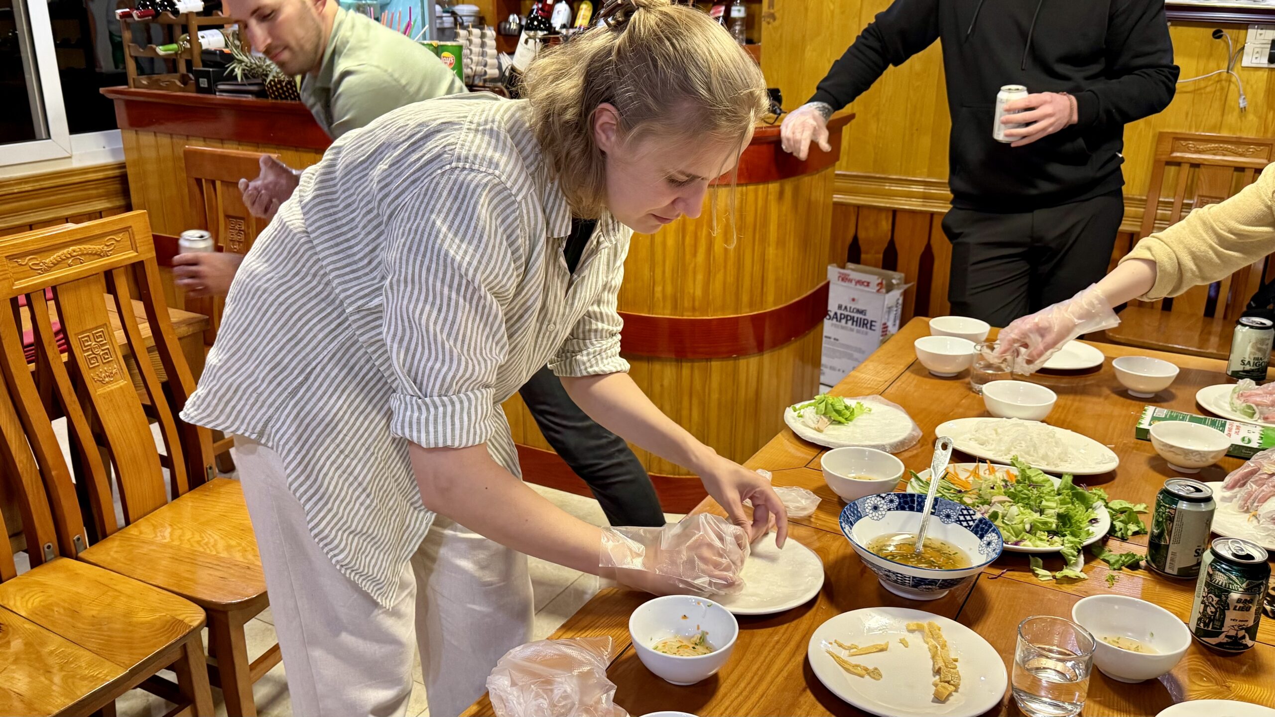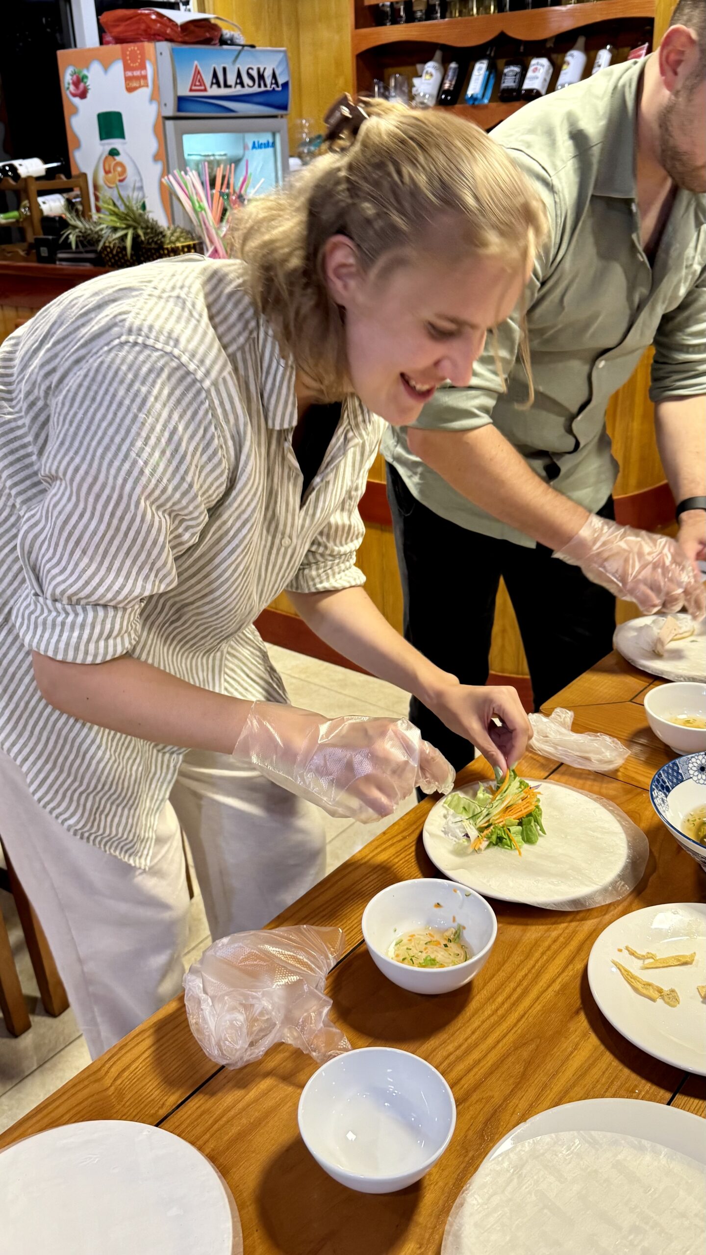 Am Abend erklärte uns Jack, wie man Sommerrollen zubereitet – was wirklich nicht schwer ist – und wir 15 Leute wurden für 30 Minuten sich selbst und den Sommerrollen überlassen. Danach gab es ein leckeres Abendessen, das jedoch etwas fischlastig ausfiel.