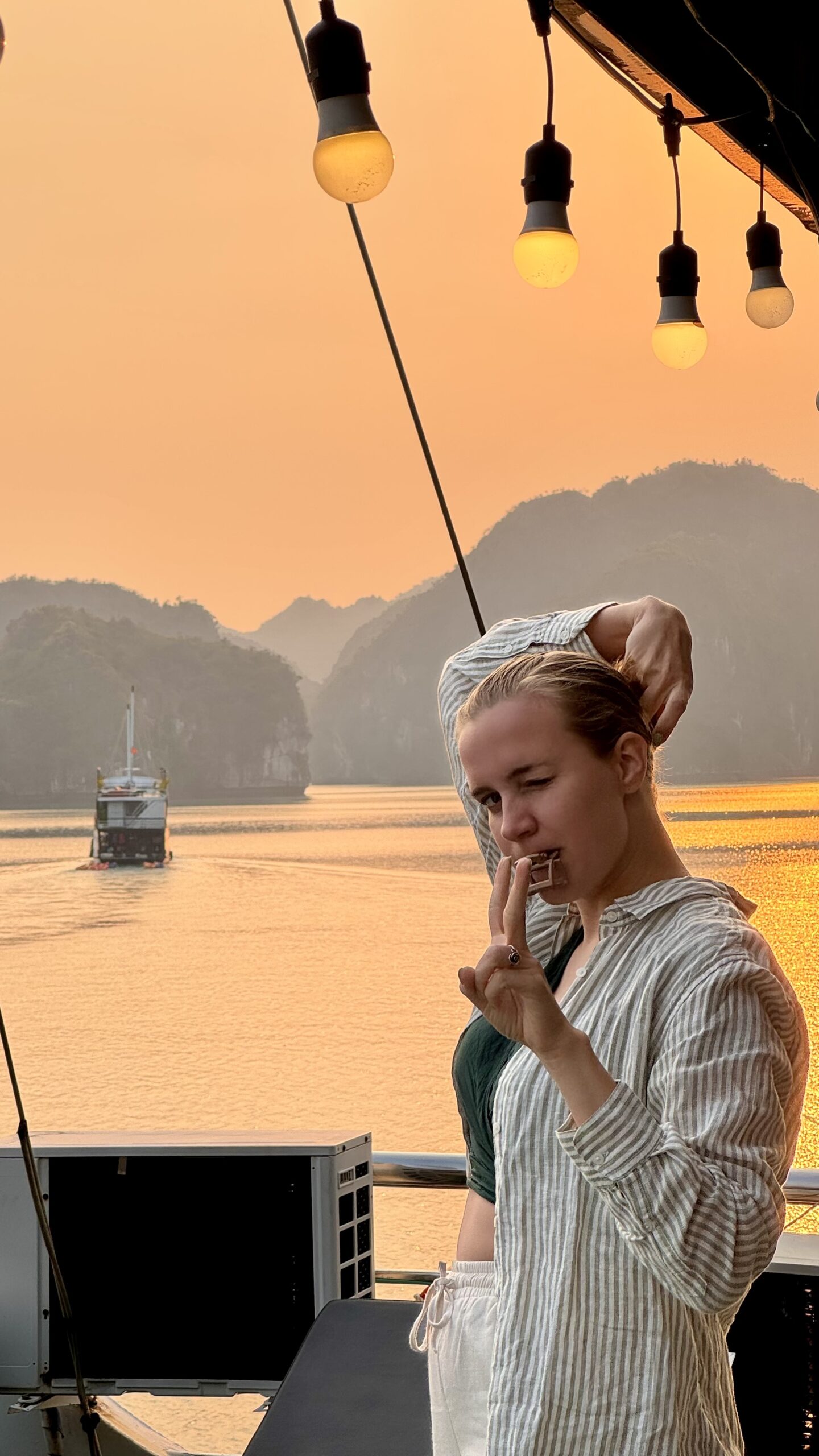 Danach ging es für uns schon wieder zurück aufs Boot, wo ein kleiner Brunch serviert wurde, bevor das Schiff zurück in den Hafen fuhr. Wir genossen noch die letzten Sonnenstrahlen auf dem Oberdeck, bevor wir in den Bus einstiegen, der uns in etwa vier Stunden nach Hanoi brachte.