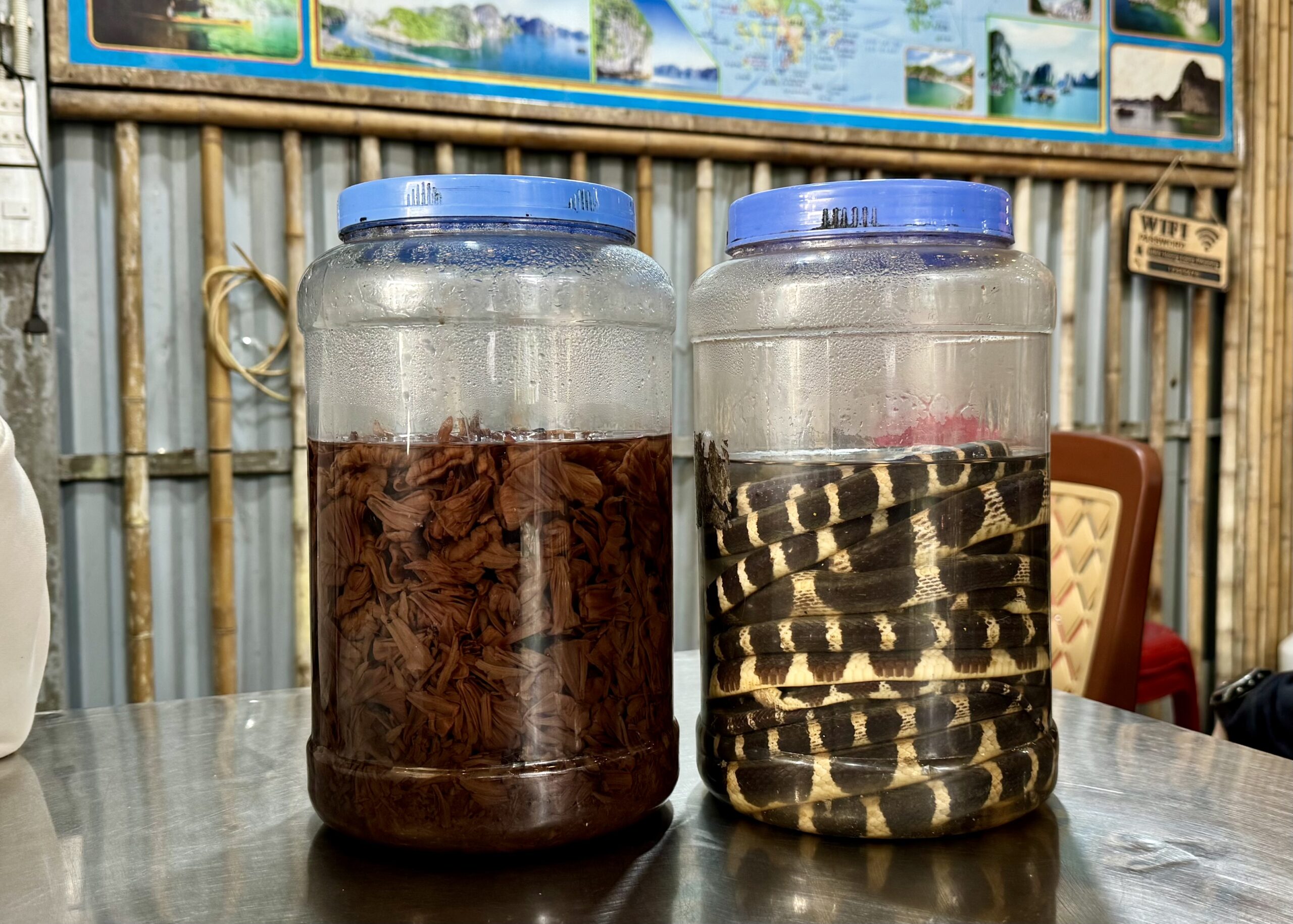 Dort konnten wir die Gemüsefelder der Bauern besichtigen und bekamen sehr wilden Schnaps präsentiert – Schnaps, in dem 20 tote Schlangen eingelegt waren. Das sah gruselig aus!