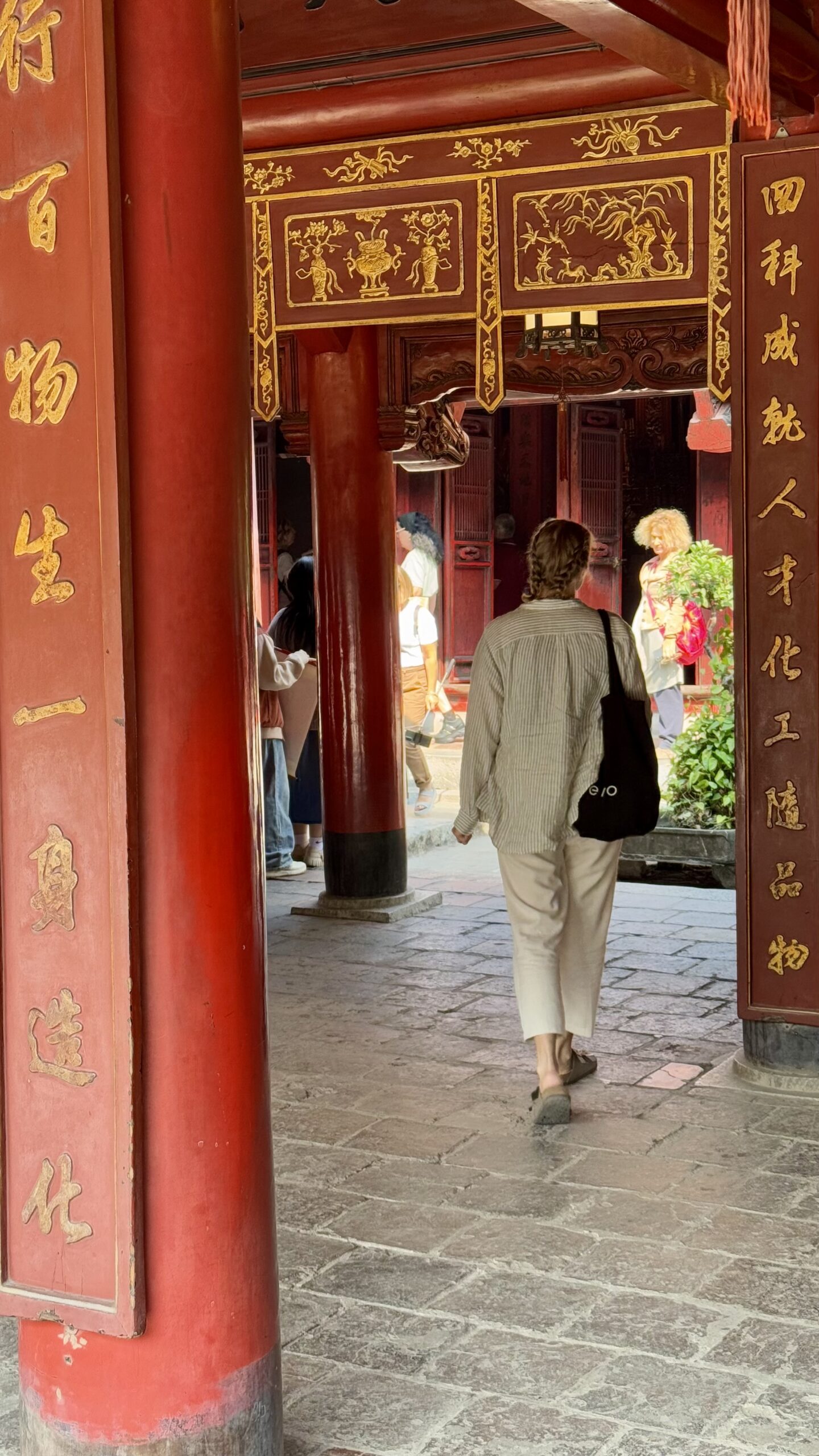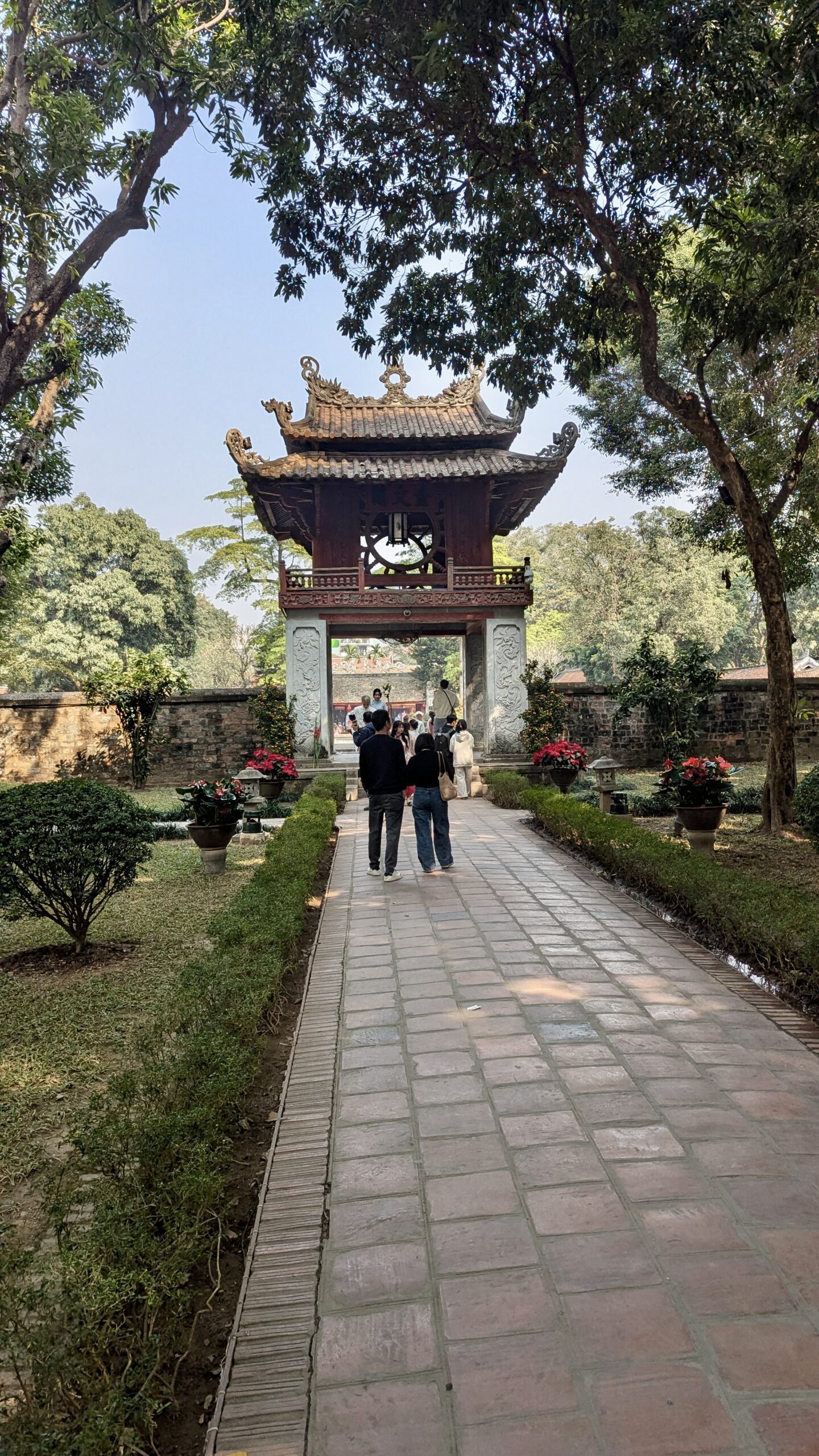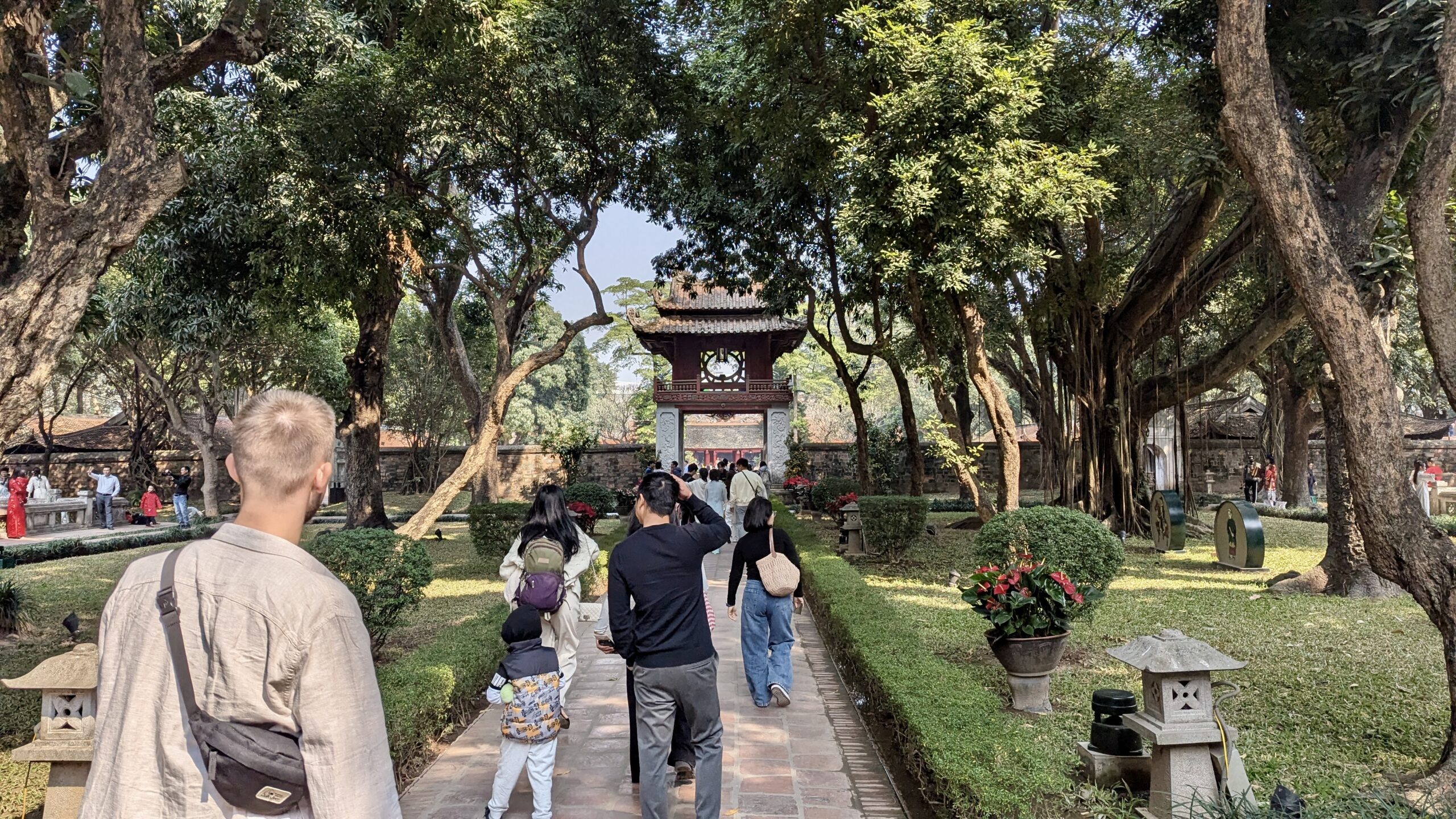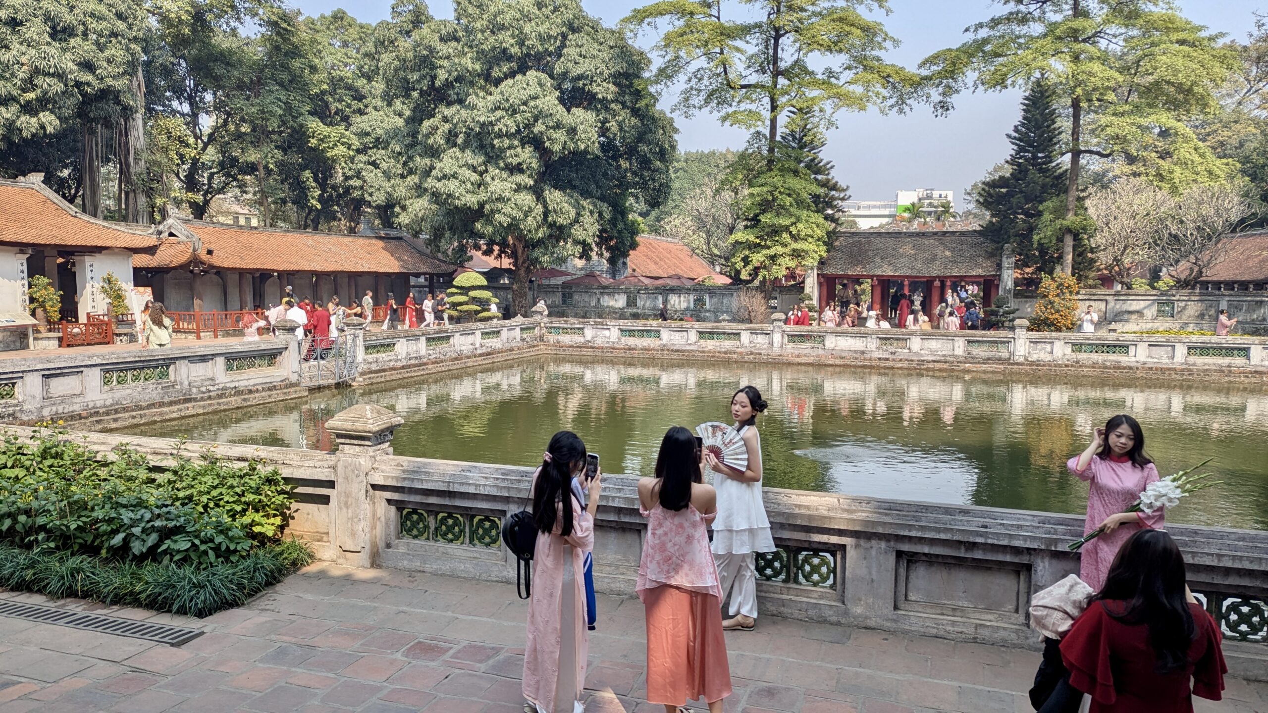Auf Empfehlung von Bernice und Nathan besuchten wir an diesem Tag außerdem den Literaturtempel, der etwas außerhalb des Stadtzentrums liegt. Man merkte, dass sich die Vietnamesen auf das Neujahrsfest Tết vorbereiteten. Es wird zeitgleich mit dem chinesischen Neujahr gefeiert, und hier schließt dann alles für mehrere Tage. Die ganze Stadt war bereits festlich geschmückt, und viele junge Frauen und Männer liefen in traditionellen Kleidern durch den Literaturtempel, um dort Fotos zu machen. Ein wirklich schönes Bild! 😊