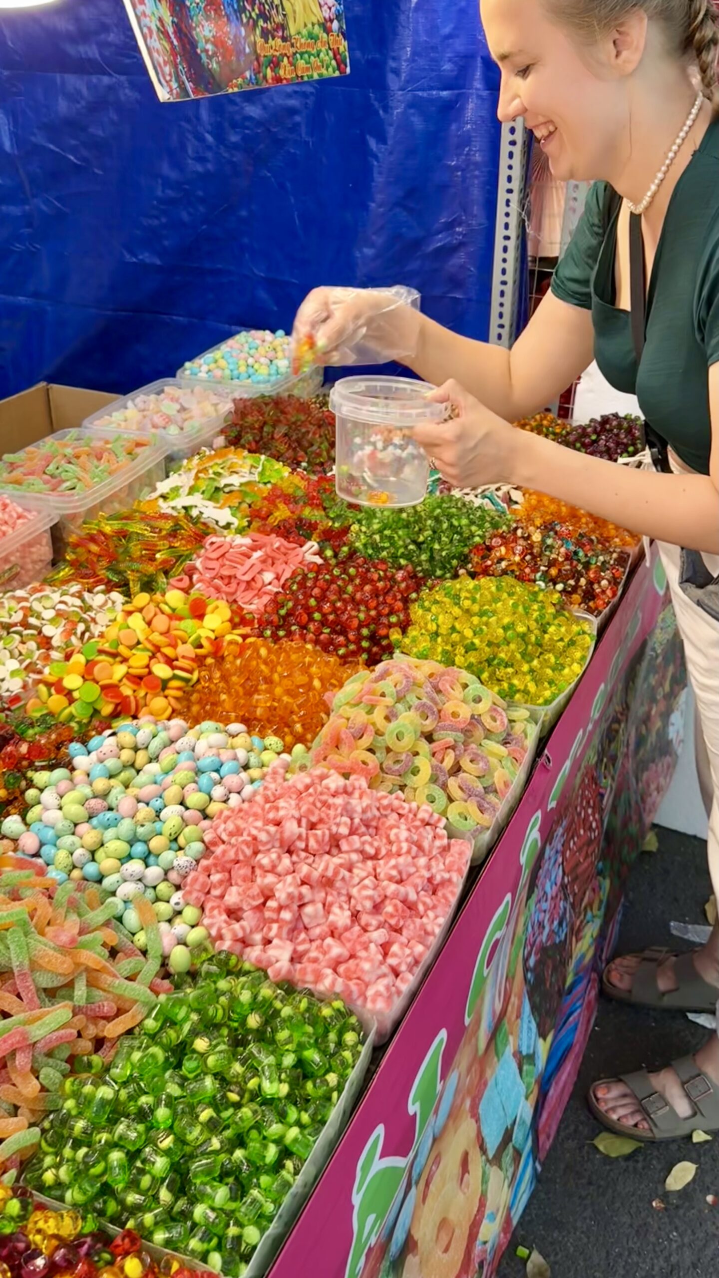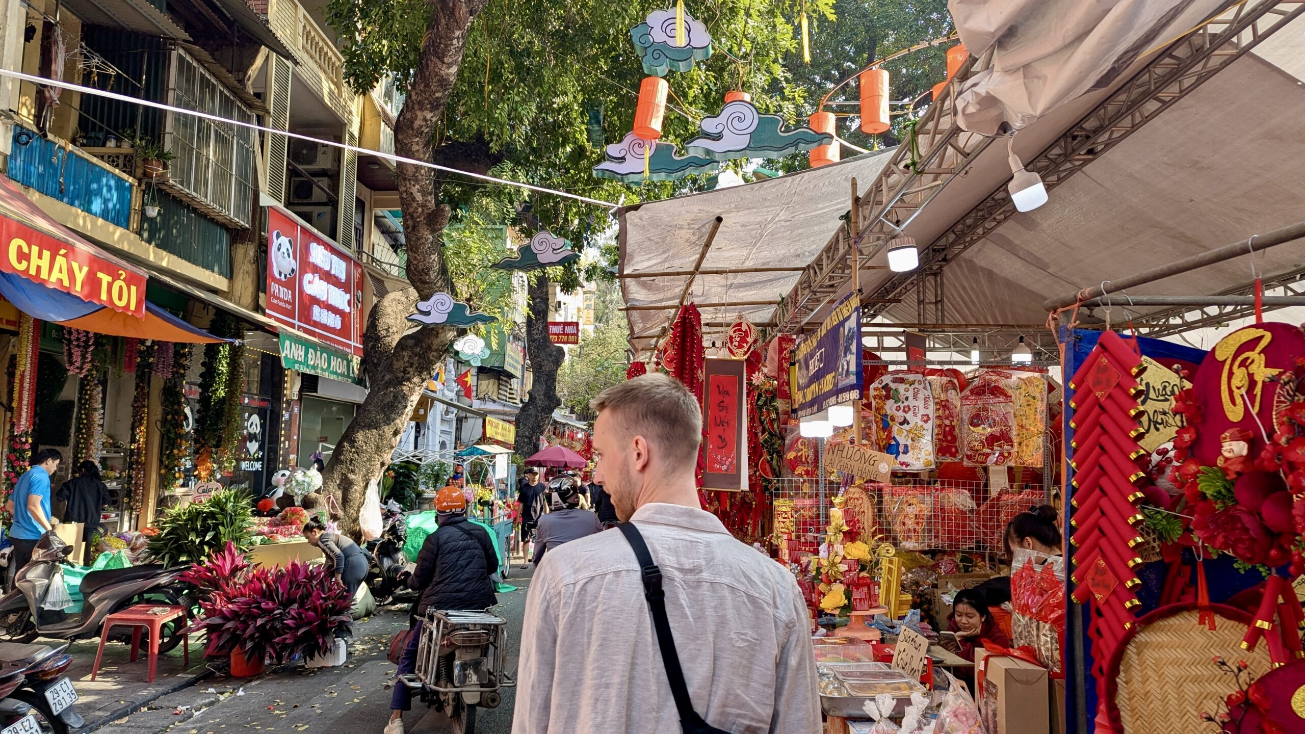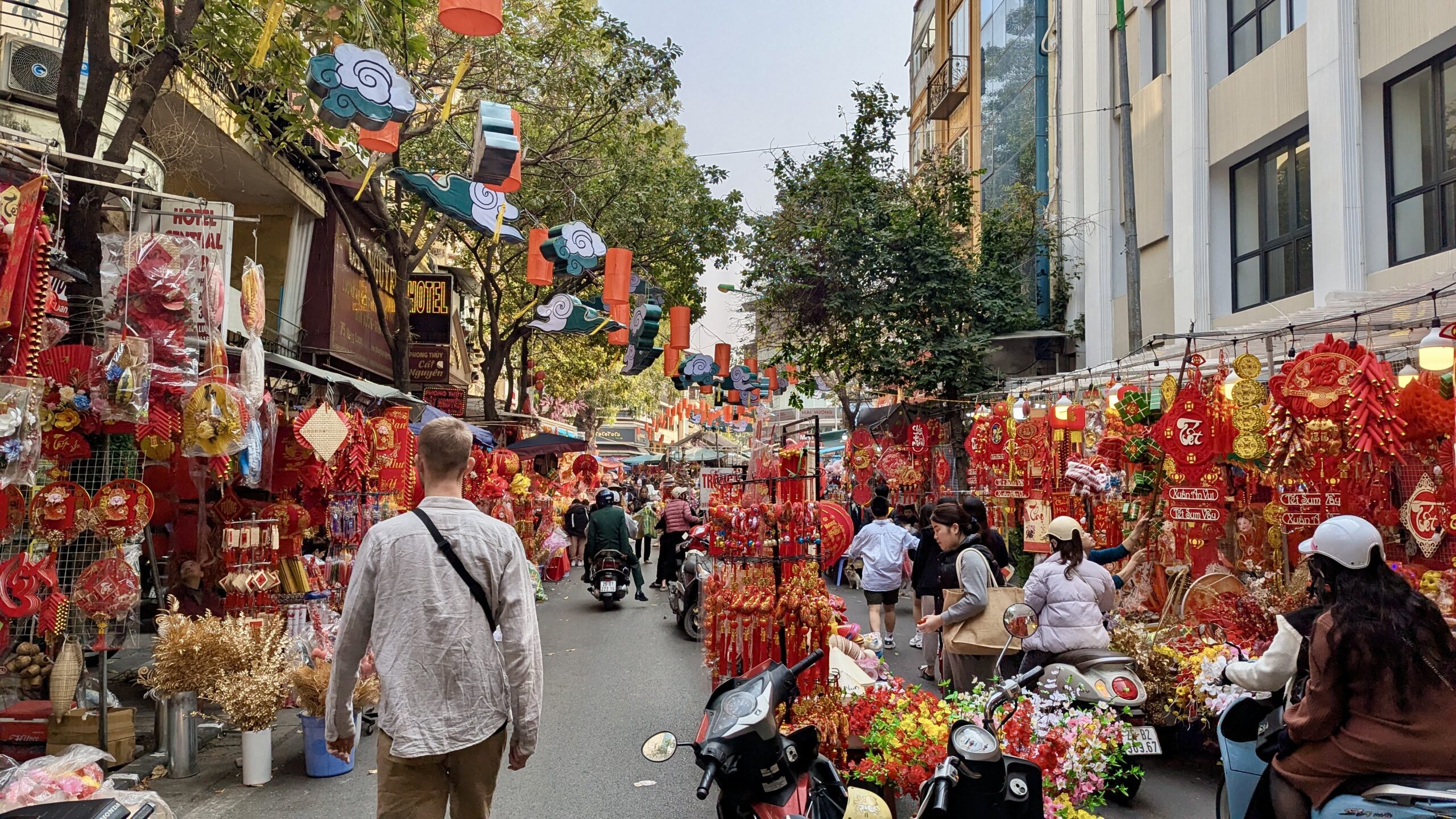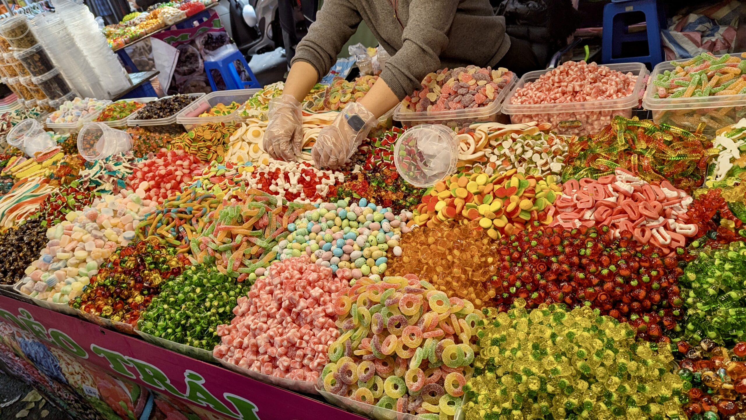 Unsere Füße trugen uns weiter durch die Stadt, bis wir schließlich auf einen bunten Markt stießen, auf dem man jede Menge Dekorationen für Tết kaufen konnte. Überall hingen die Kalender für das Jahr der Schlange, und ich entdeckte einen Süßigkeitenstand, den ich natürlich sofort überfiel. 😄 Ich packte mir eine bunte Mischung der verschiedensten Gummibärchen ein.