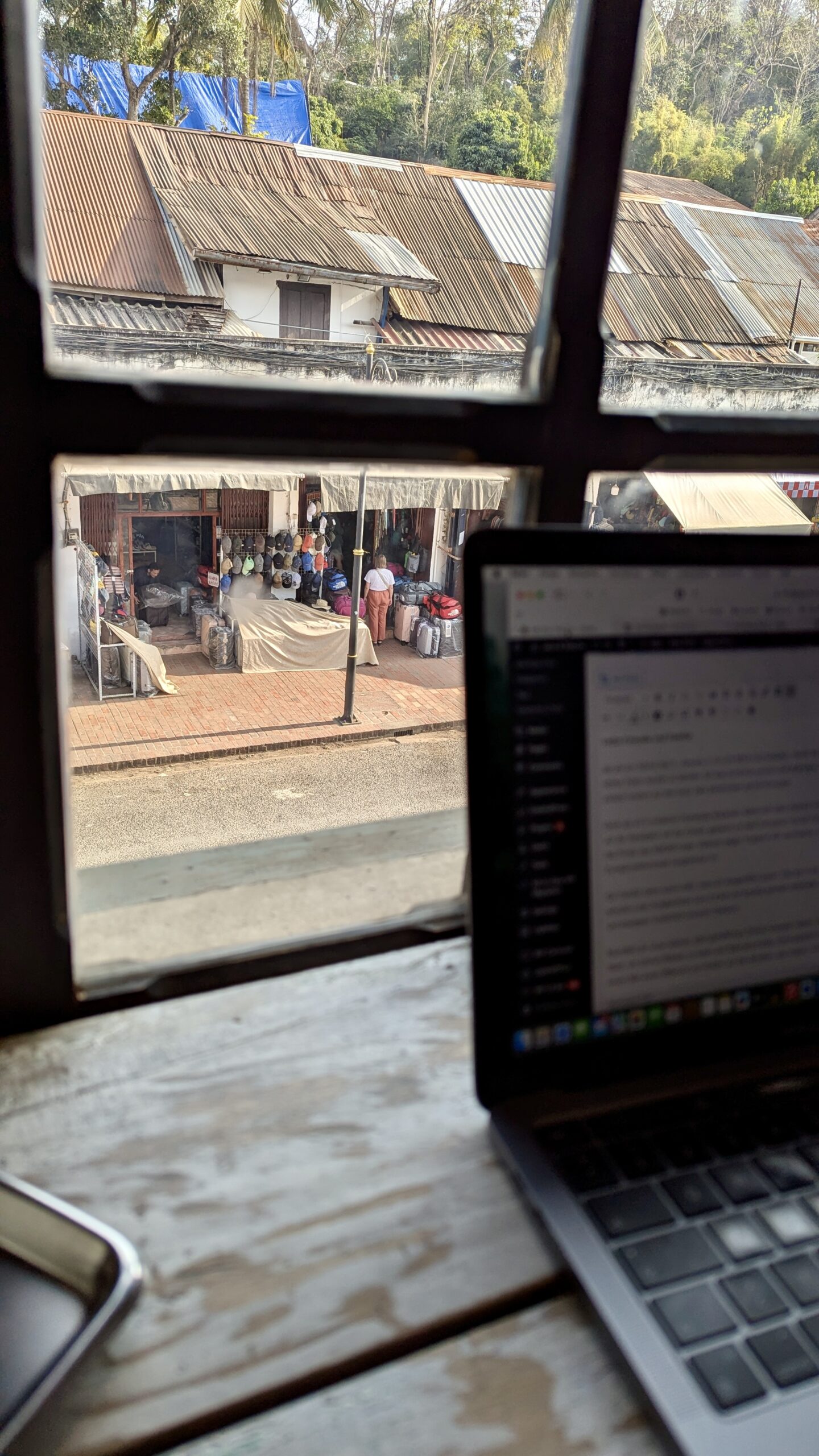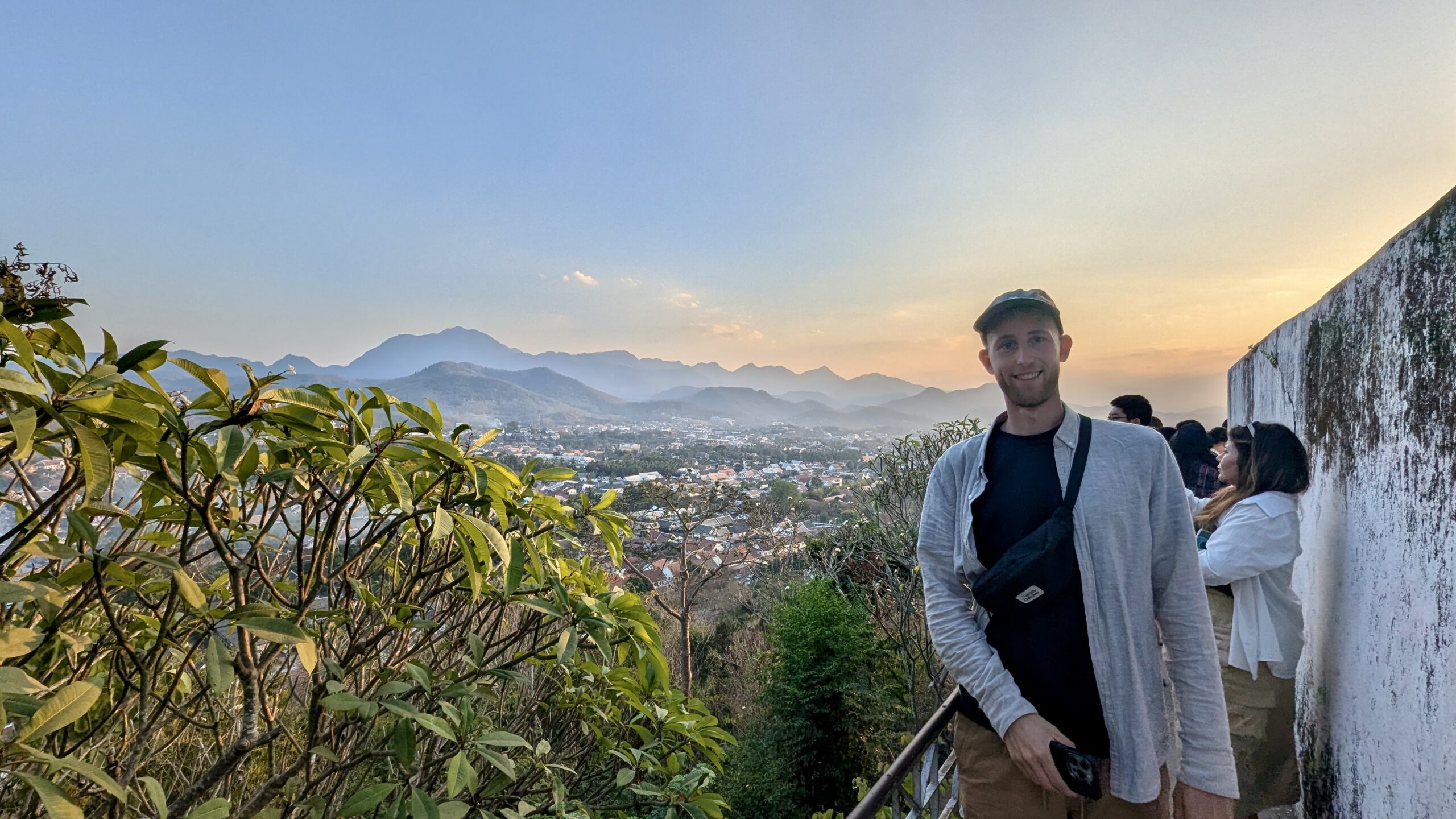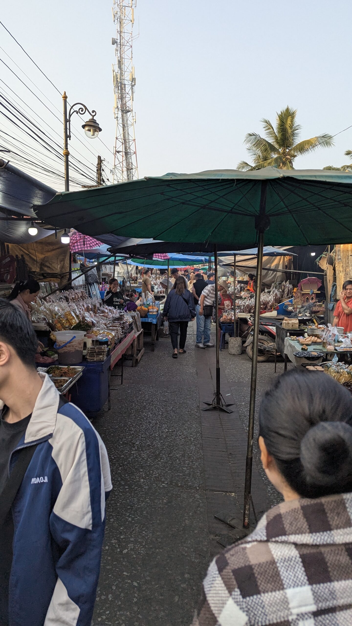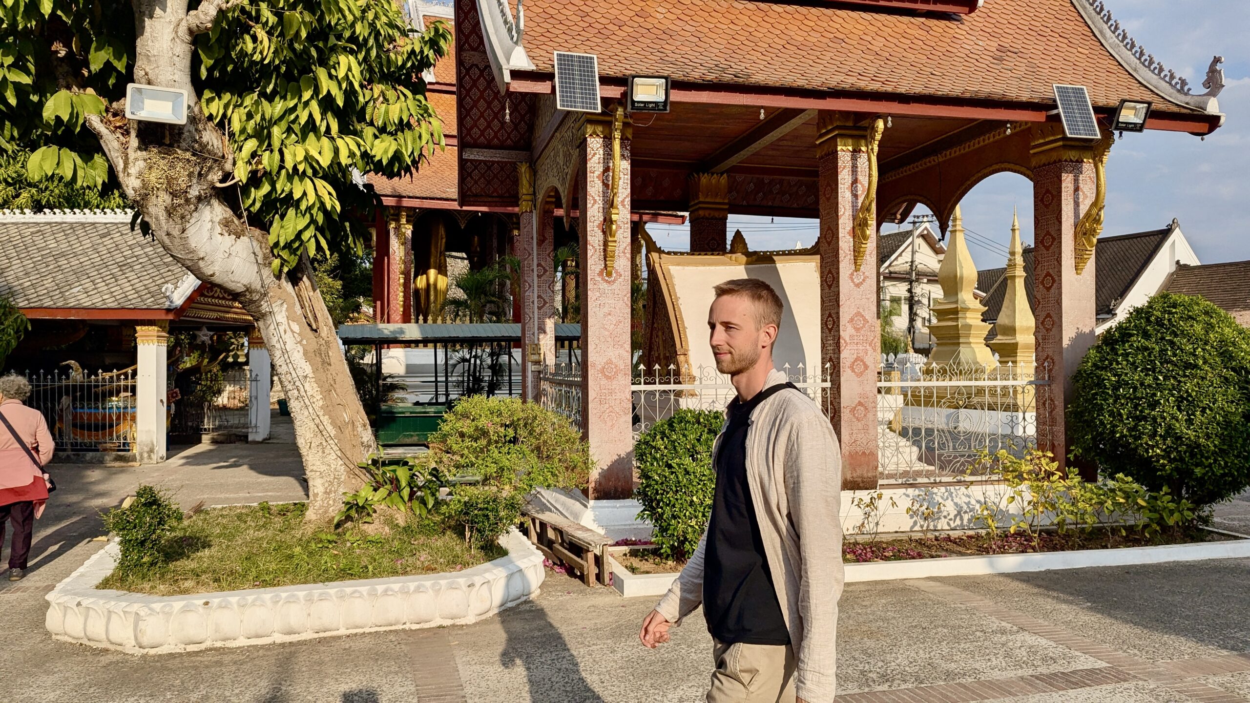 Lisa und Nick hatten uns den Link zu ihrem Hotel geschickt, das sie in Luang Prabang genutzt hatten. Hier zahlten wir ebenfalls 30 € pro Nacht, und das war, glaube ich, das schrecklichste Hotel unserer gesamten Reise bisher. Die Fenster hatten keine Verglasung und bestanden nur aus Holzläden, die nicht dicht waren. Nachts gehen hier die Temperaturen zwar „nur“ auf 12 °C runter und sind tagsüber bei 33 °C, aber das größere Problem war die Lautstärke. Nachts rollten die Roller an unserem Fenster vorbei, betrunkene Touristen lachten laut vor unseren Fenstern (wir waren im Erdgeschoss) und unterhielten sich in unangebrachten Lautstärken. Im Bad funktionierte zu Beginn das Wasser nicht, und überall in den Ecken fanden sich Schimmelflecken. Unsere Nachttischlampe ließ sich nicht ausschalten, wenn wir den Schalter umlegten, also mussten wir die Birne herausdrehen. Und diese Betten… das waren Bretter. Sascha und ich hatten Schmerzen, die wir zuvor noch nie gespürt hatten. Die Nächte waren nicht erholsam.