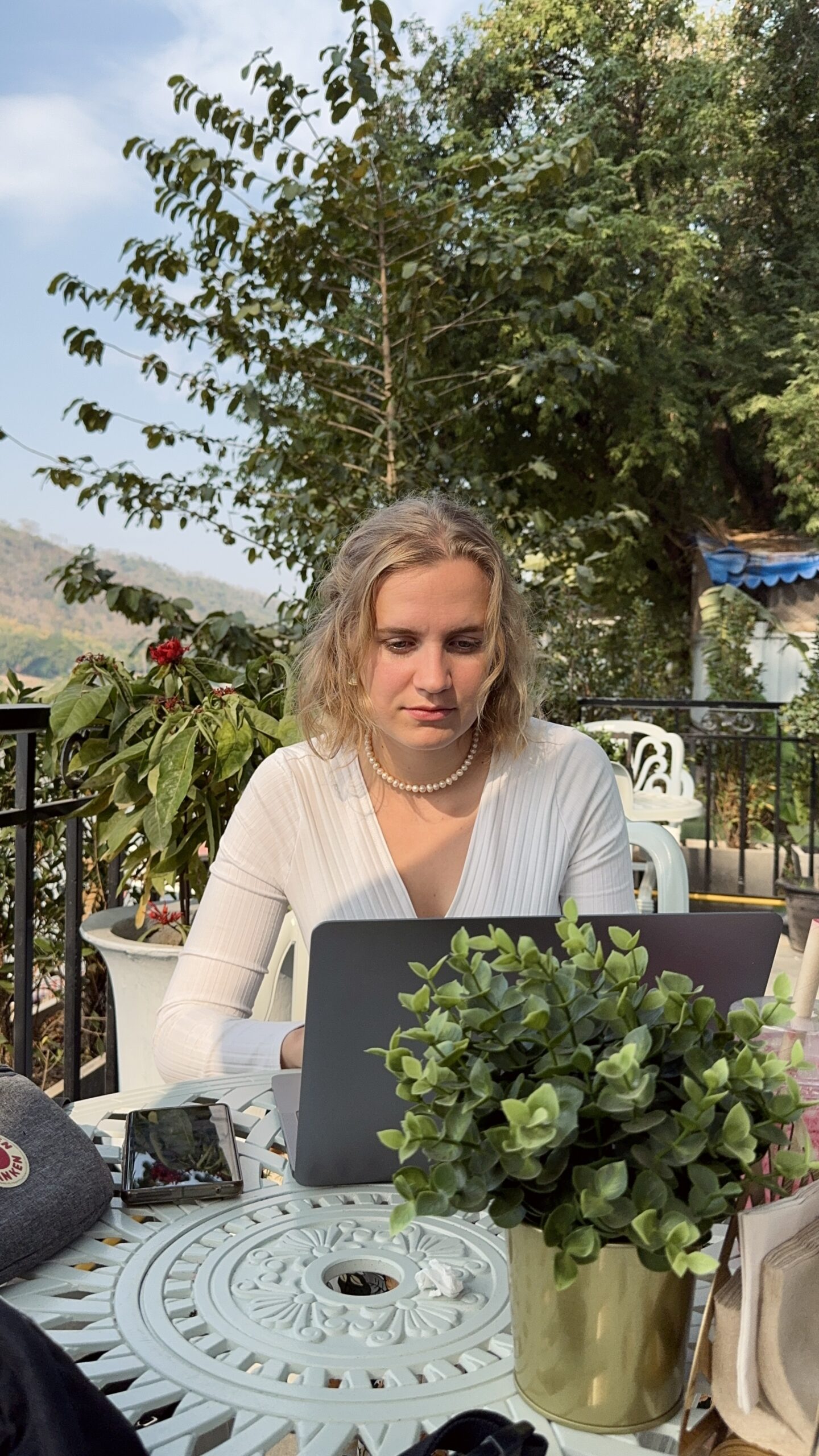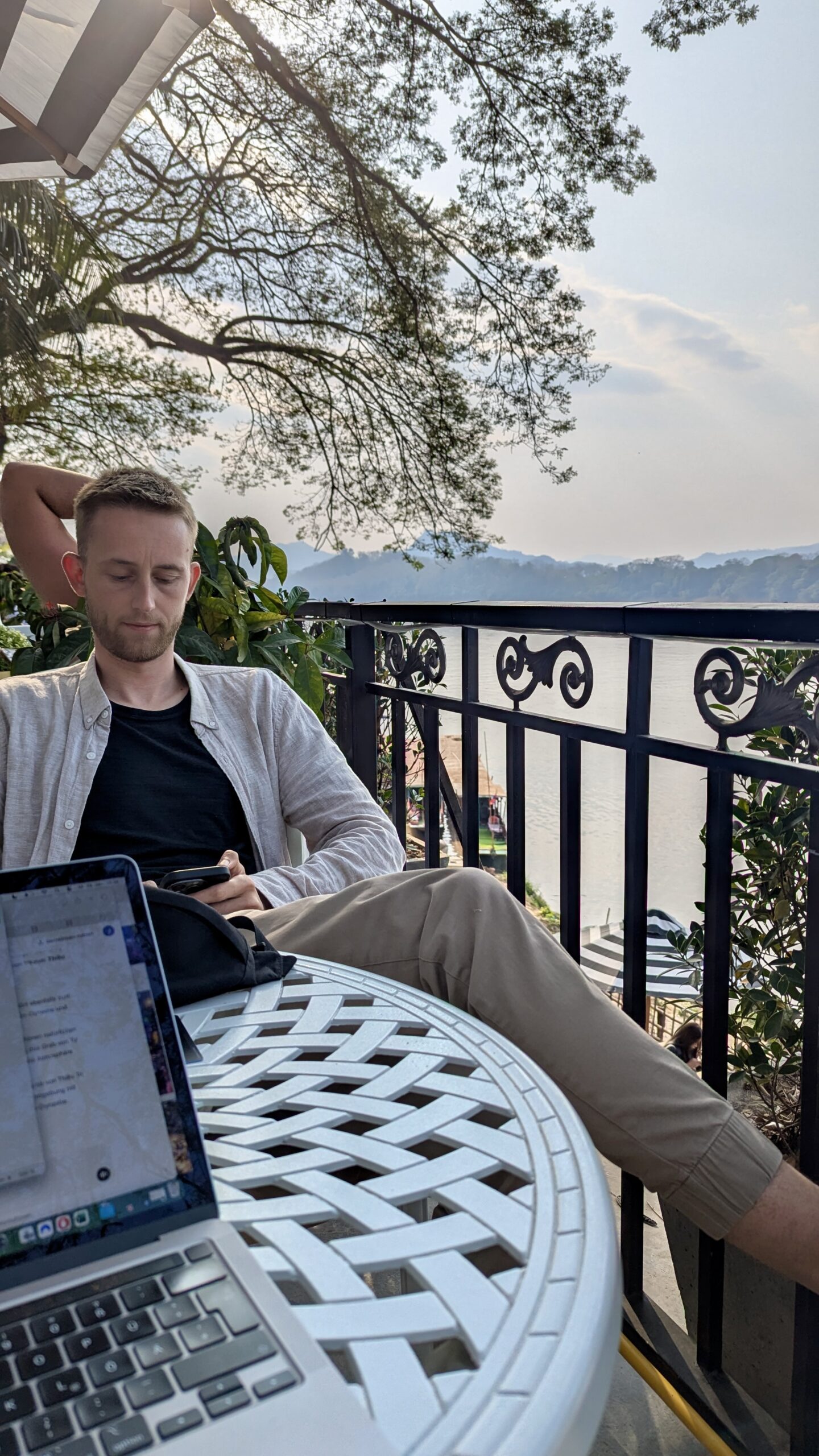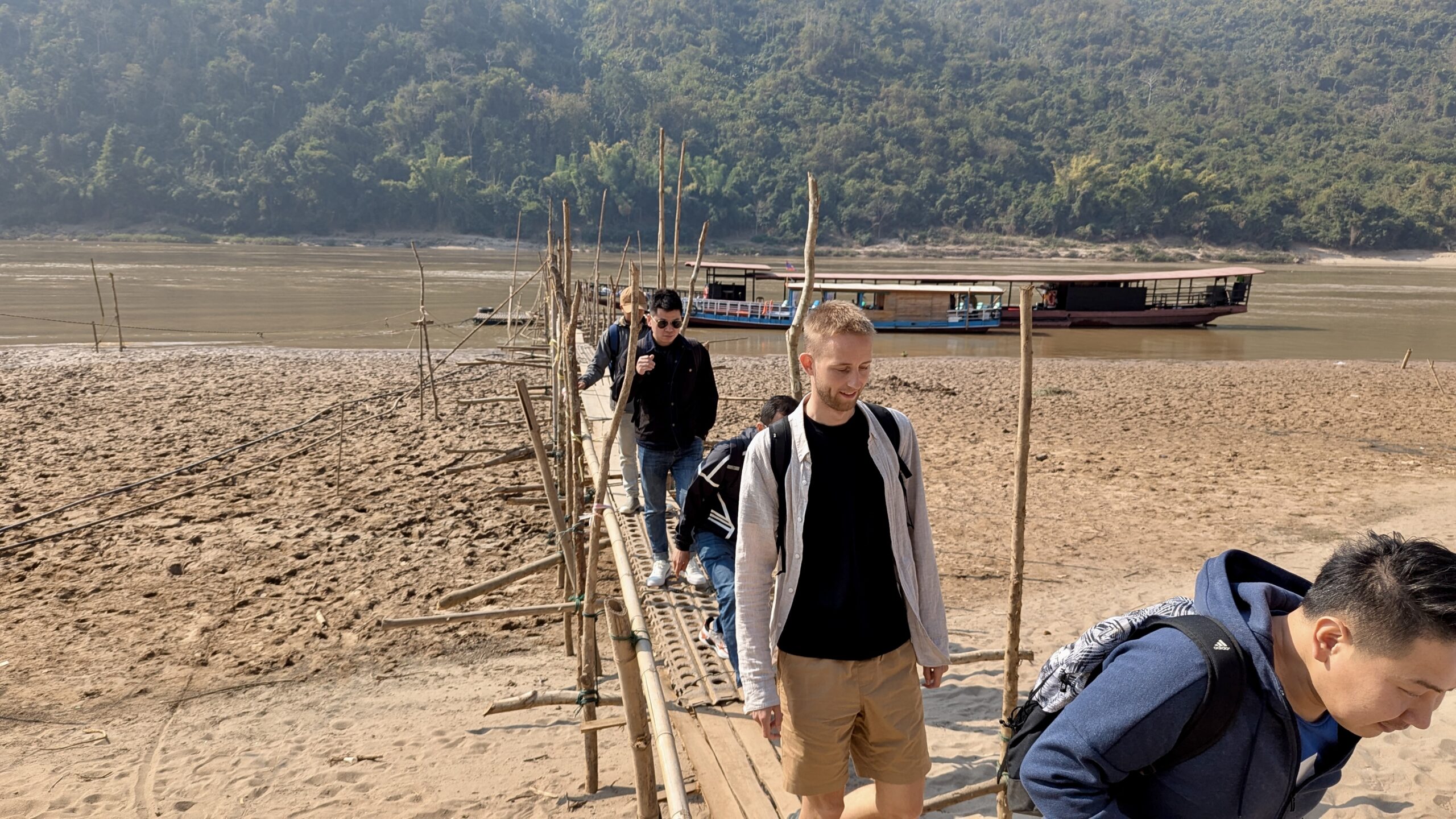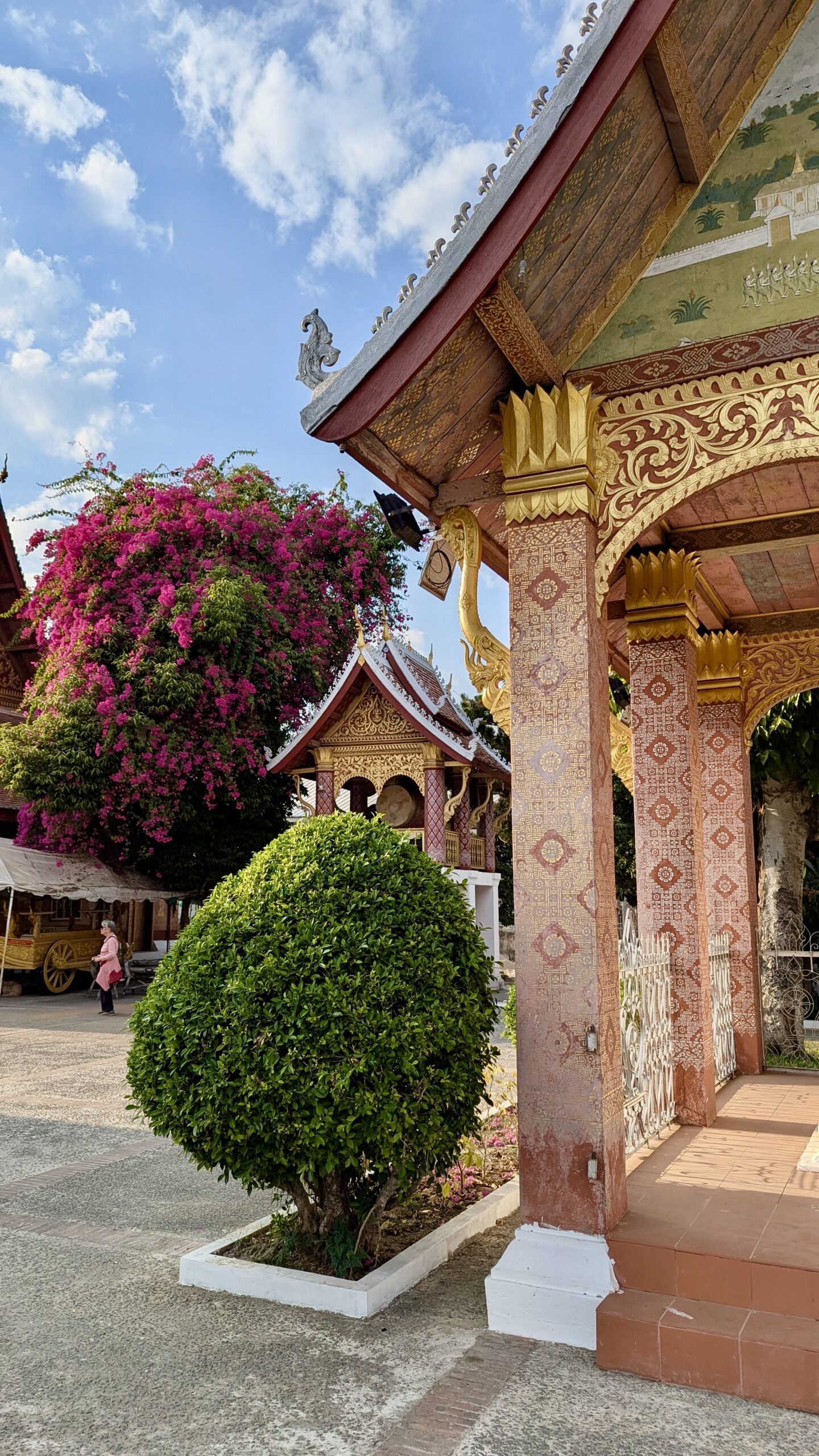 Lisa und Nick hatten uns den Link zu ihrem Hotel geschickt, das sie in Luang Prabang genutzt hatten. Hier zahlten wir ebenfalls 30 € pro Nacht, und das war, glaube ich, das schrecklichste Hotel unserer gesamten Reise bisher. Die Fenster hatten keine Verglasung und bestanden nur aus Holzläden, die nicht dicht waren. Nachts gehen hier die Temperaturen zwar „nur“ auf 12 °C runter und sind tagsüber bei 33 °C, aber das größere Problem war die Lautstärke. Nachts rollten die Roller an unserem Fenster vorbei, betrunkene Touristen lachten laut vor unseren Fenstern (wir waren im Erdgeschoss) und unterhielten sich in unangebrachten Lautstärken. Im Bad funktionierte zu Beginn das Wasser nicht, und überall in den Ecken fanden sich Schimmelflecken. Unsere Nachttischlampe ließ sich nicht ausschalten, wenn wir den Schalter umlegten, also mussten wir die Birne herausdrehen. Und diese Betten… das waren Bretter. Sascha und ich hatten Schmerzen, die wir zuvor noch nie gespürt hatten. Die Nächte waren nicht erholsam.