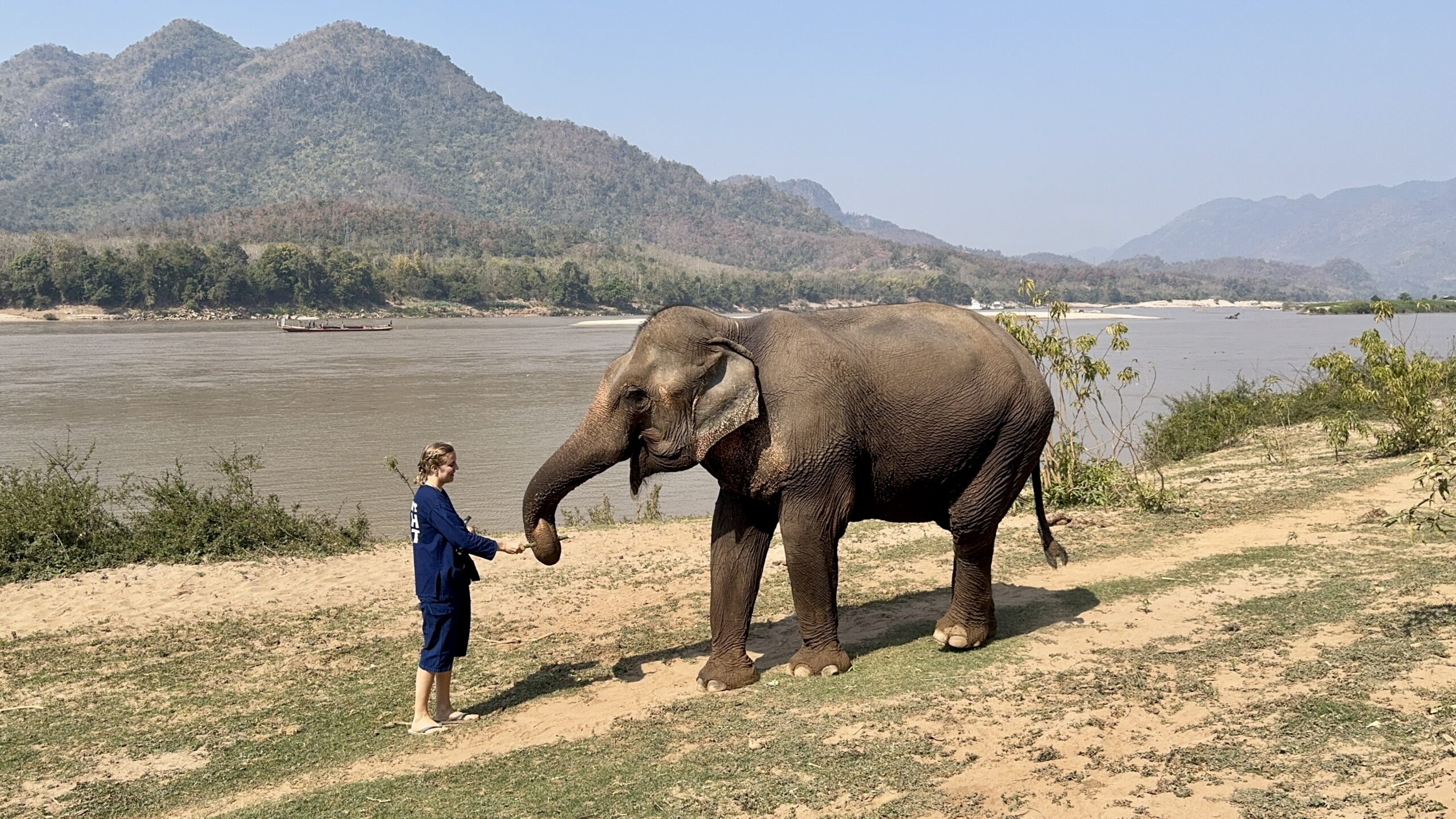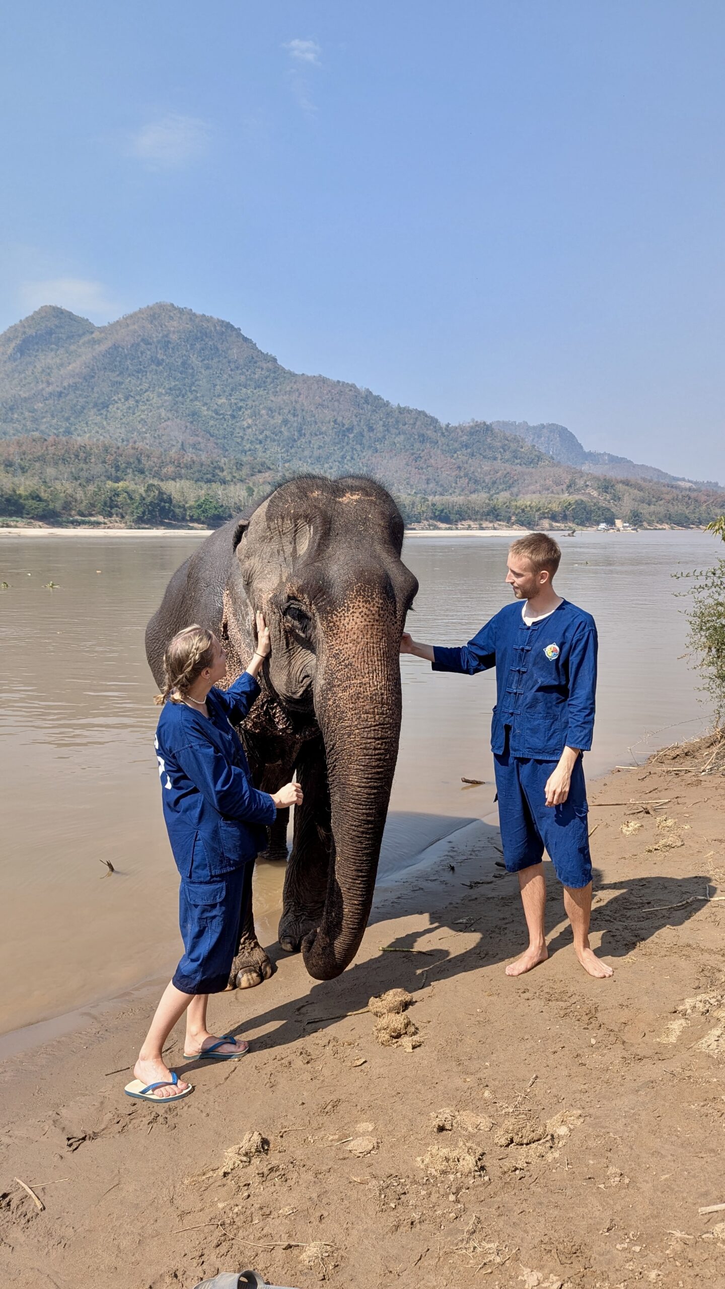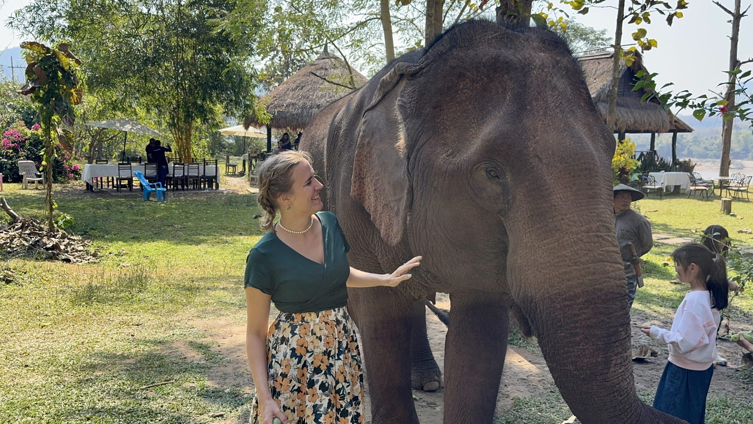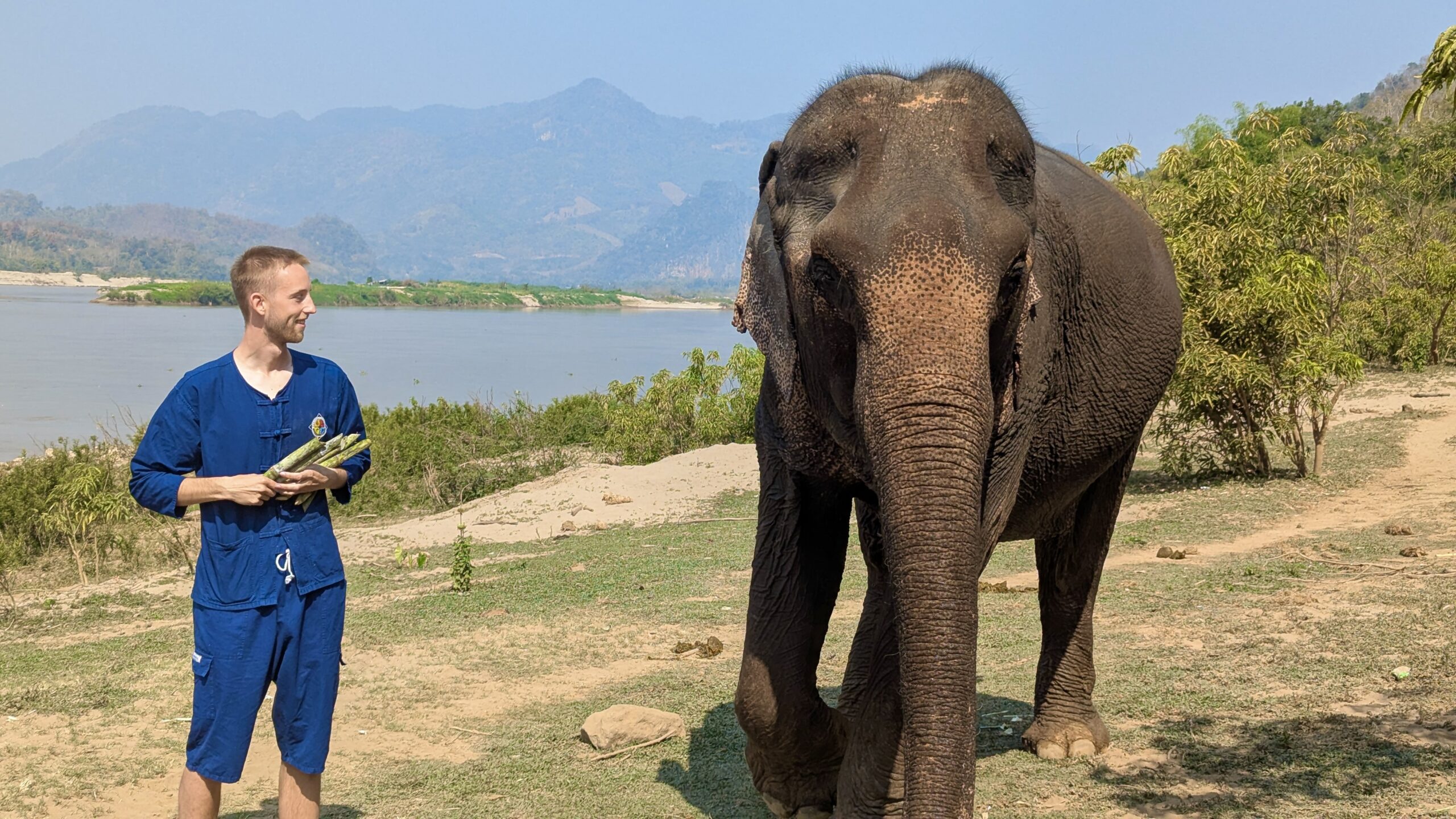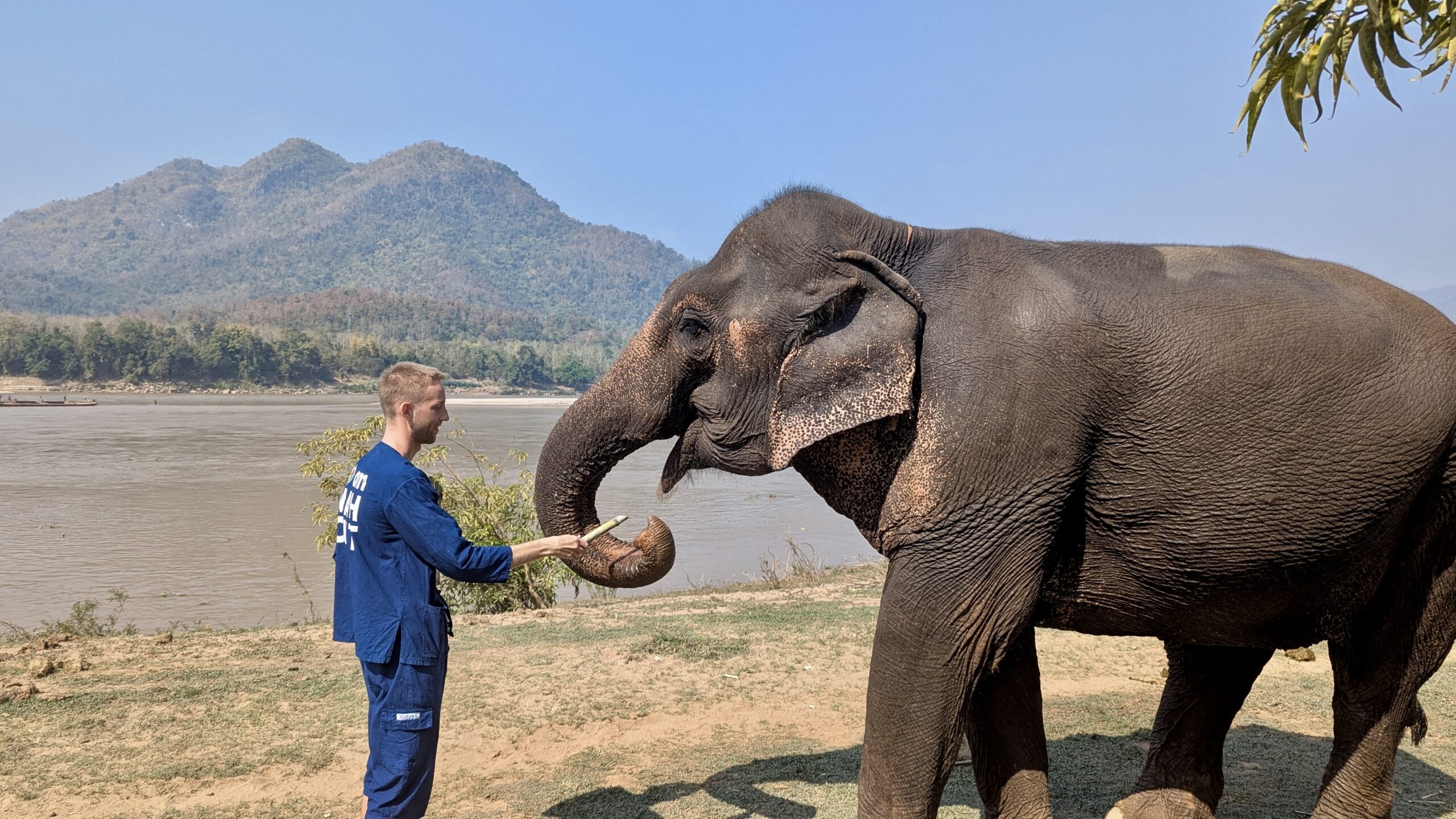 Nach ein wenig Recherche fanden wir ein Unternehmen, das sechs Elefanten hält und ein großes Reservat im Dschungel am Rande des Mekongs betreibt. Für 30 € pro Person durften wir auf den Wegen der Elefanten laufen, sie beim Baden beobachten und ihnen Bananen sowie Zuckerrohr zum Füttern anbieten.