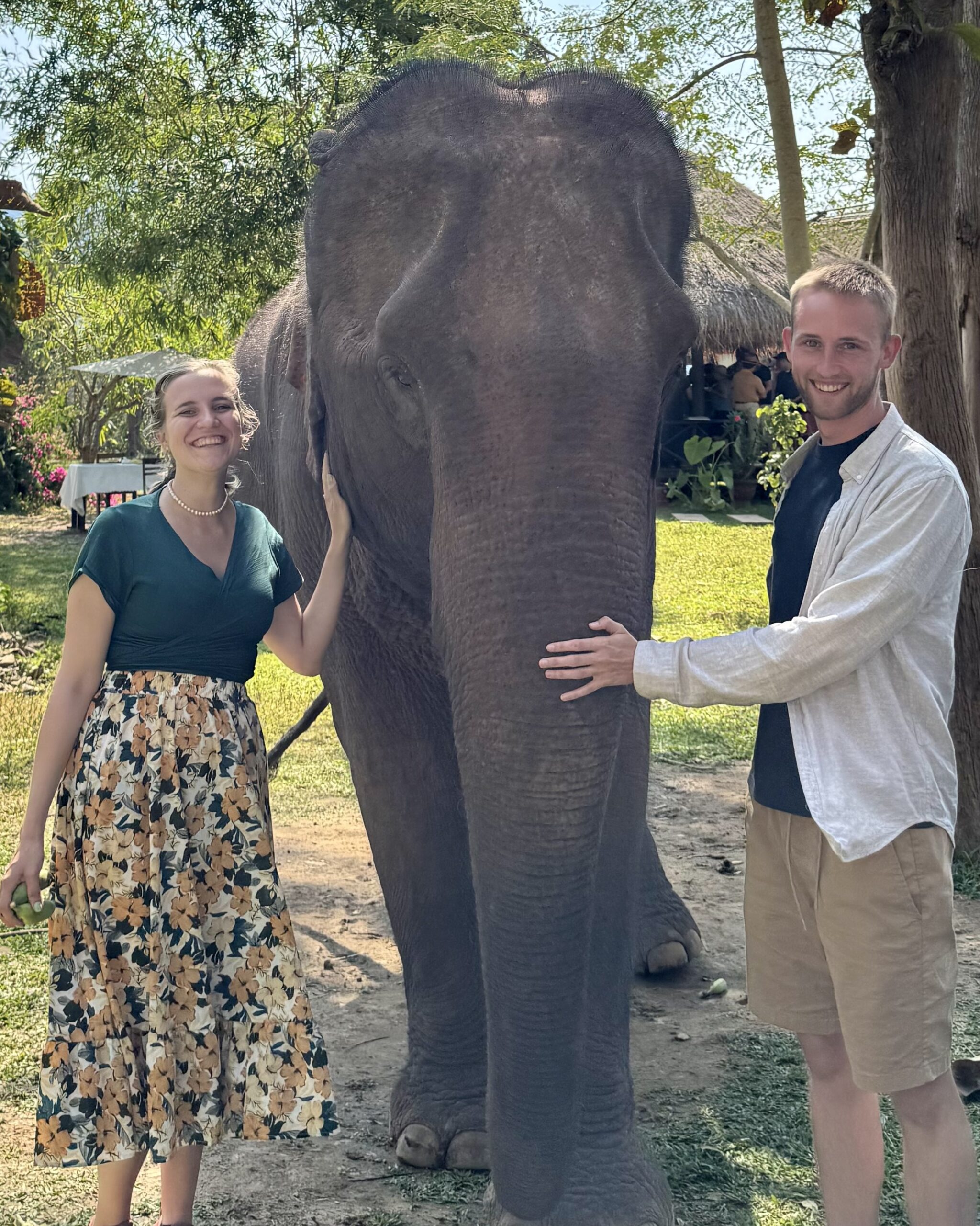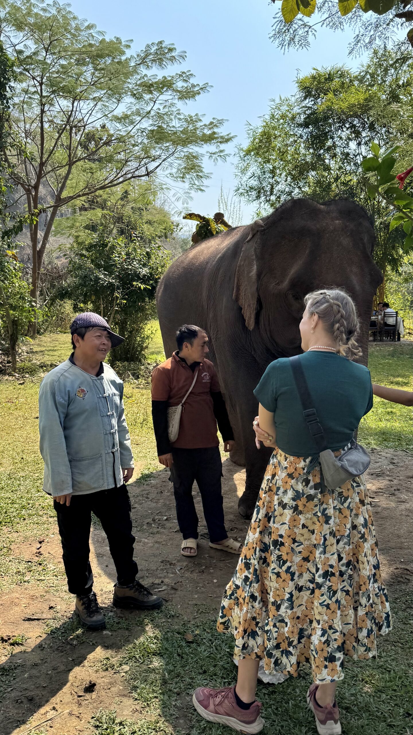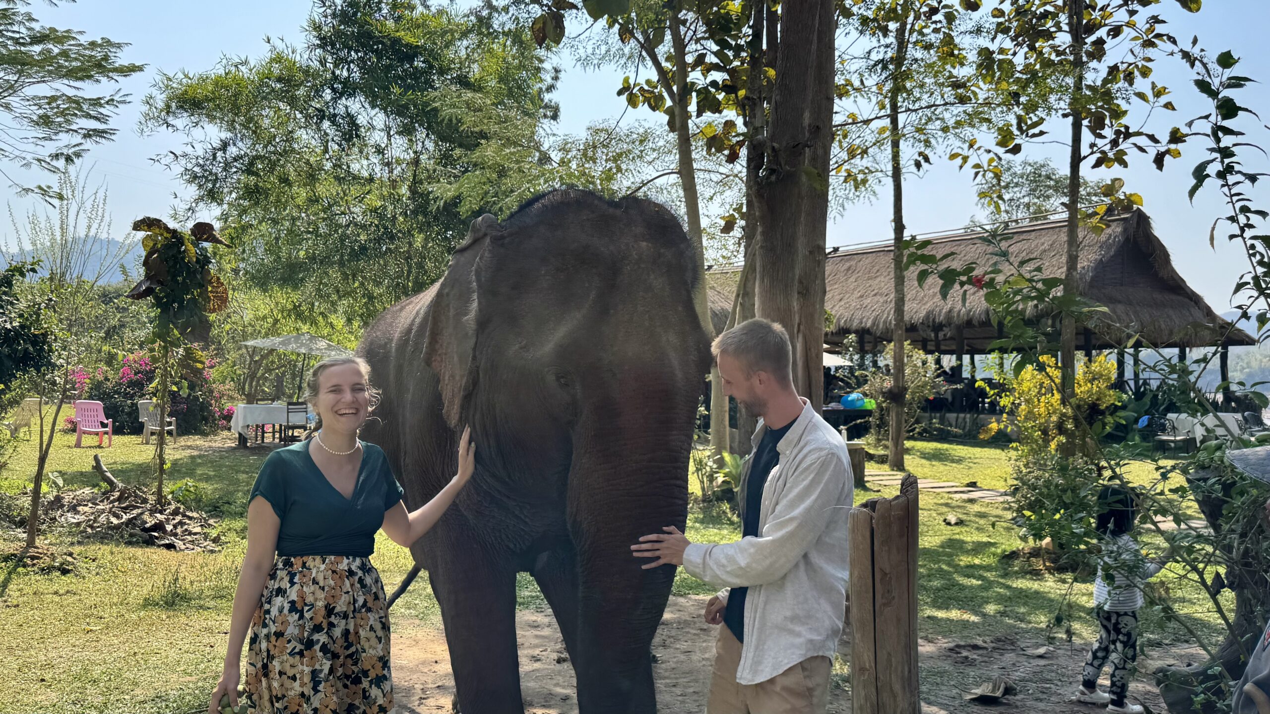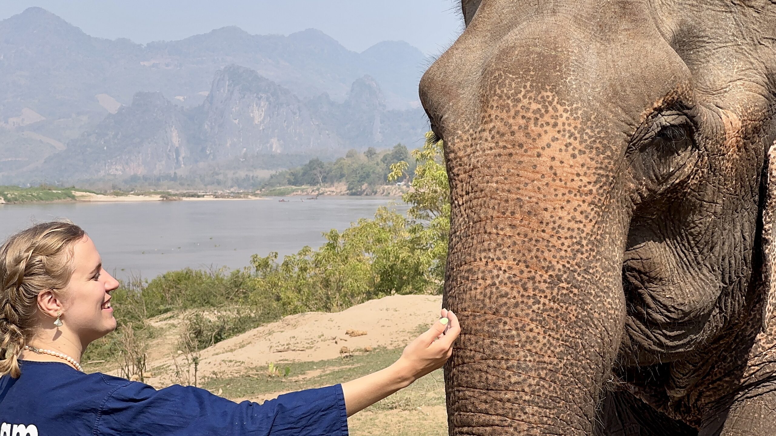 Nach ein wenig Recherche fanden wir ein Unternehmen, das sechs Elefanten hält und ein großes Reservat im Dschungel am Rande des Mekongs betreibt. Für 30 € pro Person durften wir auf den Wegen der Elefanten laufen, sie beim Baden beobachten und ihnen Bananen sowie Zuckerrohr zum Füttern anbieten.