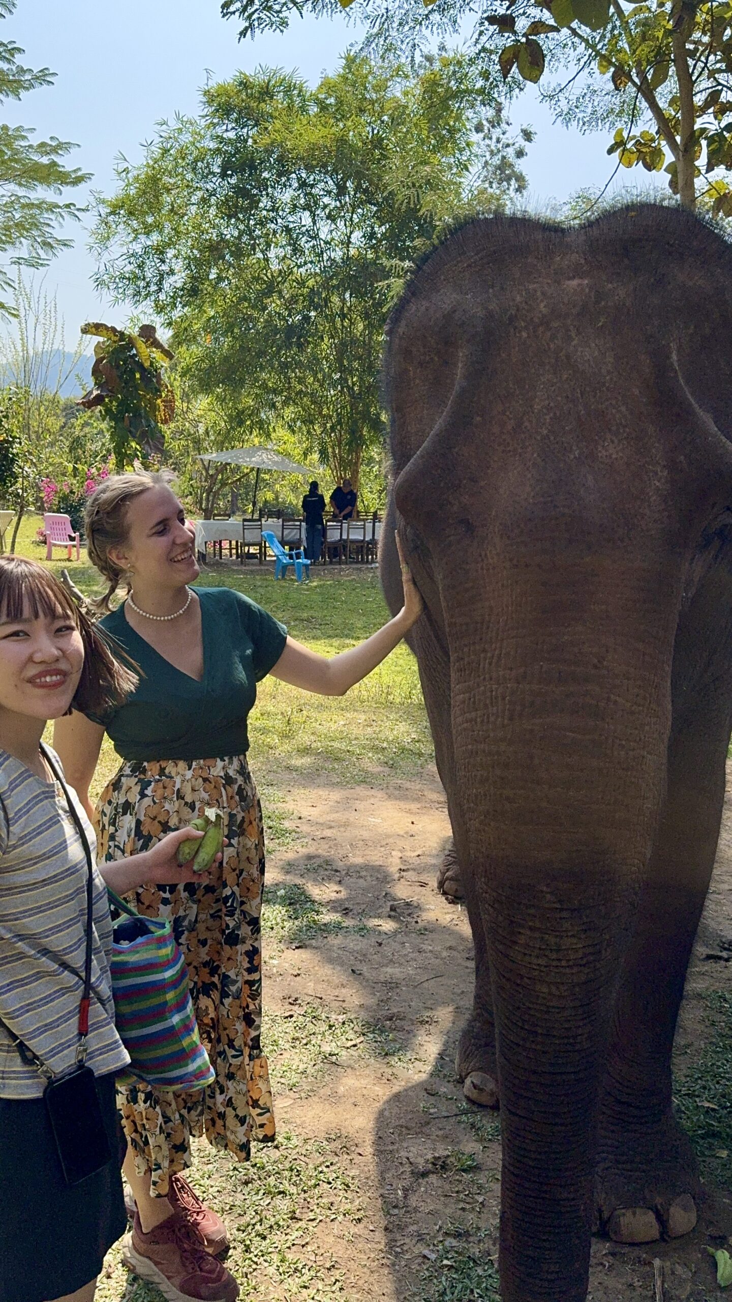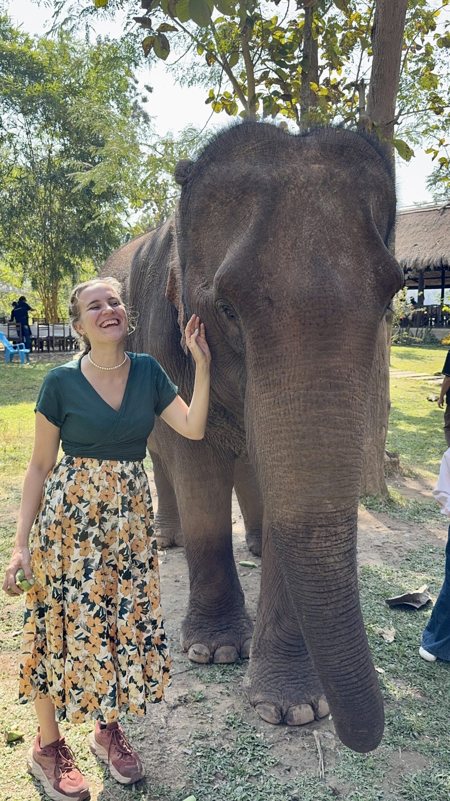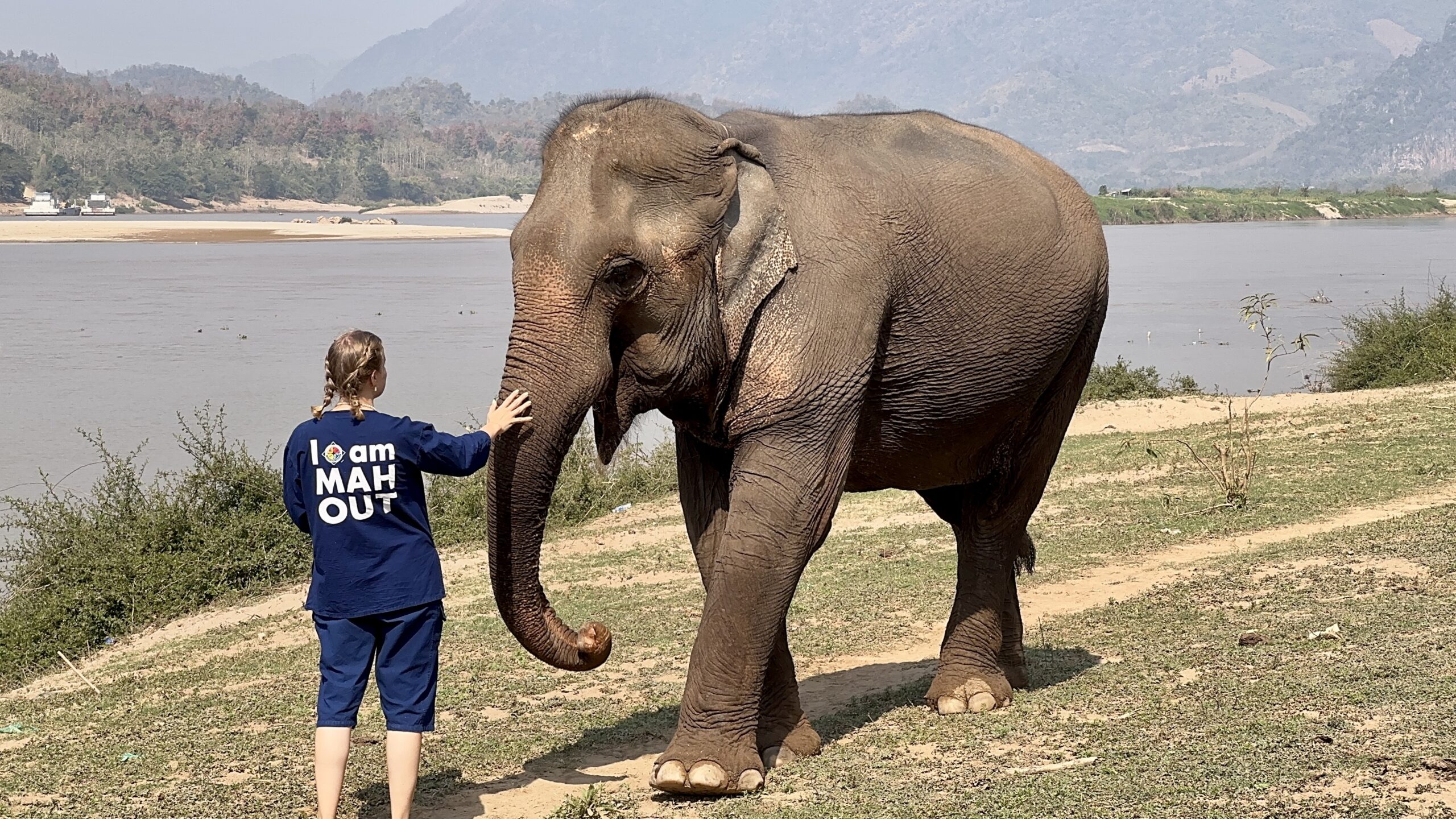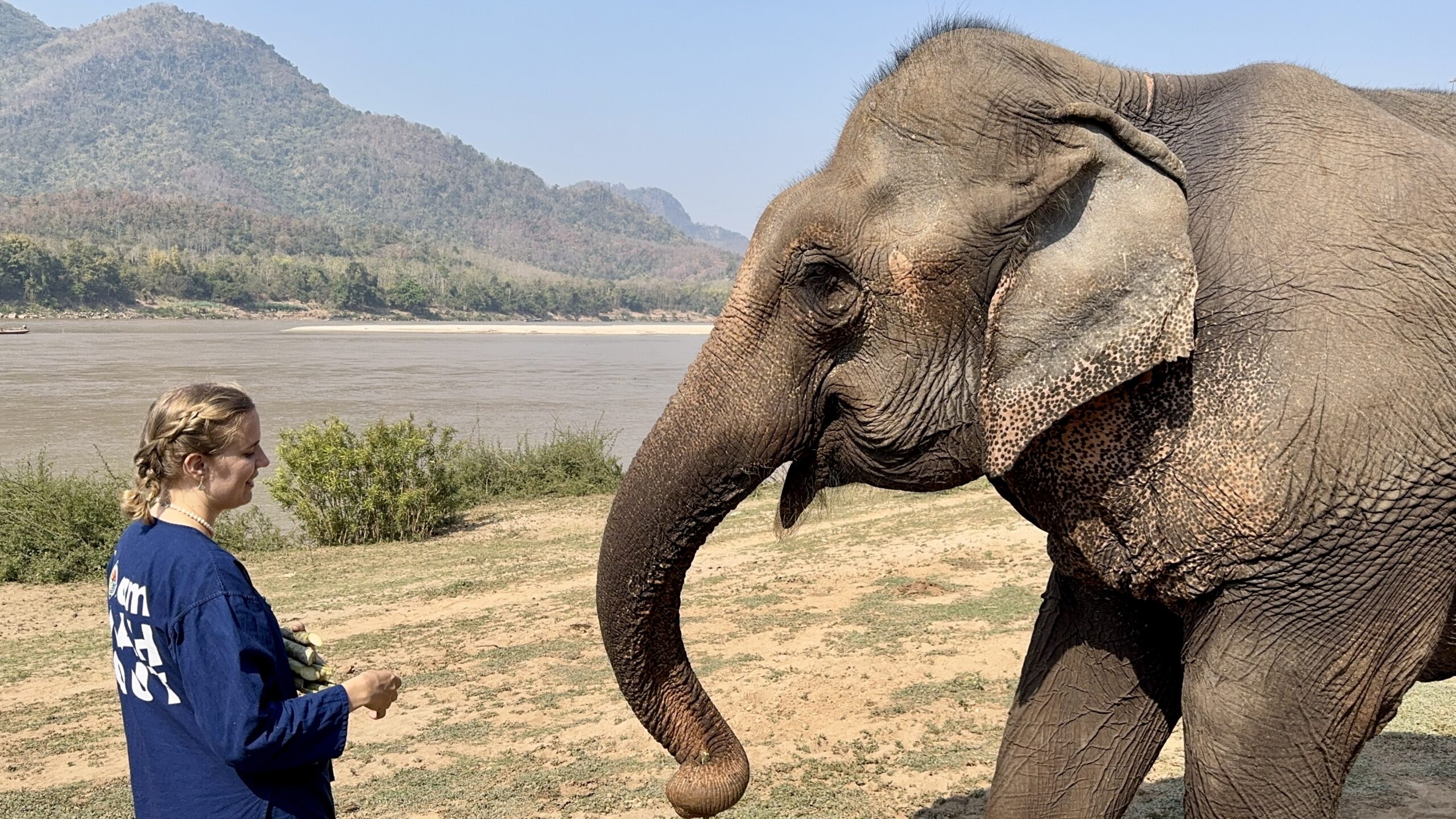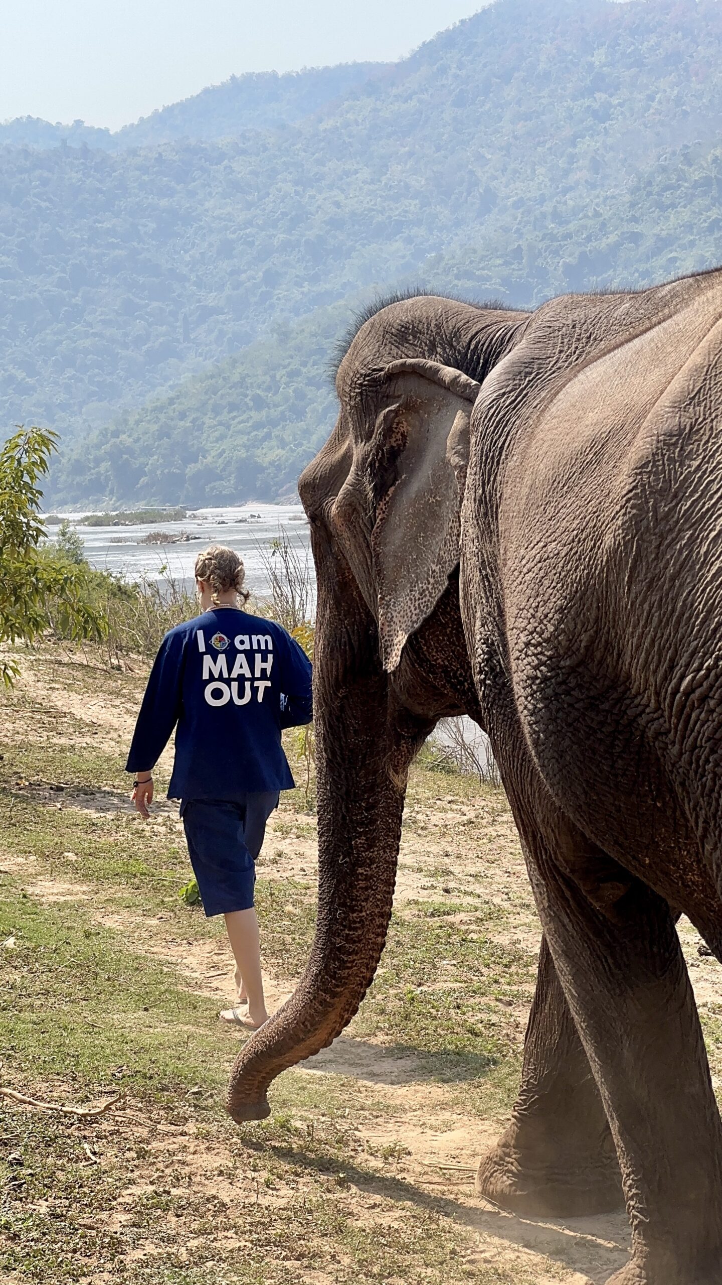 Nach ein wenig Recherche fanden wir ein Unternehmen, das sechs Elefanten hält und ein großes Reservat im Dschungel am Rande des Mekongs betreibt. Für 30 € pro Person durften wir auf den Wegen der Elefanten laufen, sie beim Baden beobachten und ihnen Bananen sowie Zuckerrohr zum Füttern anbieten.