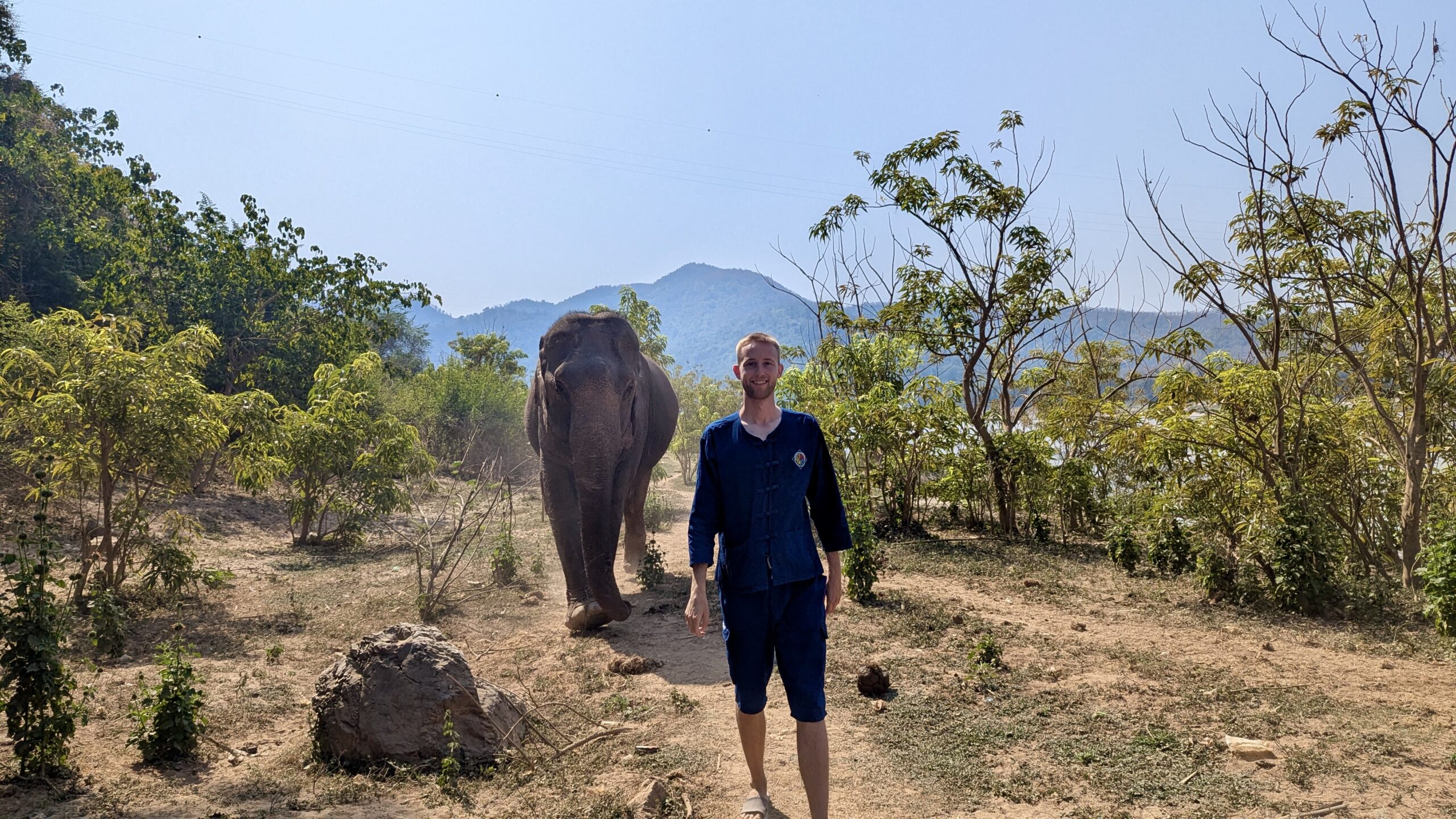 Danach ging es schließlich in das „Sanctuary for Elephants“. Wir mussten uns umziehen, damit unsere Klamotten nicht dreckig wurden, und dann ging es für Sascha und mich los – jeder mit einem Arm voll Zuckerrohr. Alleine und ohne Begleitung (außer einem Aufpasser) gingen wir den Pfad entlang, auf dem wir die riesigen Elefantenspuren sehen konnten. Schließlich bemerkten wir hinter uns die massige Gestalt eines Elefanten, der uns folgte.