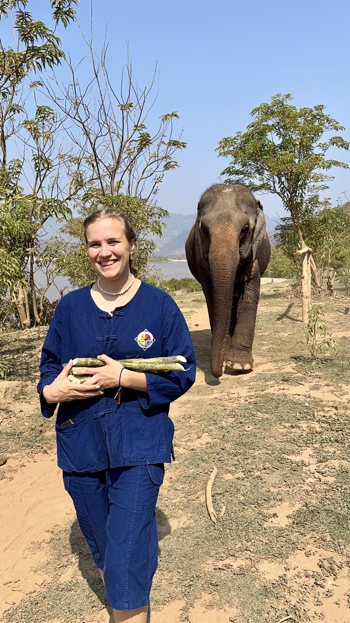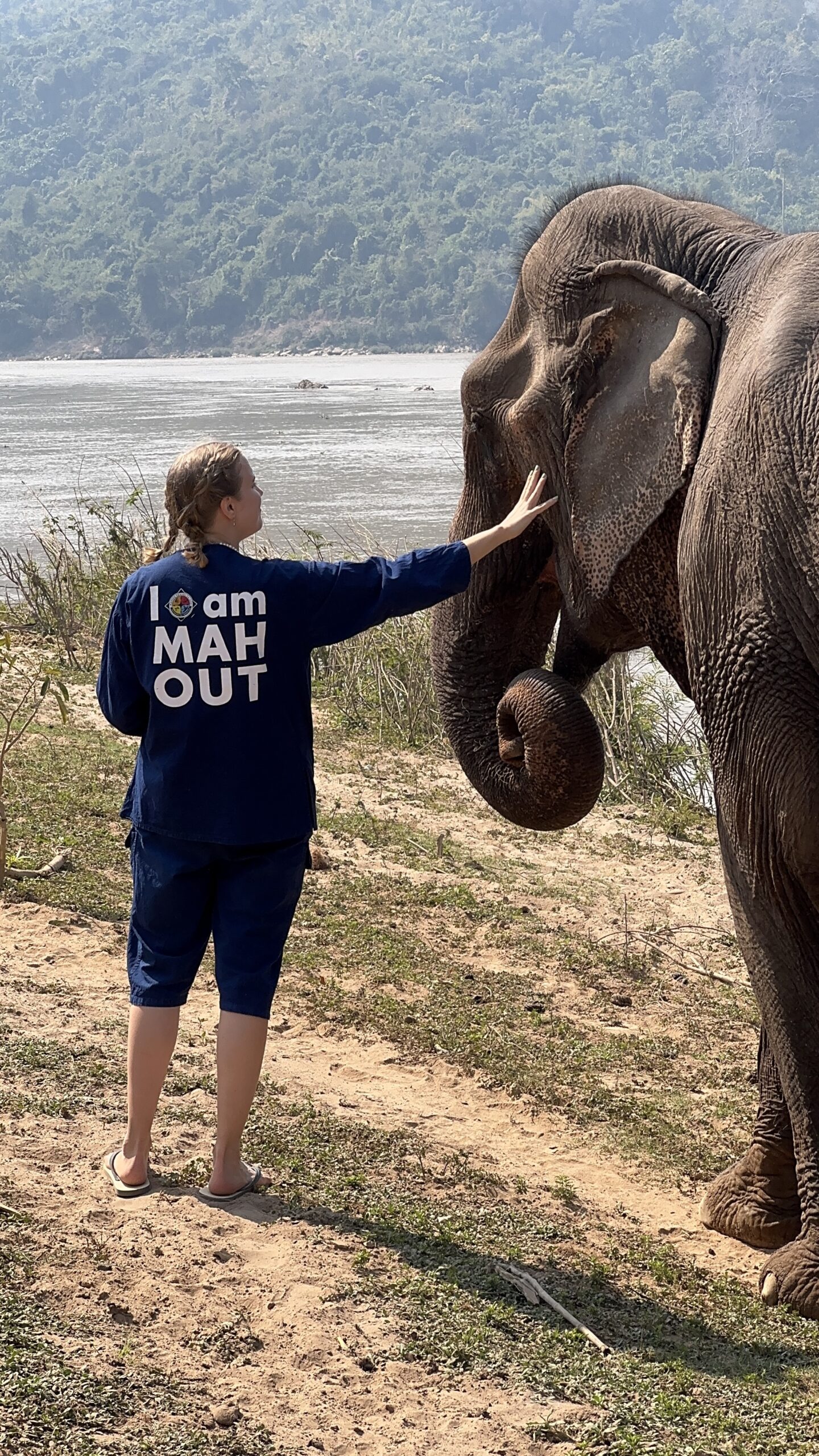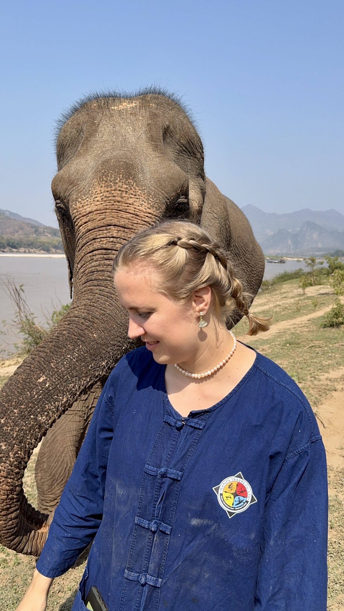 Für uns ging es dann auch wieder zurück zum Umziehen, aber uns erwartete ein riesiges Buffet oberhalb des Mekongs, bei dem wir so viel essen konnten, wie wir wollten. Weiter hinten auf dem Gelände tauchte aus dem Gebüsch ein weiterer Elefant auf und durchsuchte das Gelände vor uns nach Bananen. Auch hier bestaunten wir die Vertrautheit der Tiere mit den Menschen. Es schien sie nicht zu stören, dass wir nur wenige Meter entfernt unser Essen genossen und kleine Kinder aufgeregt auf den Elefanten zukamen, um ihn zu berühren.