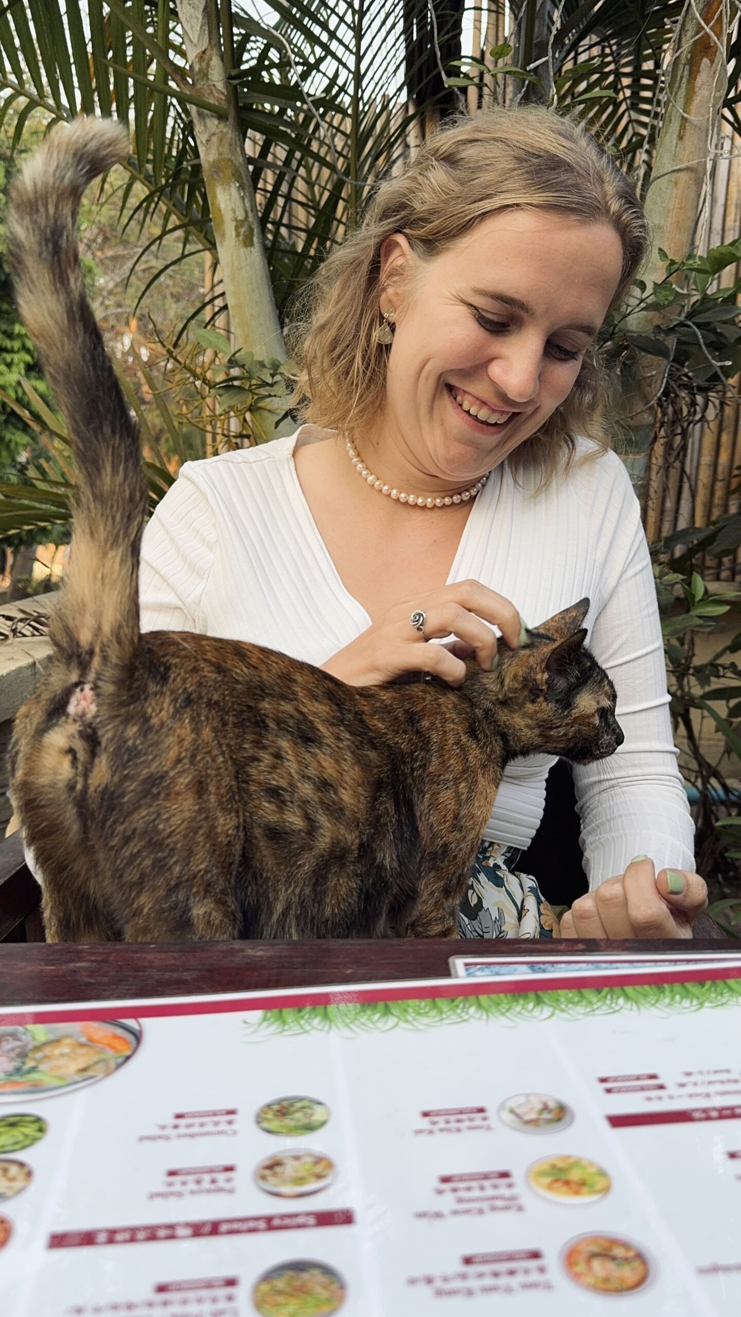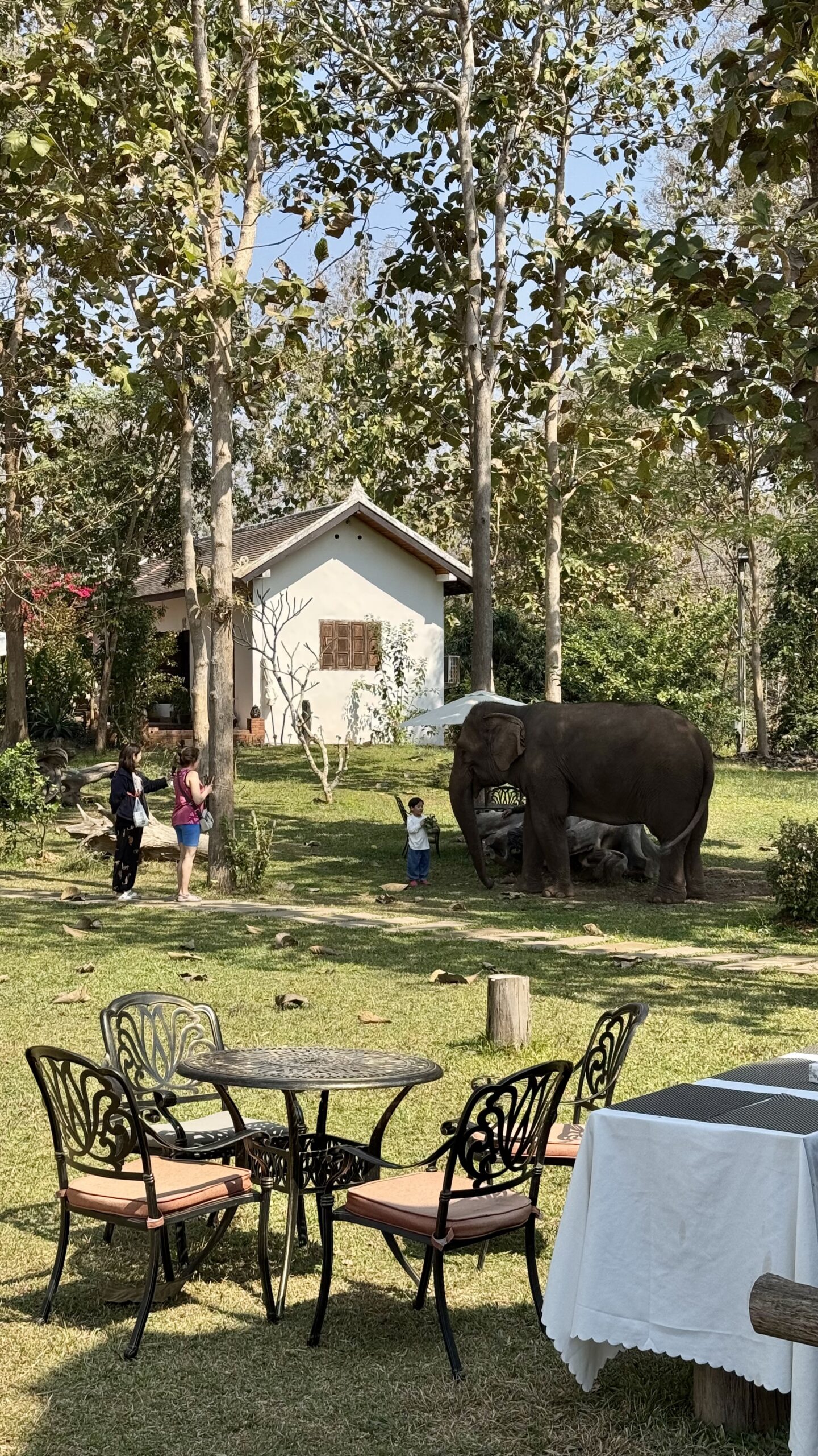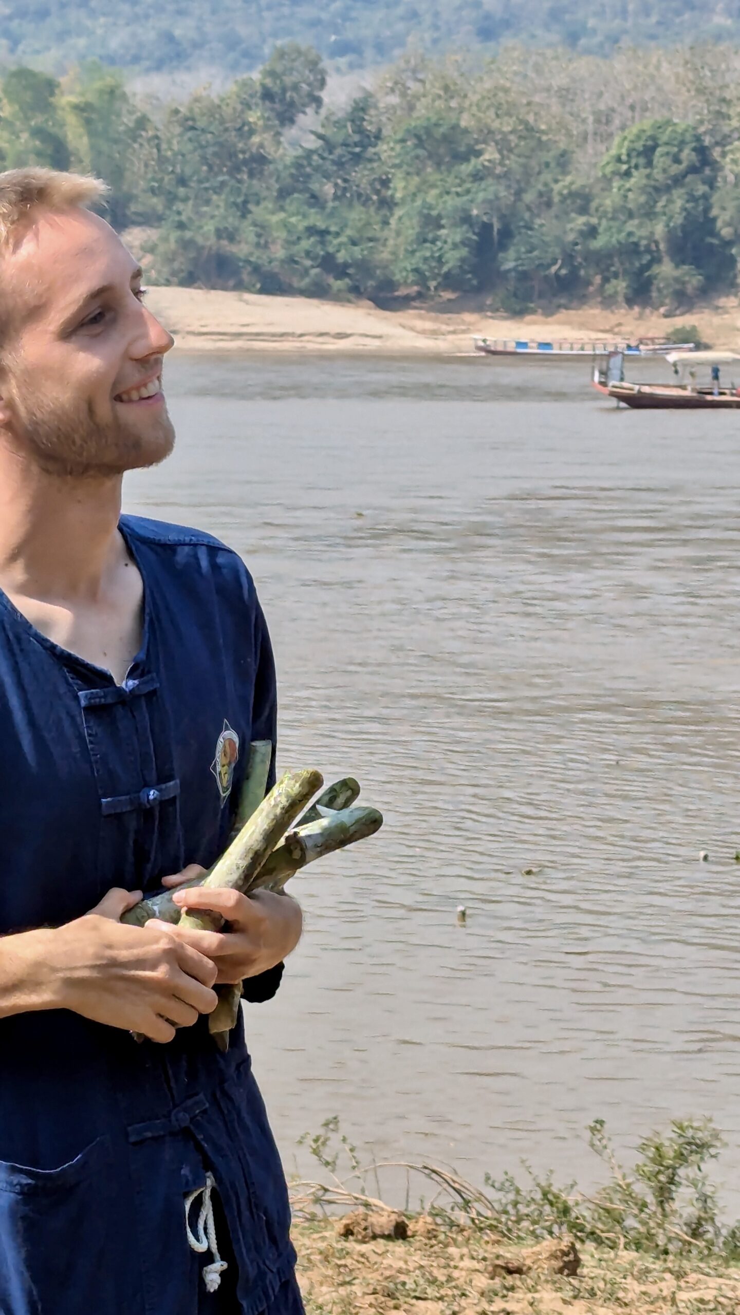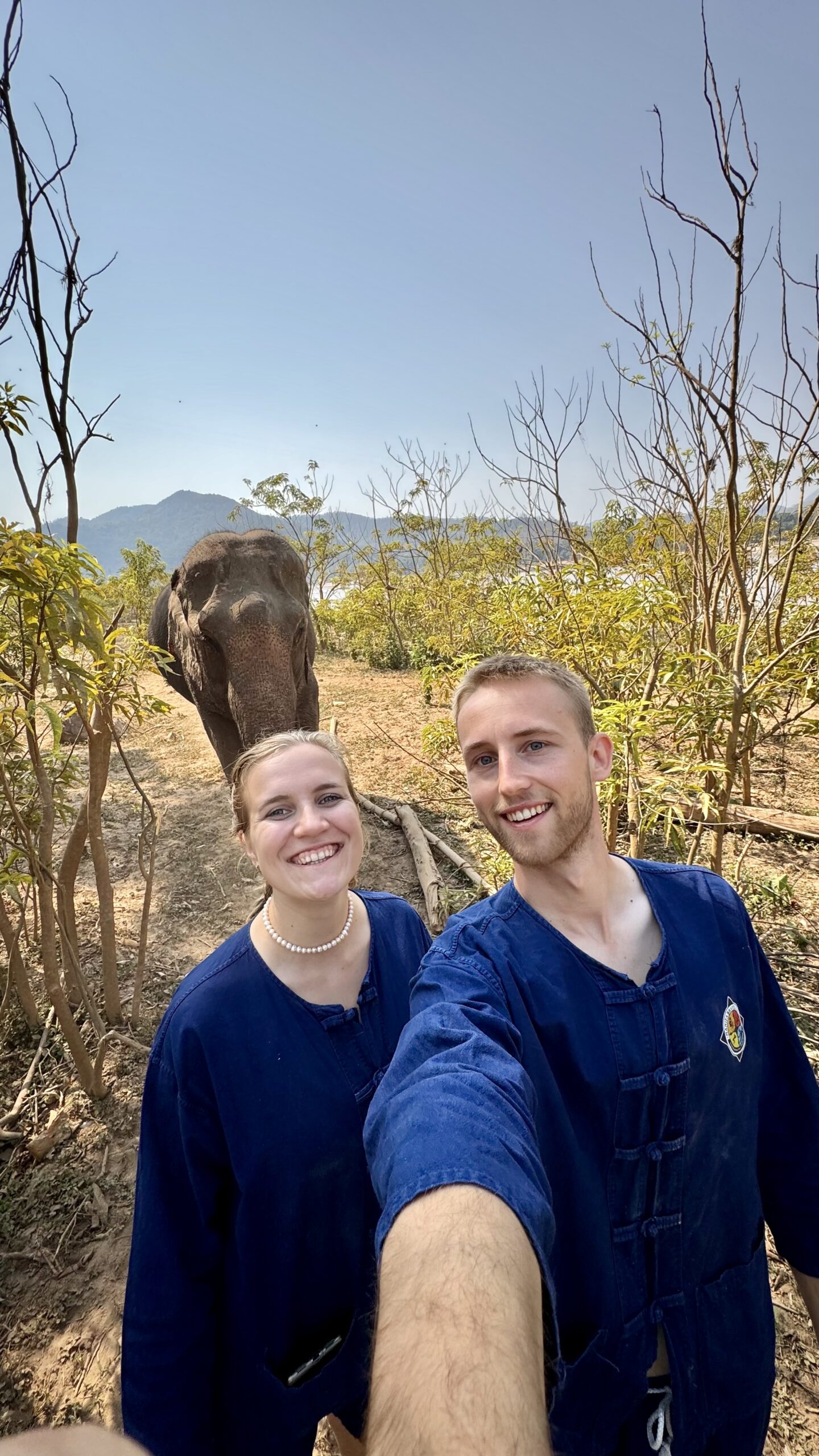 Für uns ging es dann auch wieder zurück zum Umziehen, aber uns erwartete ein riesiges Buffet oberhalb des Mekongs, bei dem wir so viel essen konnten, wie wir wollten. Weiter hinten auf dem Gelände tauchte aus dem Gebüsch ein weiterer Elefant auf und durchsuchte das Gelände vor uns nach Bananen. Auch hier bestaunten wir die Vertrautheit der Tiere mit den Menschen. Es schien sie nicht zu stören, dass wir nur wenige Meter entfernt unser Essen genossen und kleine Kinder aufgeregt auf den Elefanten zukamen, um ihn zu berühren.