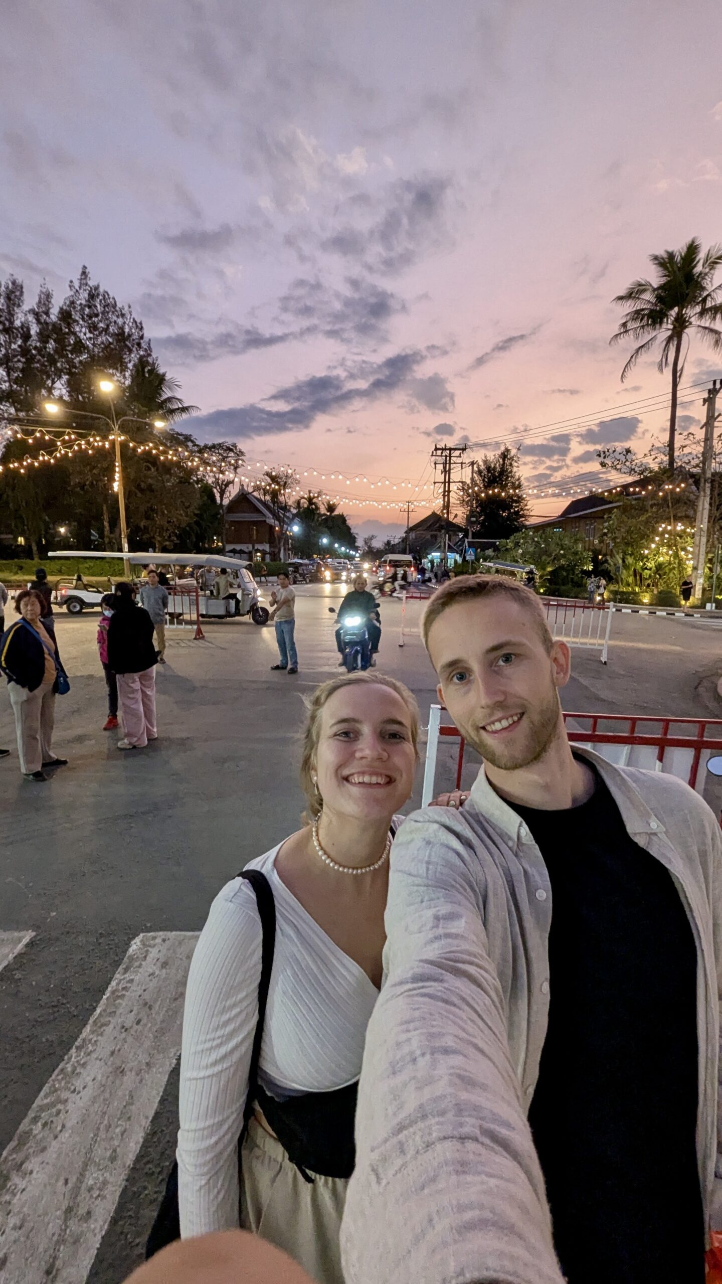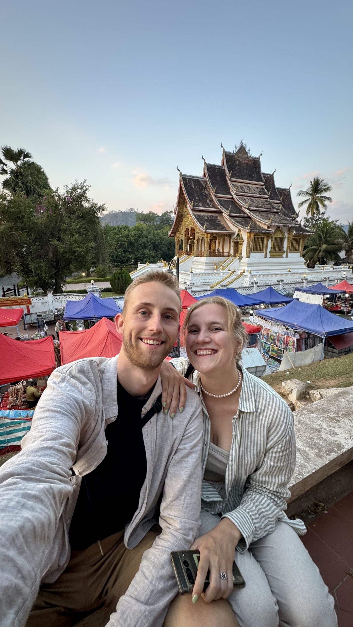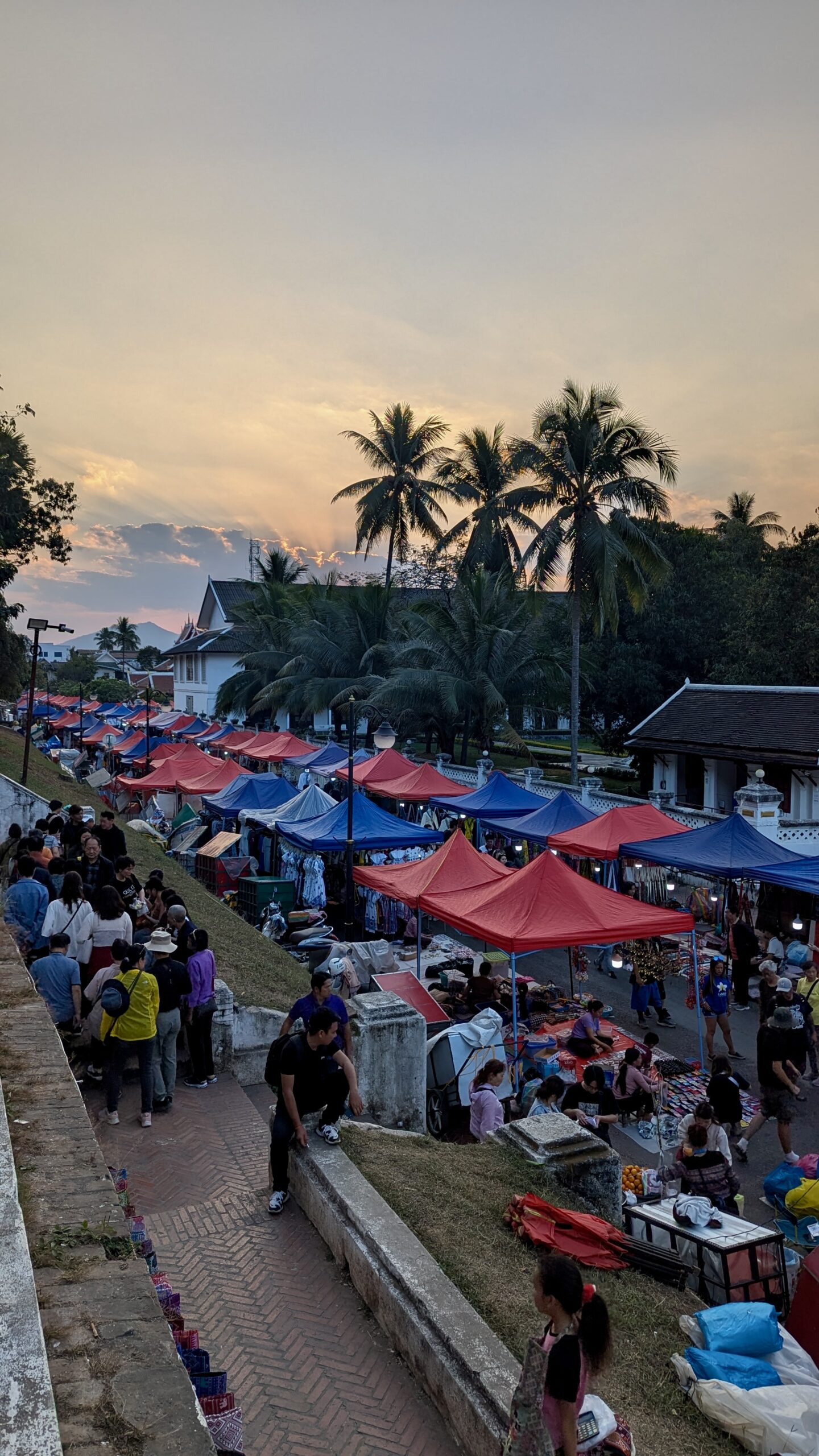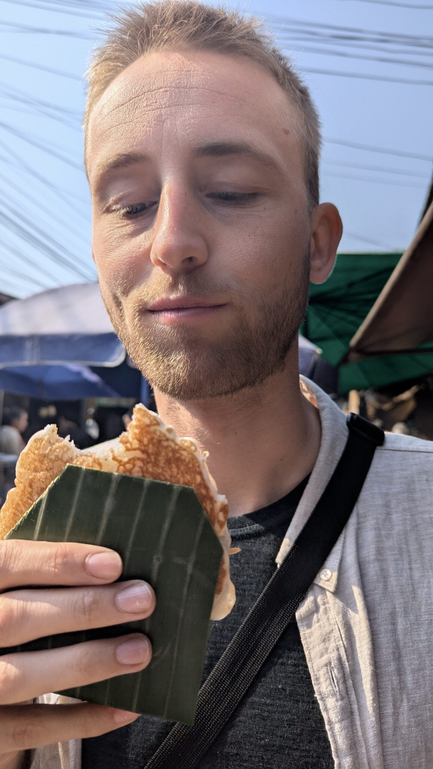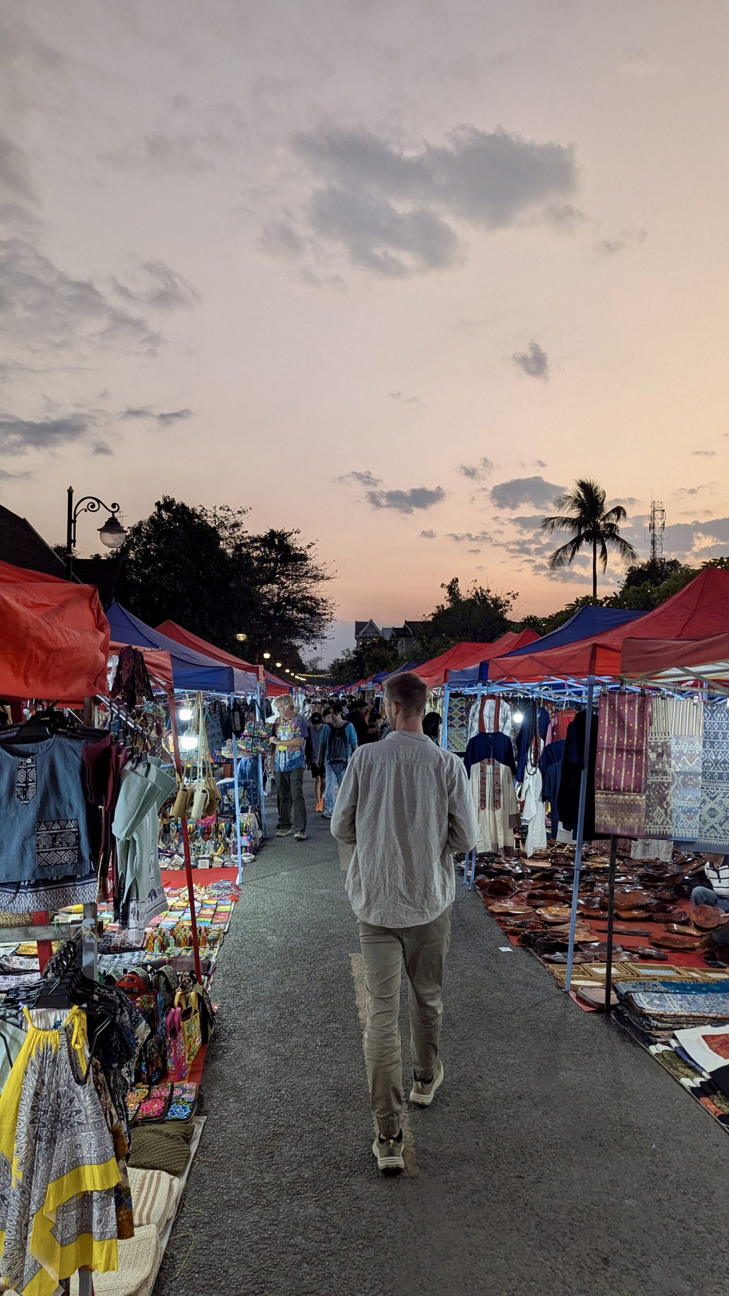 Zum Glück verdarb uns das aber nicht den restlichen Aufenthalt in Luang Prabang. Die Stadt ist schön angelegt, überall gibt es kleine Lokale, Geschäfte, Cafés und Restaurants. Aber das wohl Beste war der Morgen- und Nachtmarkt. Hier kann man für super wenig Geld überall Essen kaufen und kleine Souvenirs finden. Wir liebten es, nachts über den Markt zu schlendern. Sascha bestellte sich mehrmals für 1,50 € richtig leckeres thailändisches Pad Thai, und ich probierte mich durch indisches, koreanisches und laotisches Streetfood. Morgens suchten wir uns Kokosnuss-Pancakes, die wir uns täglich gönnten und die uns zum Glück auch gut sättigten. Kleine Bäckereien boten Croissants und Bananenkuchen, die wir uns schmecken ließen und die uns ebenfalls gut satt hielten. Kurz gesagt, wir liebten Luang Prabang – vor allem wegen der leckeren Essensauswahl und weil es wunderschön ist.