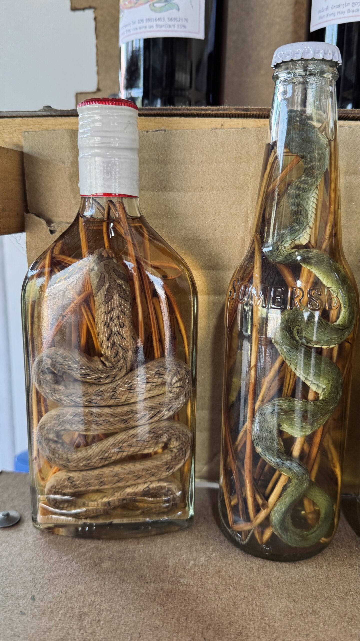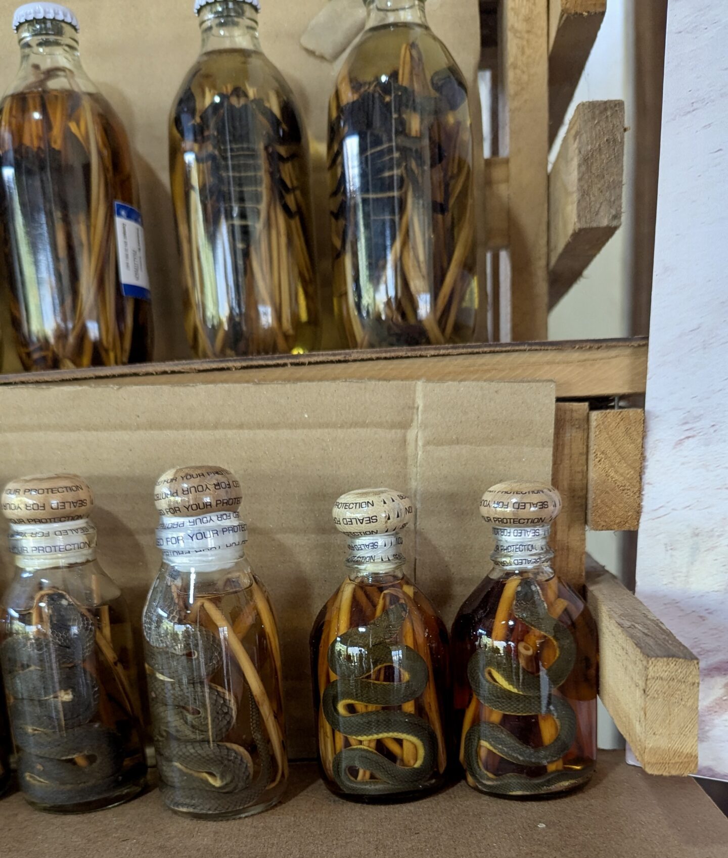 Außerdem durften wir den fermentierten Reis bestaunen, aus dem der Whisky gewonnen wird. Ich hielt mich vom Probieren fern – mir reichten Saschas Aussagen: „Schmeckt ganz okay, aber jetzt auch nicht besonders gut.“ Natürlich konnte man diesen Whisky hier auch kaufen, entweder mit einer Schlange darin, mit einem Skorpion oder vielleicht lieber mit einem Riesentausendfüßler? Mich schüttelte es bei dem Gedanken schon am ganzen Körper.