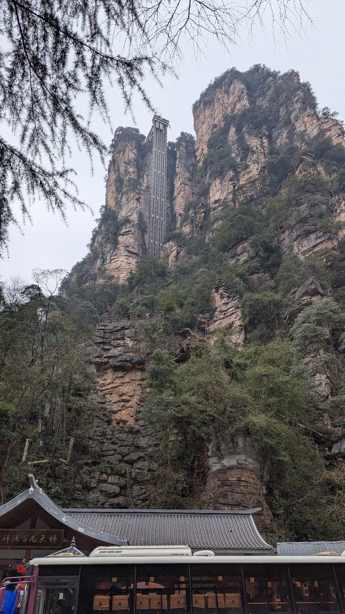 Nach den 16,8 km nahmen wir dann die Seilbahn (kostet pro Person ca. 16 € extra) hinunter vom Berg und stiegen dort wieder in einen Shuttlebus. Jetzt wollten wir zum Aufzug. Wir hatten online viel darüber gelesen und zahlreiche Videos gesehen – besonders über die extrem langen Warteschlangen, in denen man bis zu drei Stunden anstehen muss, nur um überhaupt ins Gebäude zu kommen, in dem der Aufzug startet.