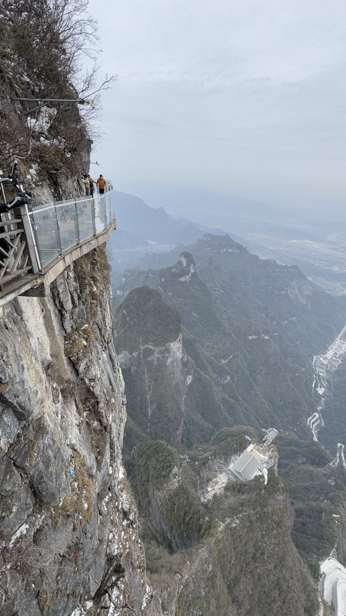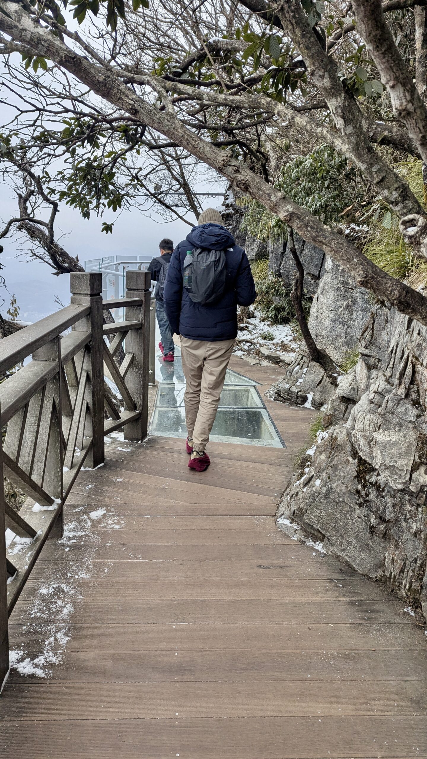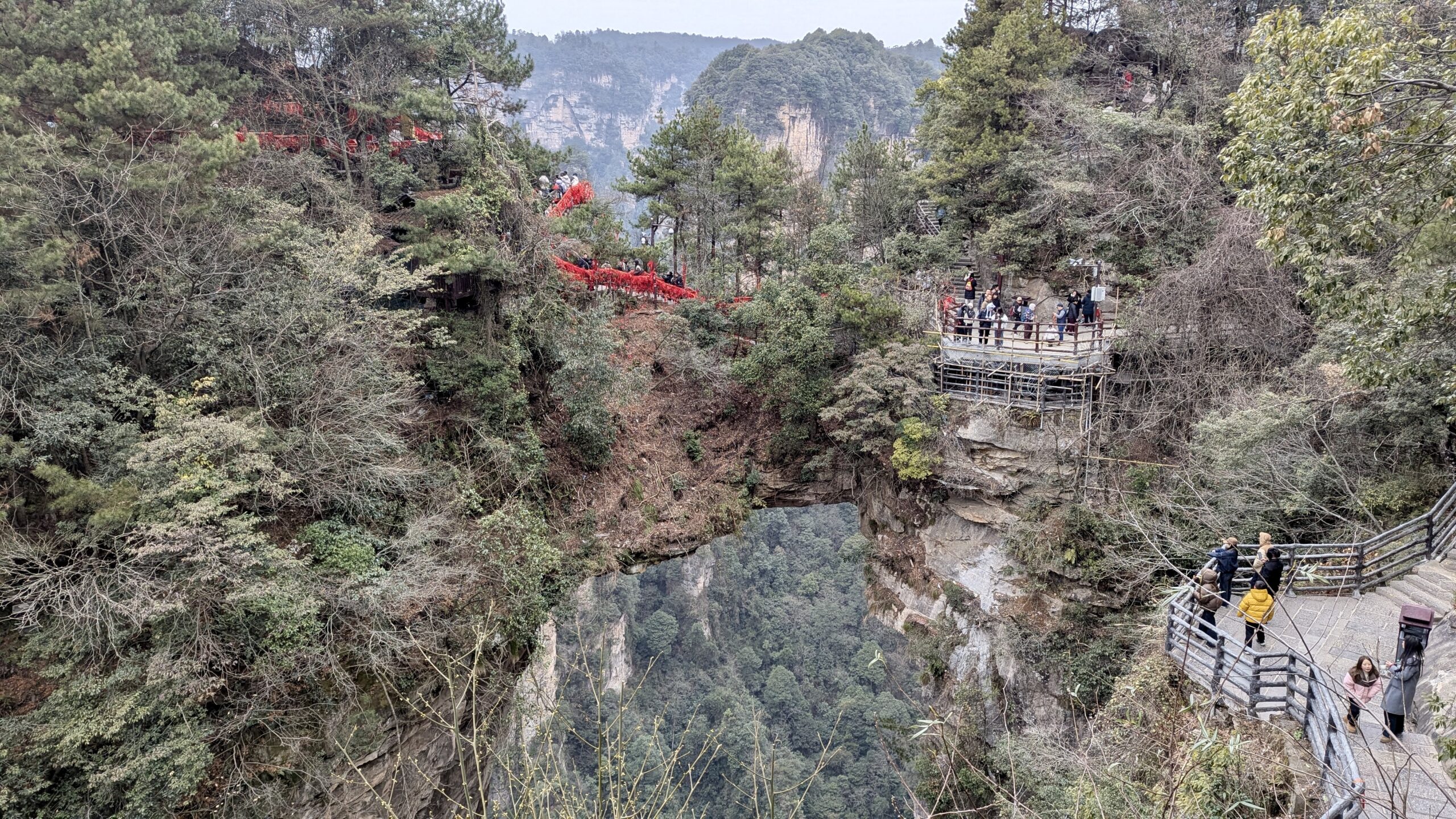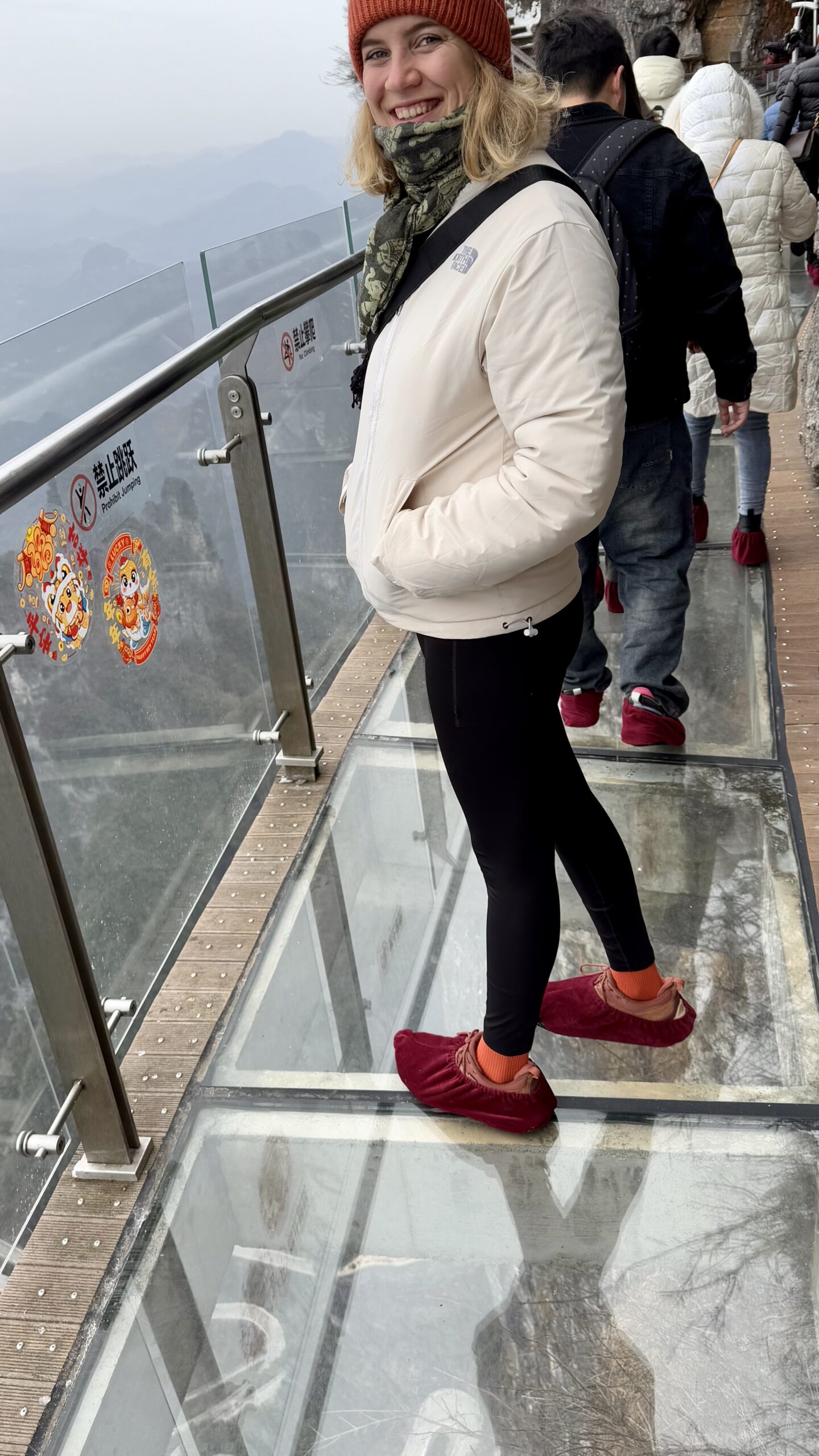 Trotzdem entschlossen wir uns, noch über eine der berüchtigten Glasbrücken zu laufen. Diese führen direkt am Rand des Berges entlang – unter einem gähnt die Tiefe. Wir wussten zunächst nicht, dass man dafür ein separates Ticket kaufen muss. Es stand aber auch nirgendwo ein Schild mit „Haben Sie Ihr Ticket gekauft?“. Wobei – vielleicht stand das ja irgendwo auf Chinesisch. Wir hatten uns jedenfalls keines der Schilder übersetzt.