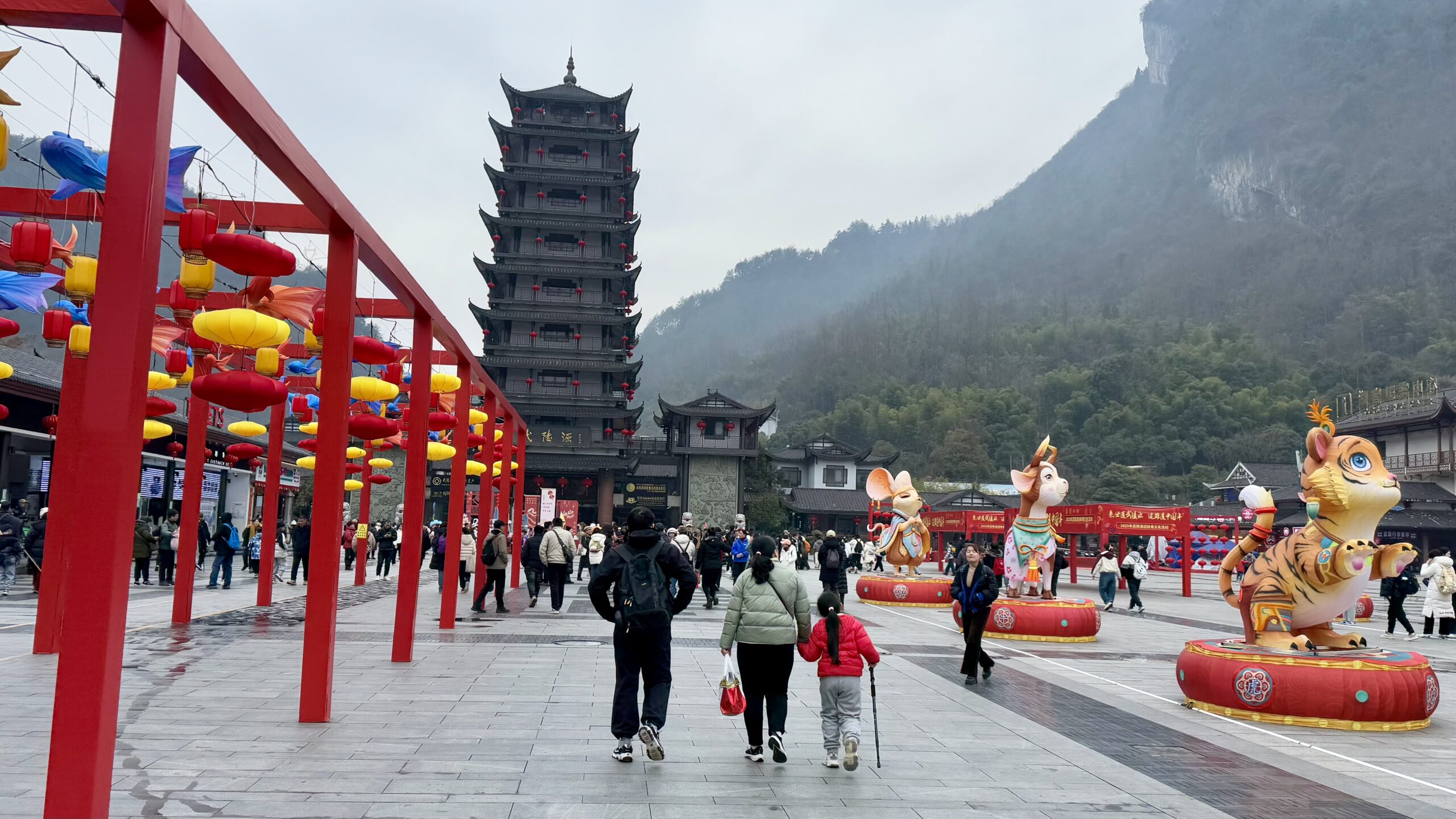 Die meisten Menschen strömten direkt zum Bus, der sie zum Aufzug bringt. Dieser ist der größte Außenaufzug der Welt und führt an einem der riesigen Berge hinauf. Wir hatten beschlossen, das auf später zu verschieben. Unser Weg führte uns zuerst zur 10-Mile-Gallery. Die meisten Einheimischen stiegen vom Shuttlebus in einen kleinen Zug um, um die knapp 2 km lange Strecke bis zum Eingang der Galerie zurückzulegen. Sascha und ich beschlossen jedoch, das Geld zu sparen und die Strecke stattdessen zu Fuß zu gehen.