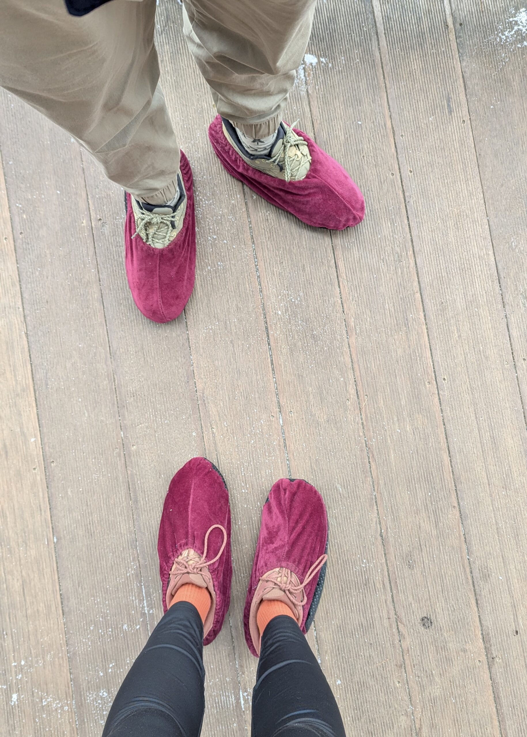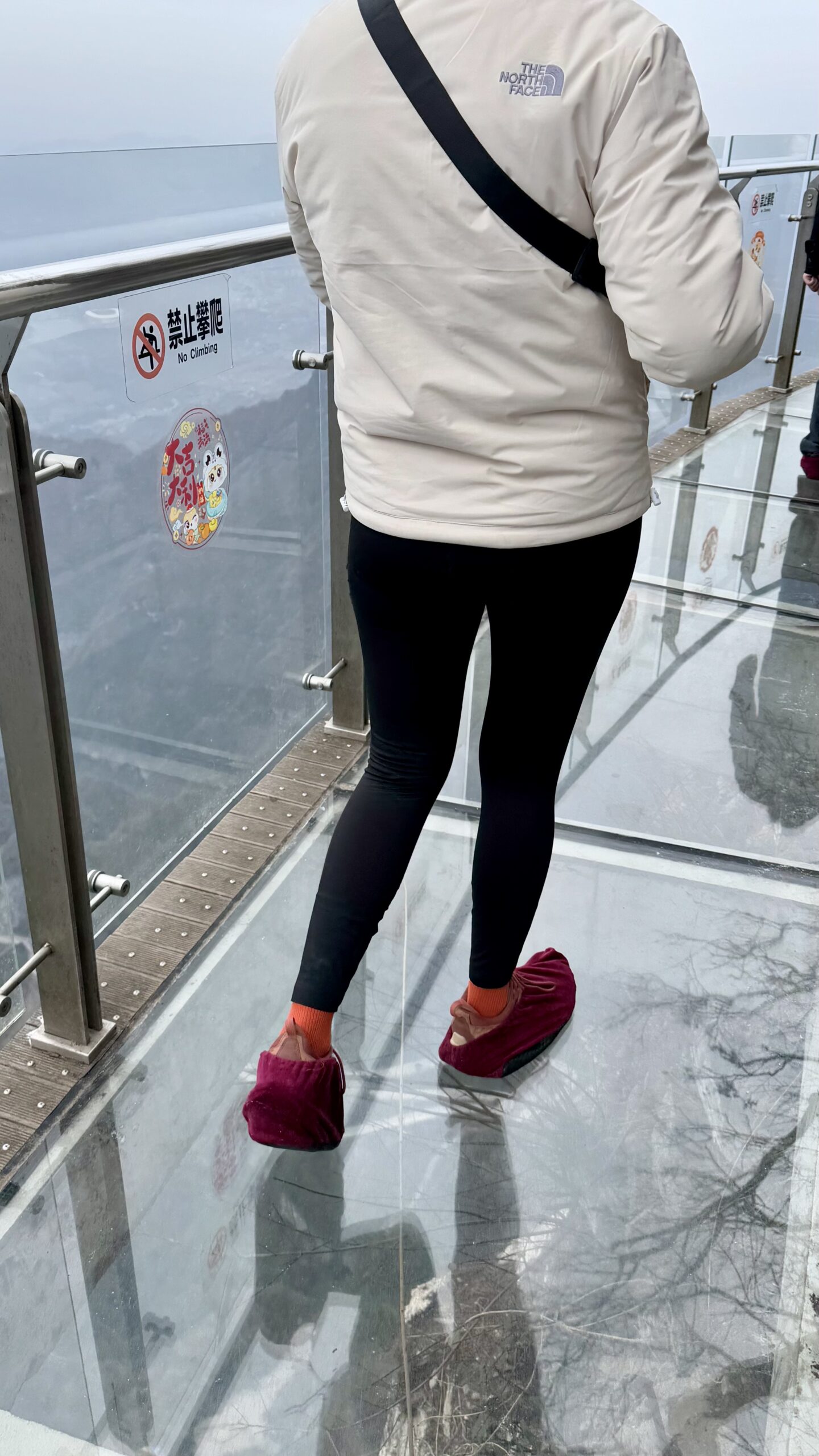 An der Brücke zieht man sich zunächst pinke Überschuhe über, um das Glas nicht mit schmutzigen Schuhsohlen zu verschmutzen. So bleibt die Sicht nach unten für alle erhalten – ziemlich clever!