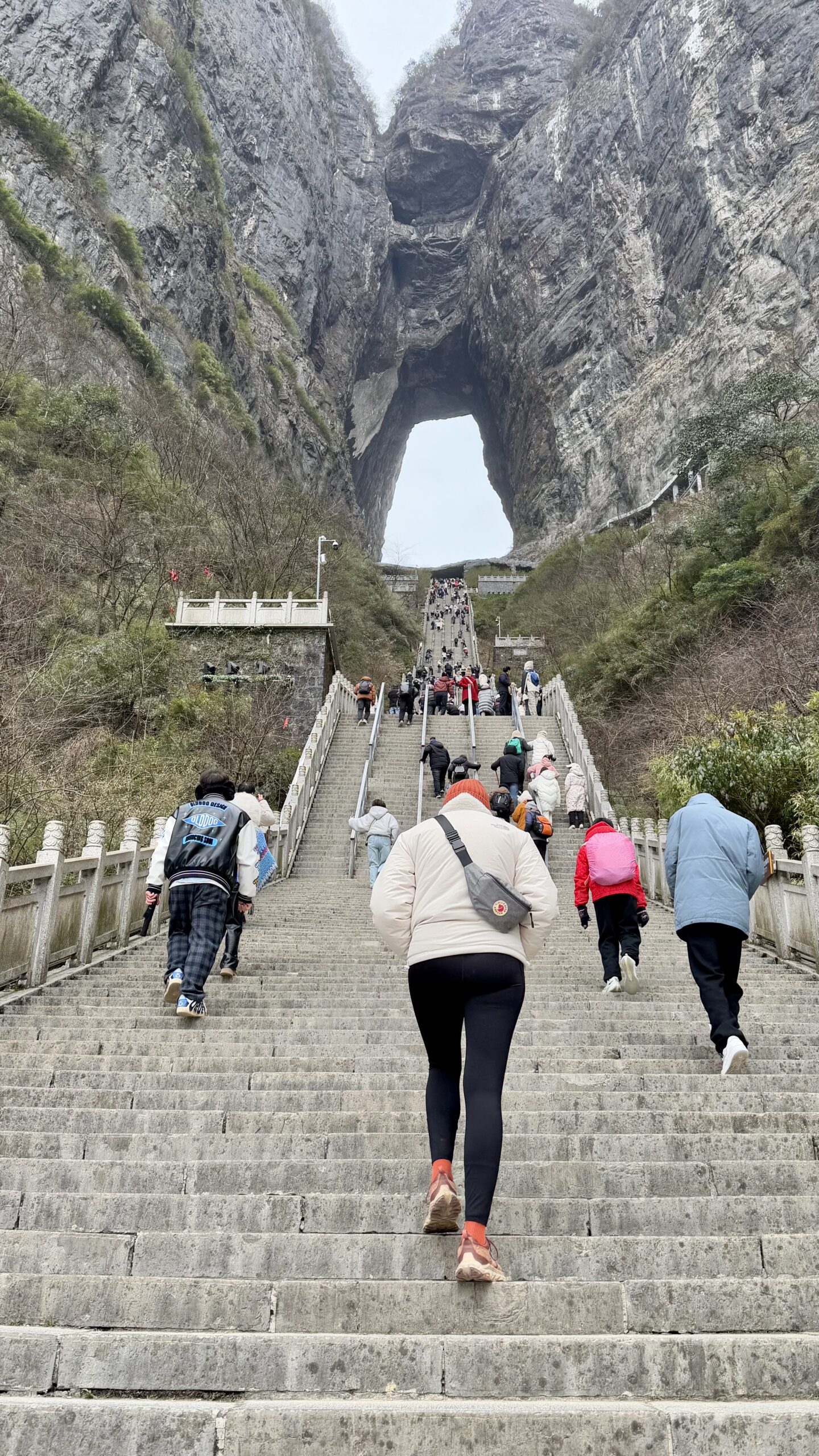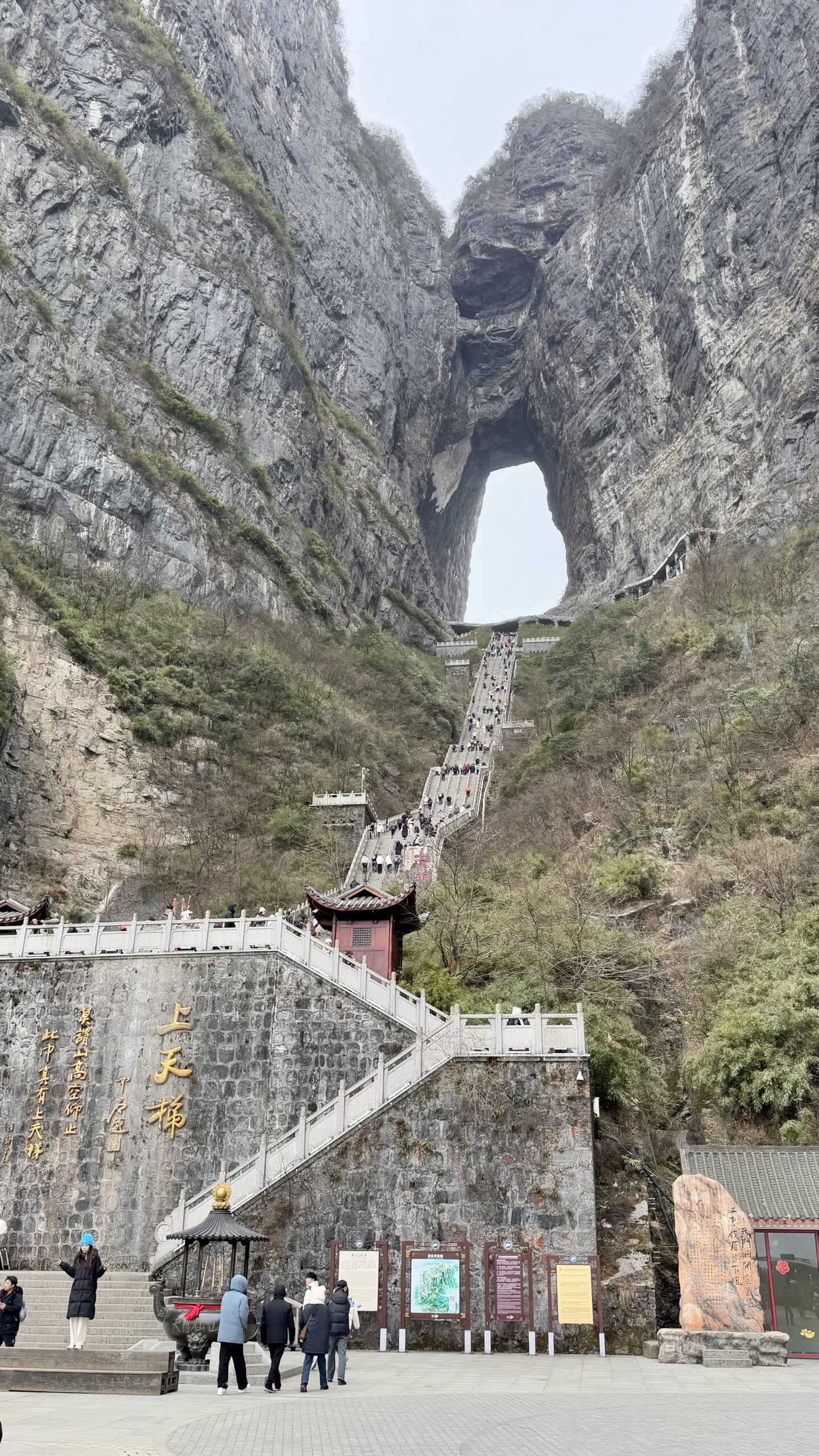 Die Treppen, die wir hier gerade hochgelaufen waren, kann man übrigens auch mit einer Rolltreppe überwinden – diese versteckt sich im Inneren des Berges. Erst ab dem Himmelstor geht es für alle Besucher dann mit einer weiteren Rolltreppe weiter. Allein mit diesen Rolltreppen verbrachten wir etwa 15–20 Minuten. Die Chinesen sind kein Völkchen, das gerne läuft – auch nicht auf Rolltreppen. Da staut man sich lieber.