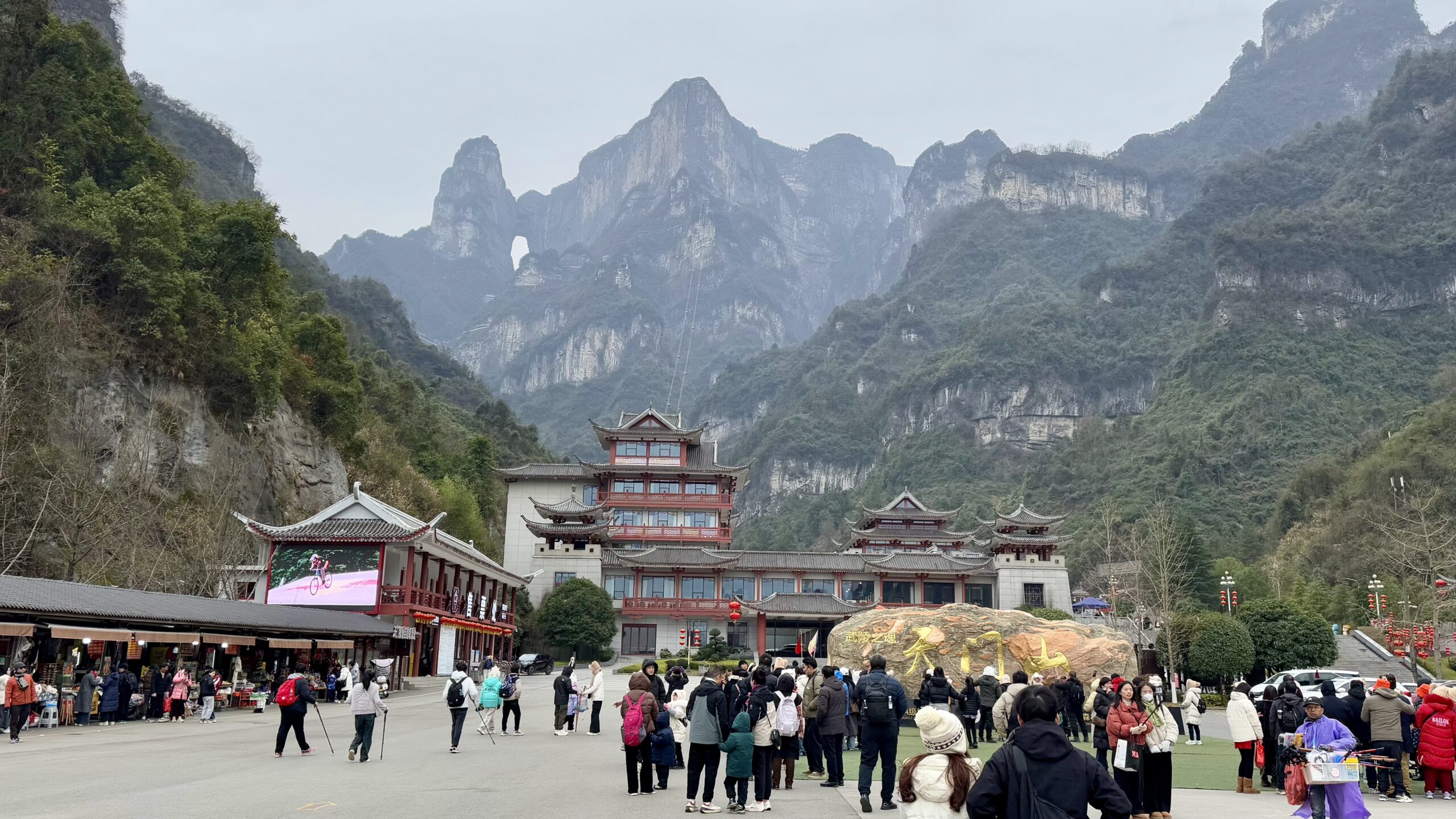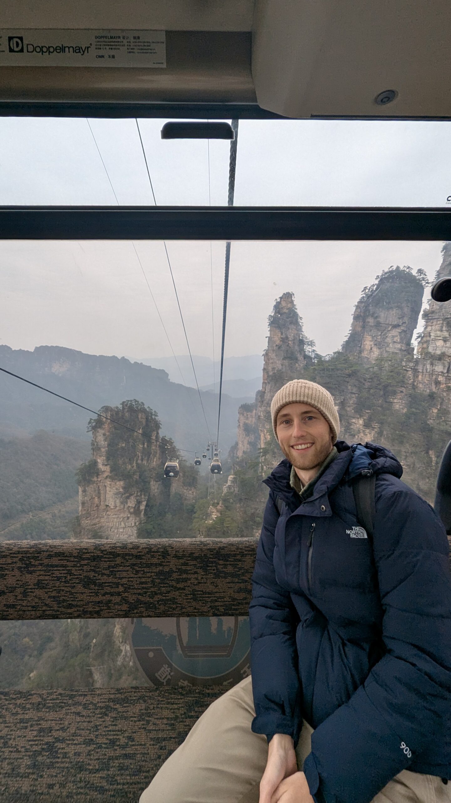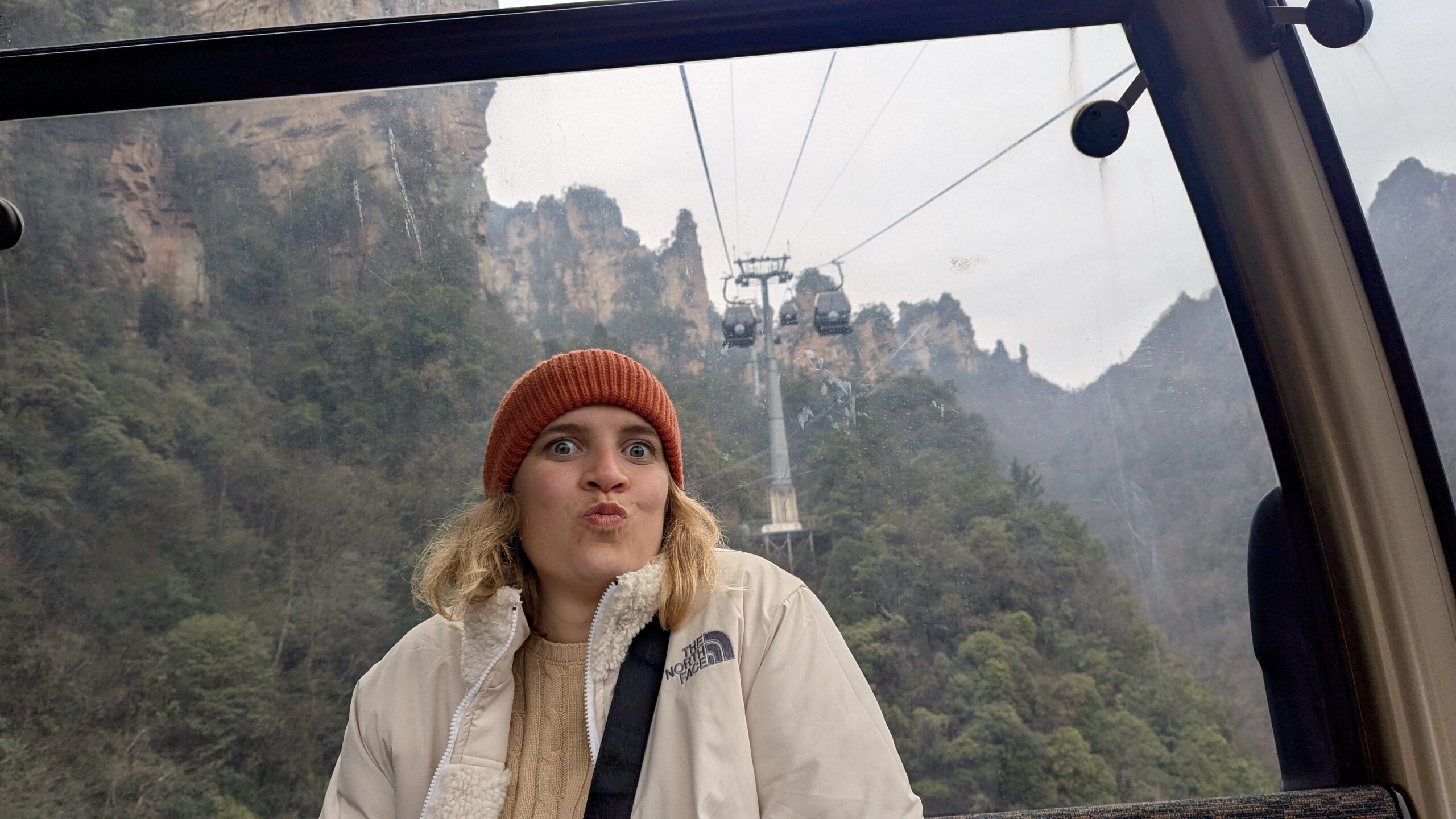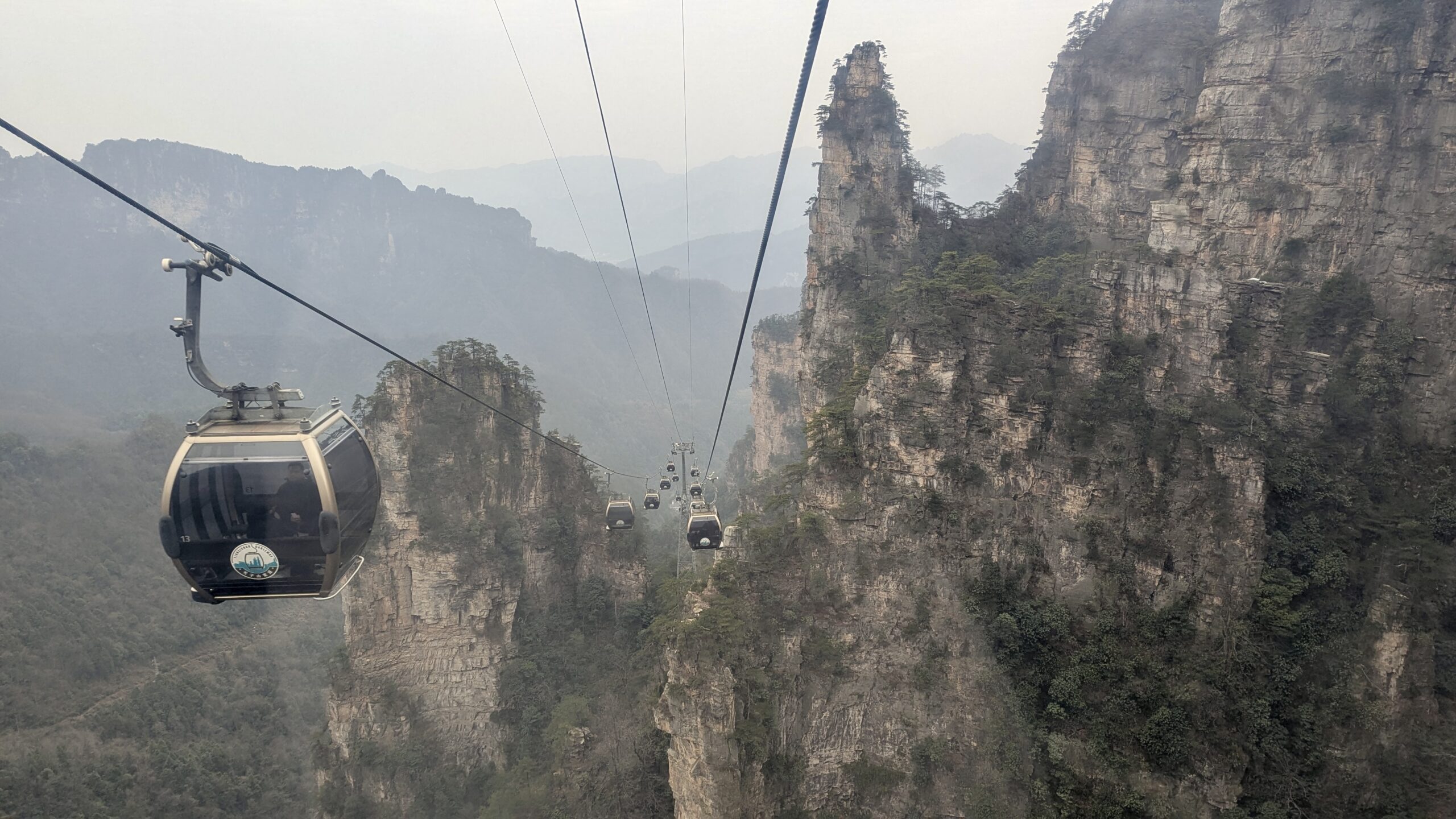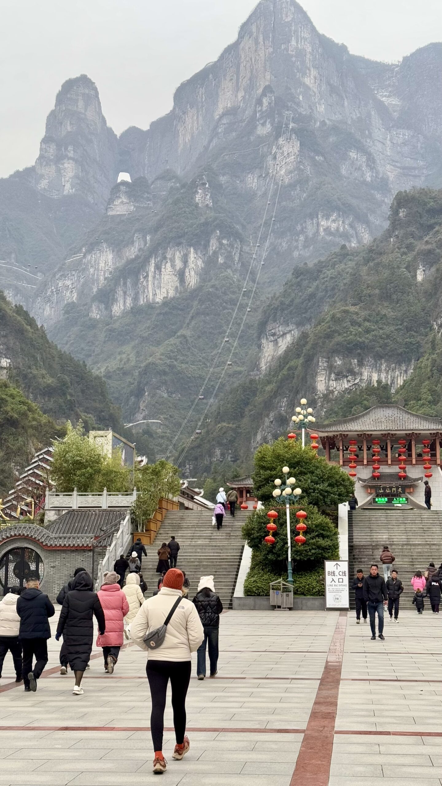 Der nächste Morgen begann wieder früh. Wir wollten noch das zweite Highlight von Zhangjiajie bestaunen: den Tianmen Mountain – mehr oder weniger der Hausberg der Stadt. Da der Startpunkt keine zehn Minuten Fußweg von unserem Hotel entfernt lag, liefen wir morgens entspannt dorthin und wurden mit einem Bus zum Berg gefahren. Von dort aus nahmen wir eine Seilbahn nach oben.