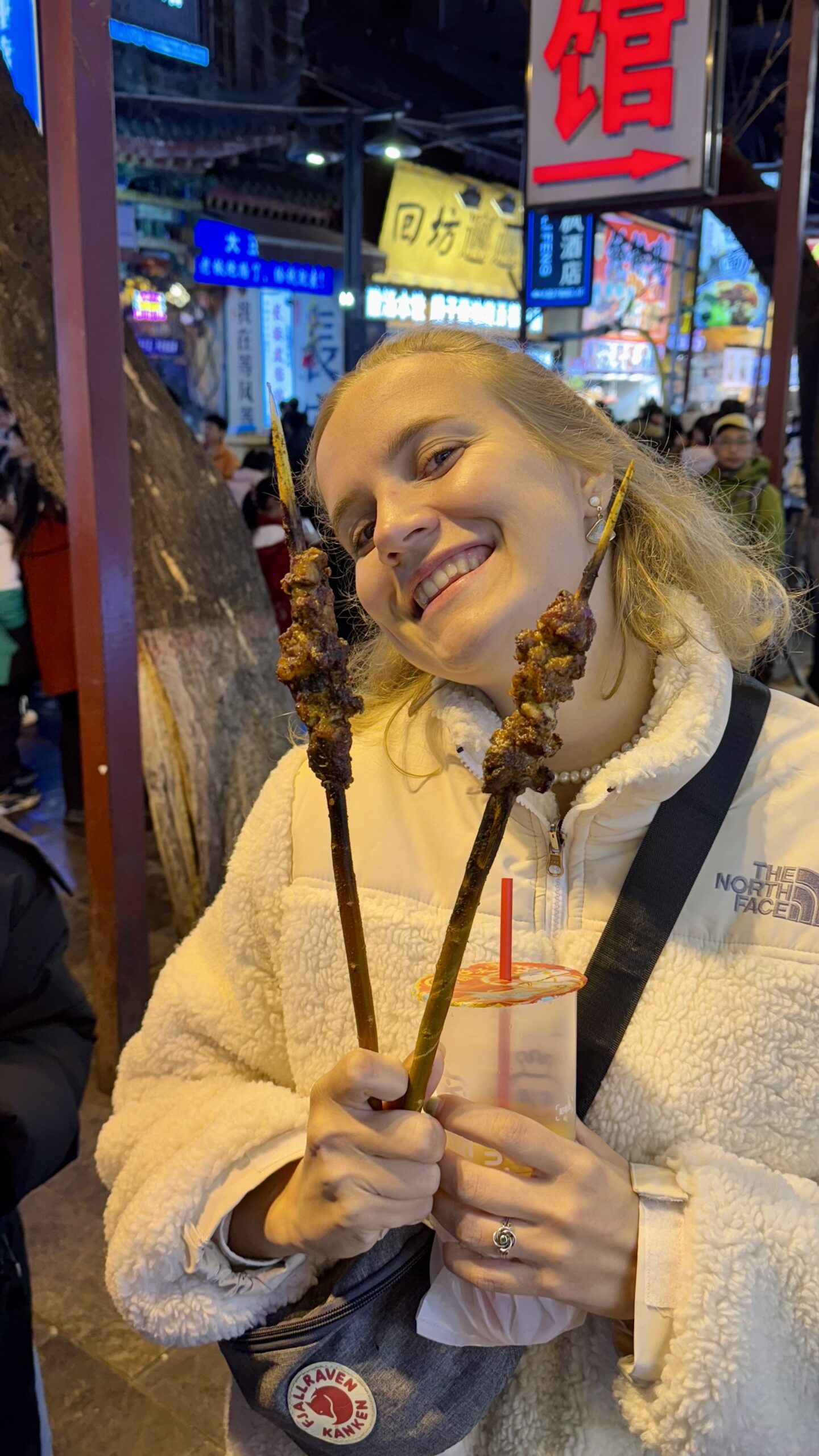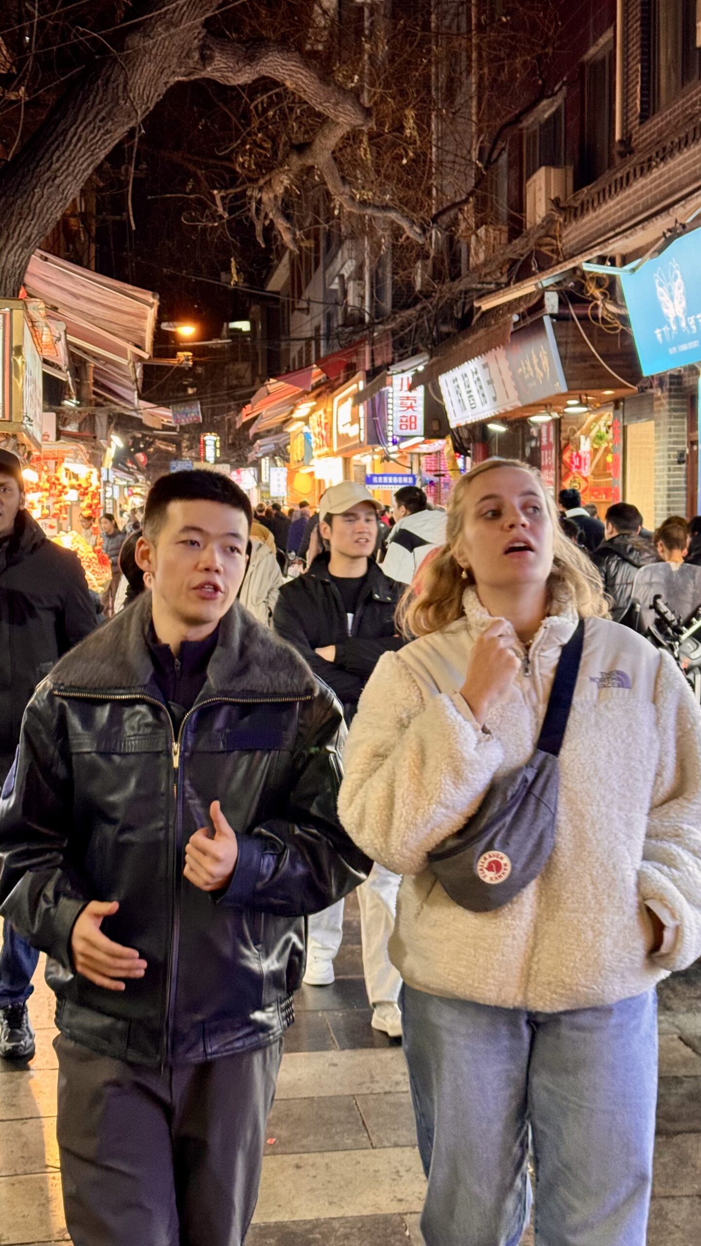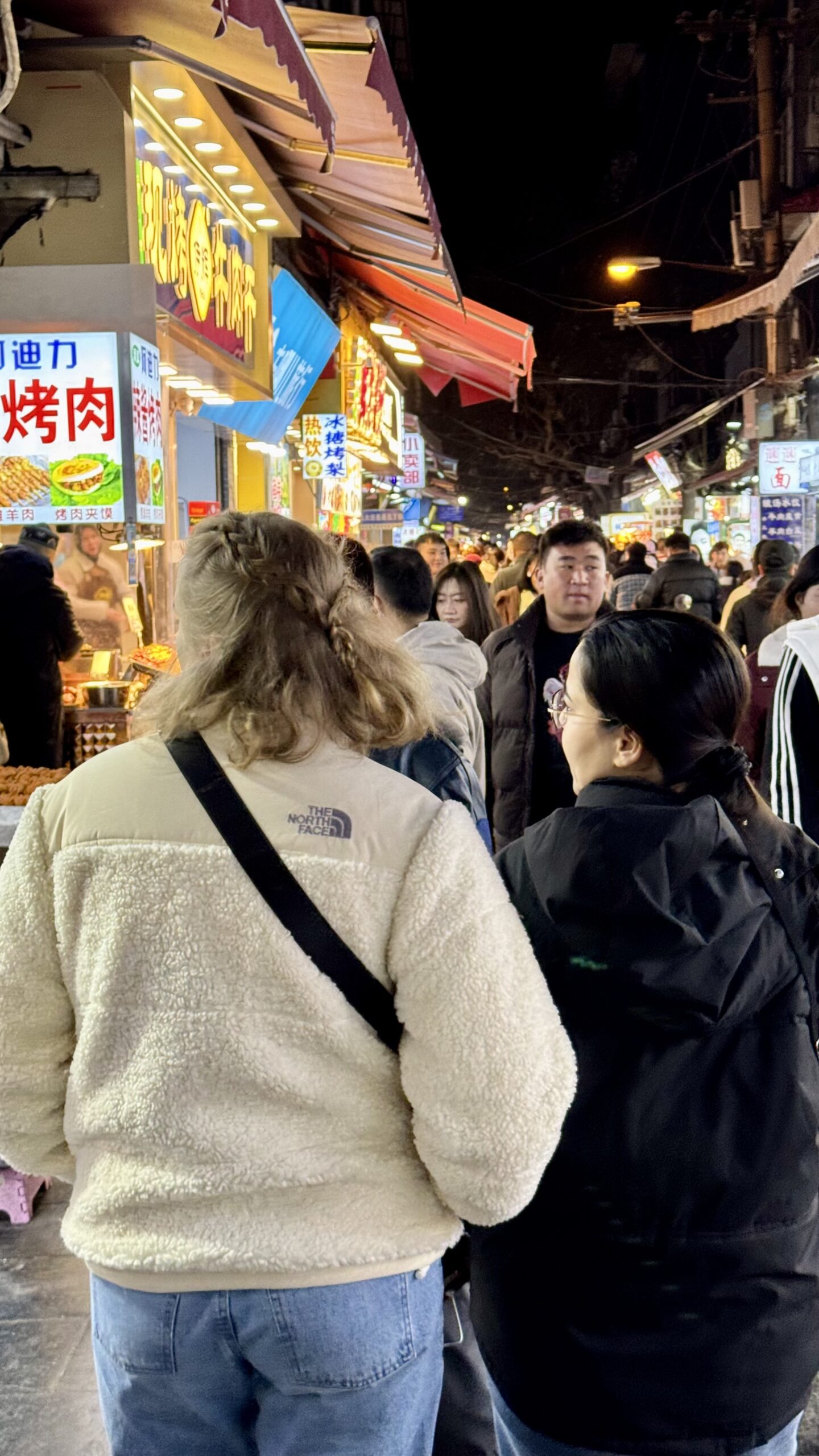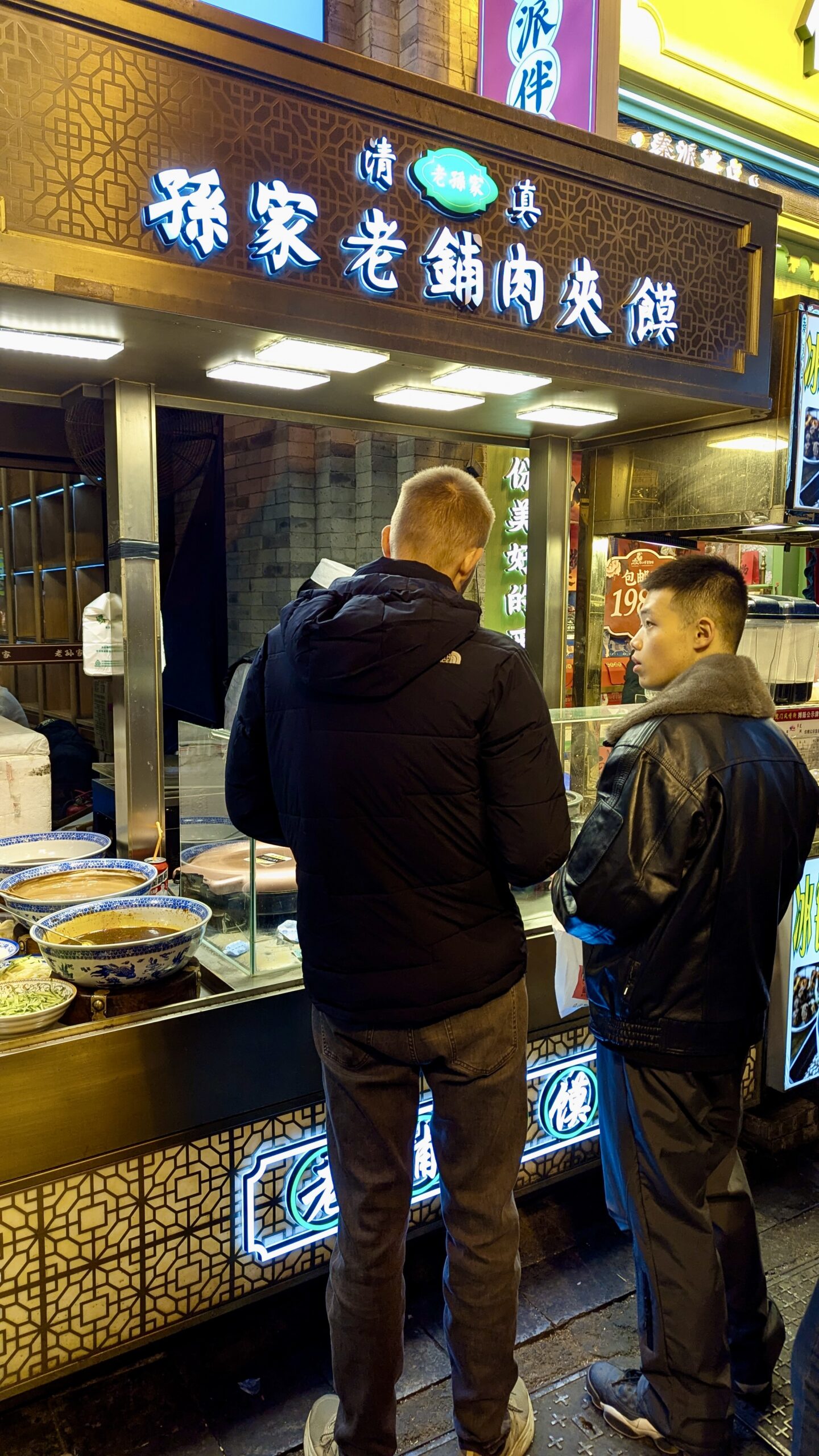 Nachts war die Straße besonders beeindruckend – wunderschön beleuchtet und voller Leben. Man konnte das pulsierende Nachtleben förmlich spüren. Während wir noch ein wenig durch die Straßen schlenderten, halfen wir Xinyang, ein Mitbringsel für seine Freundin in Harbin zu finden. Danach führte uns Wang gegen 0:30 Uhr in ein chinesisches BBQ-Restaurant.