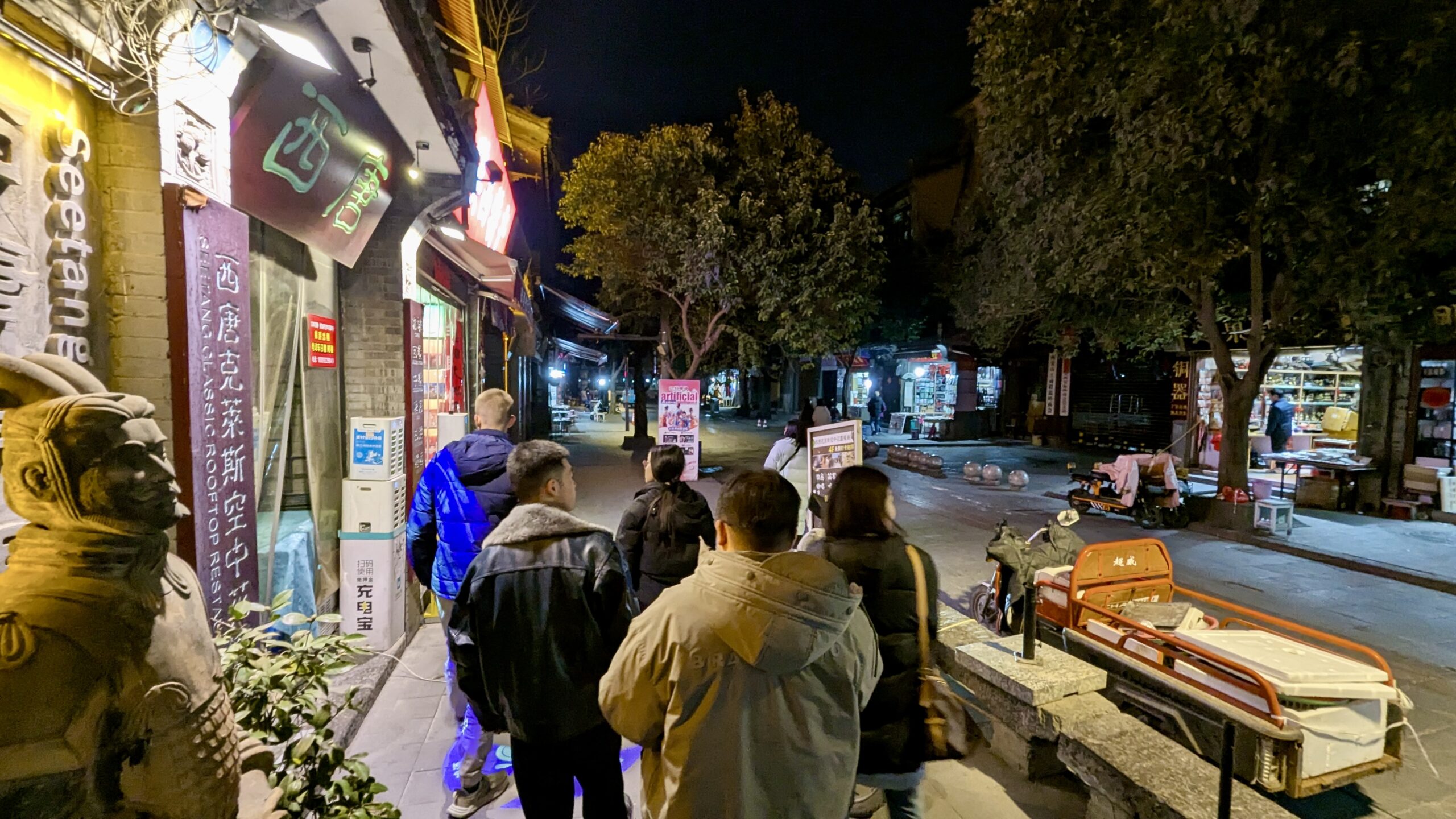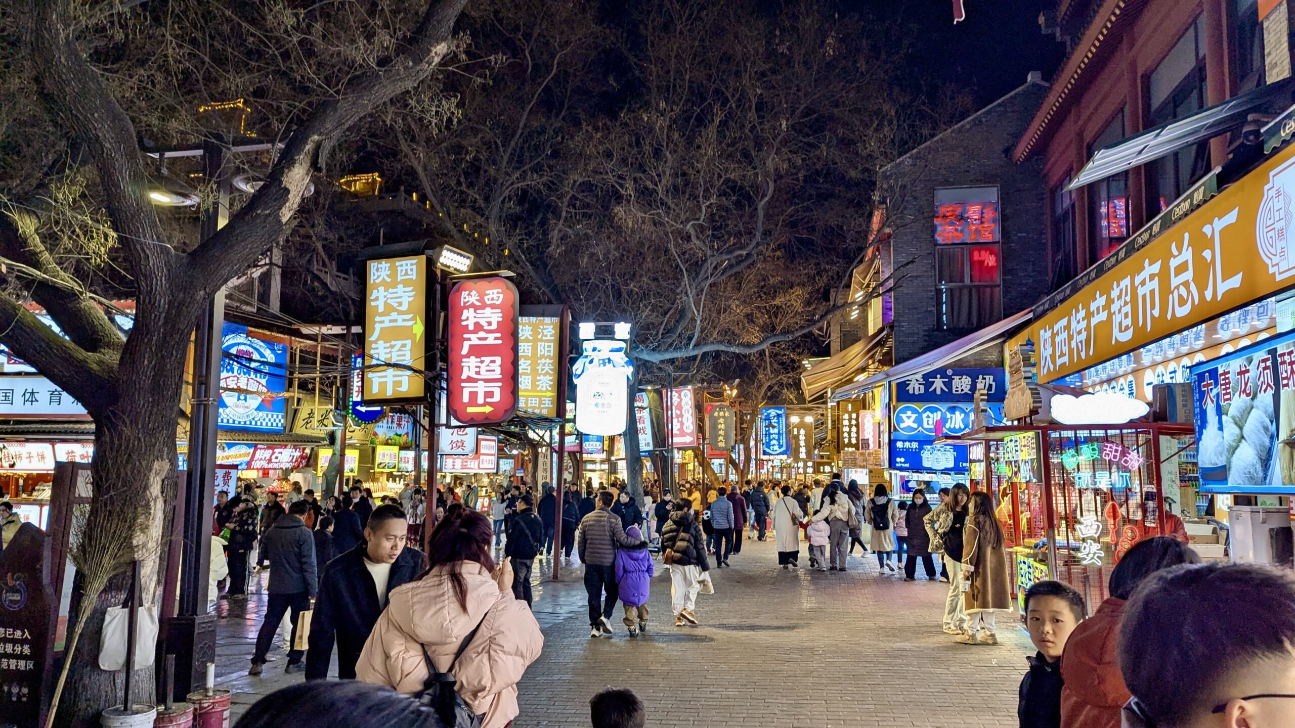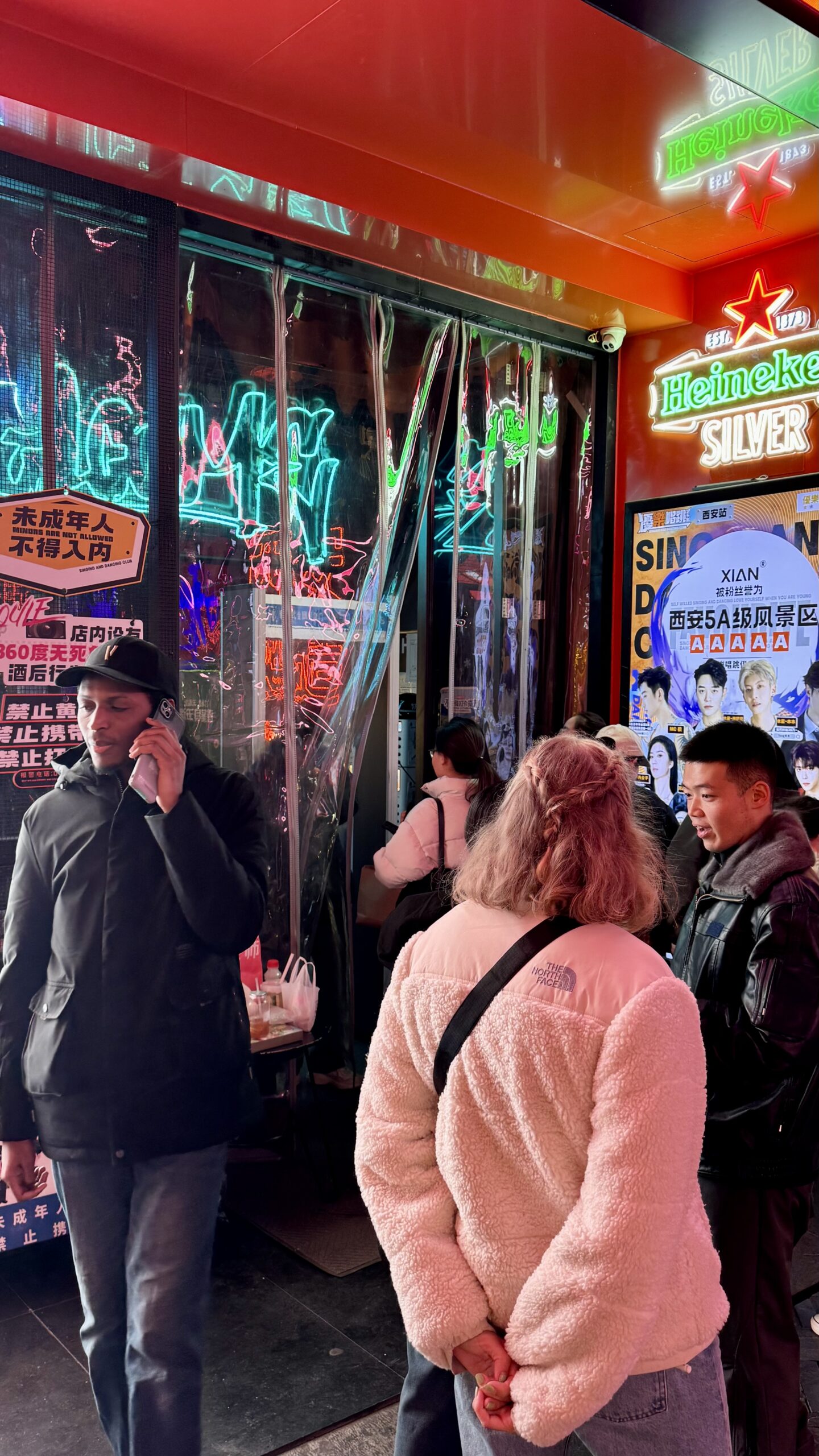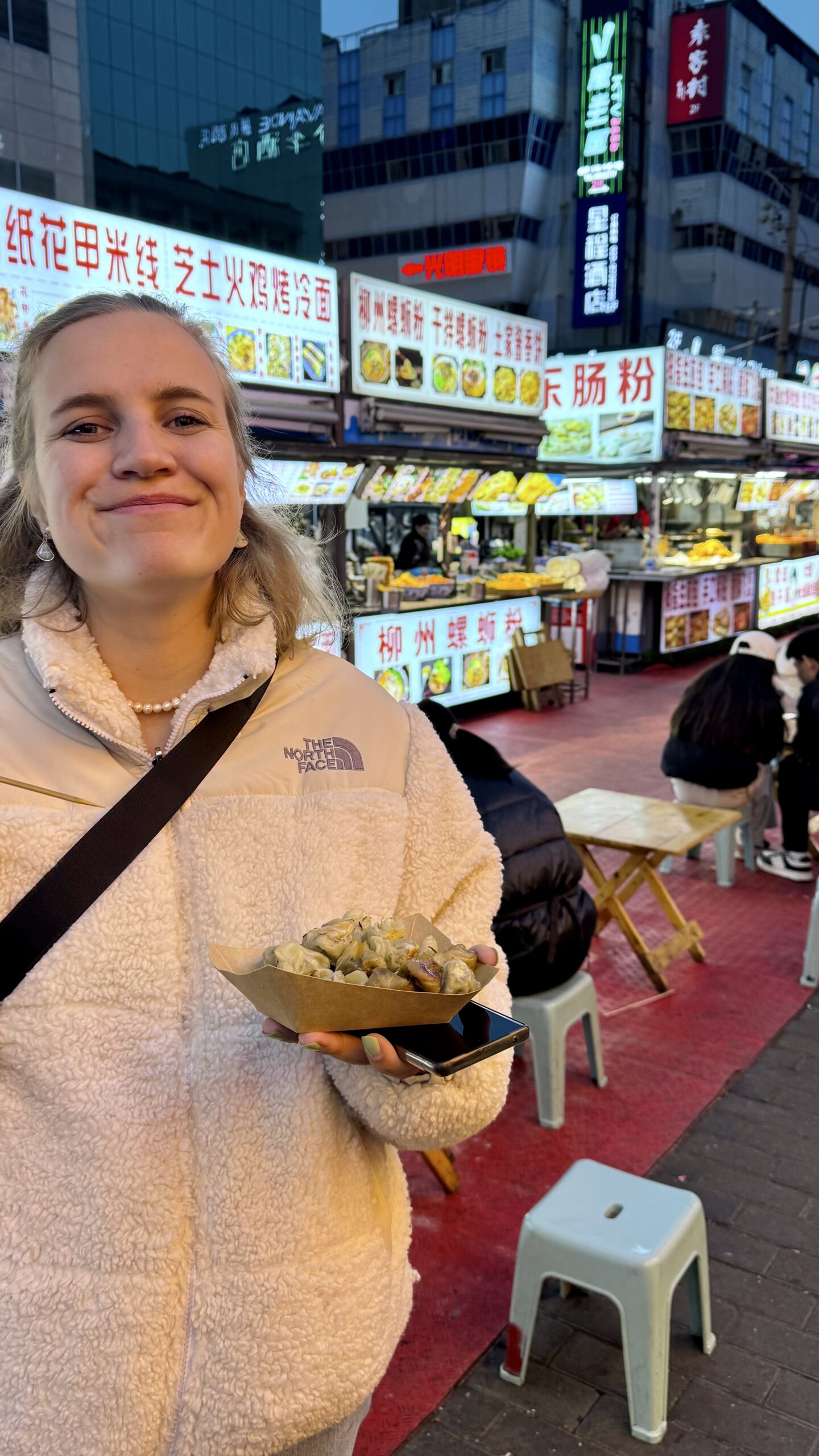 Nachts war die Straße besonders beeindruckend – wunderschön beleuchtet und voller Leben. Man konnte das pulsierende Nachtleben förmlich spüren. Während wir noch ein wenig durch die Straßen schlenderten, halfen wir Xinyang, ein Mitbringsel für seine Freundin in Harbin zu finden. Danach führte uns Wang gegen 0:30 Uhr in ein chinesisches BBQ-Restaurant.