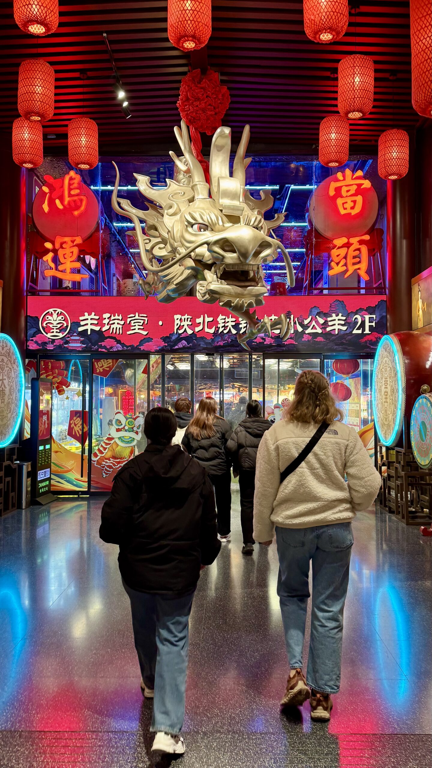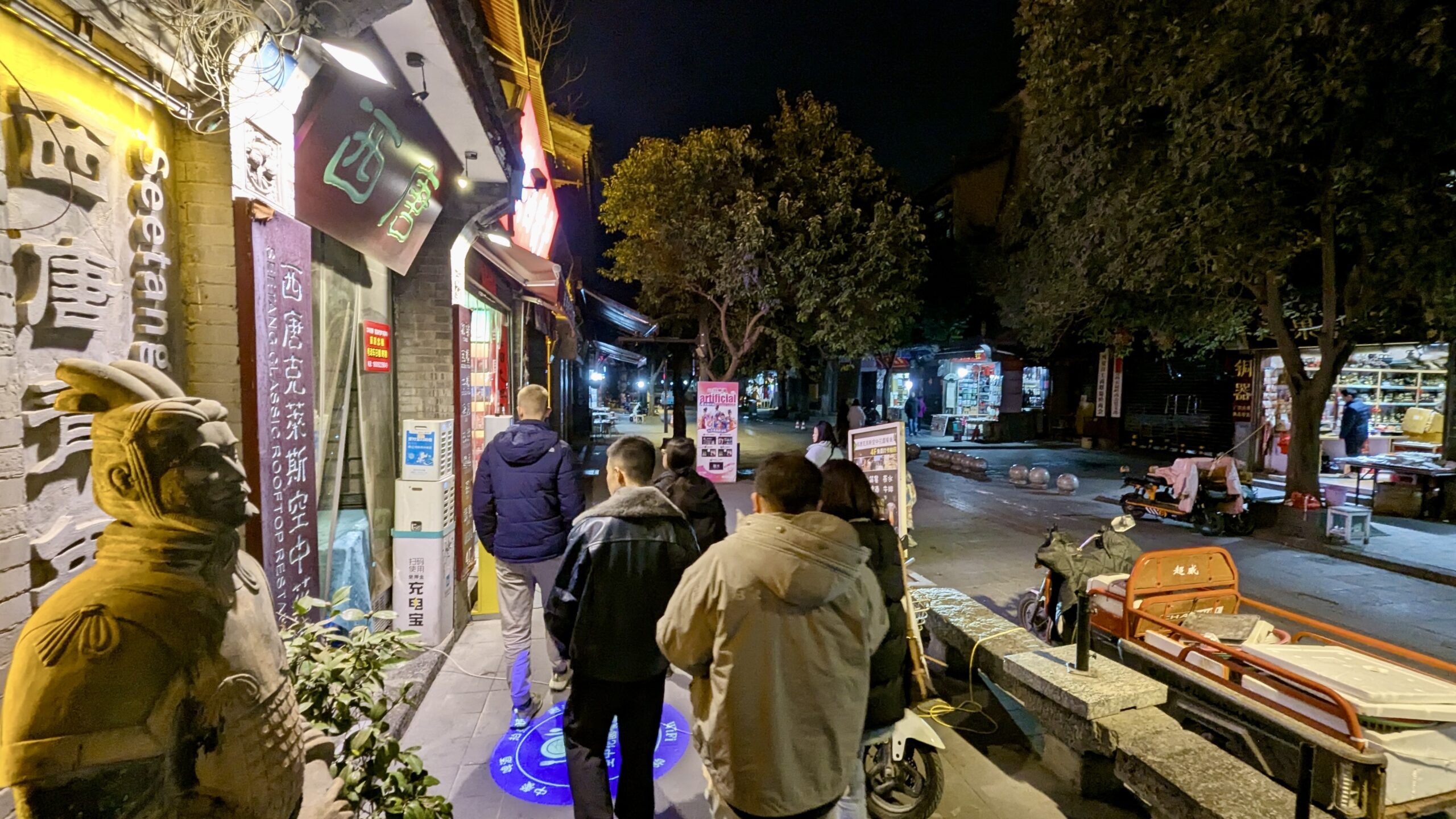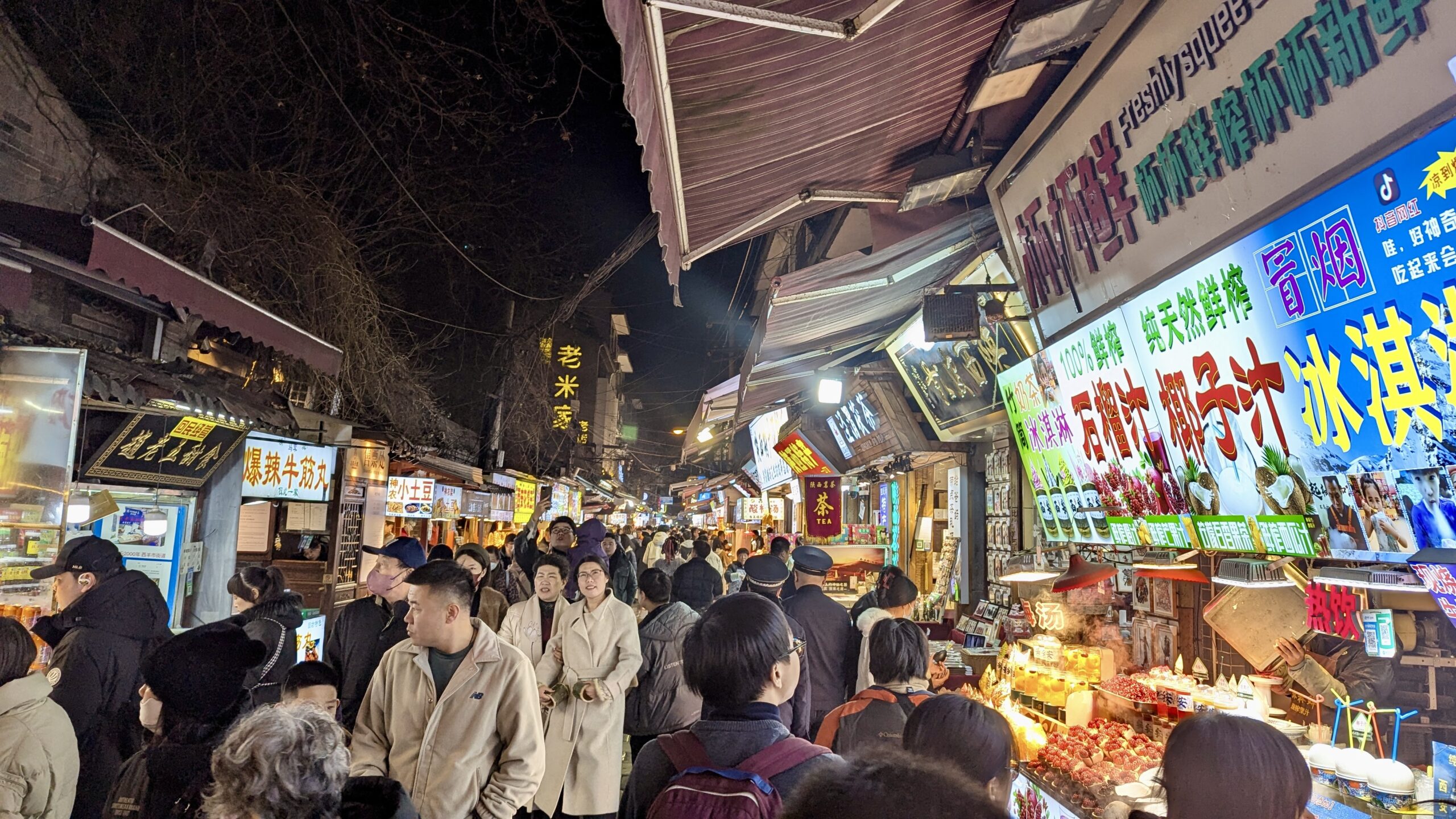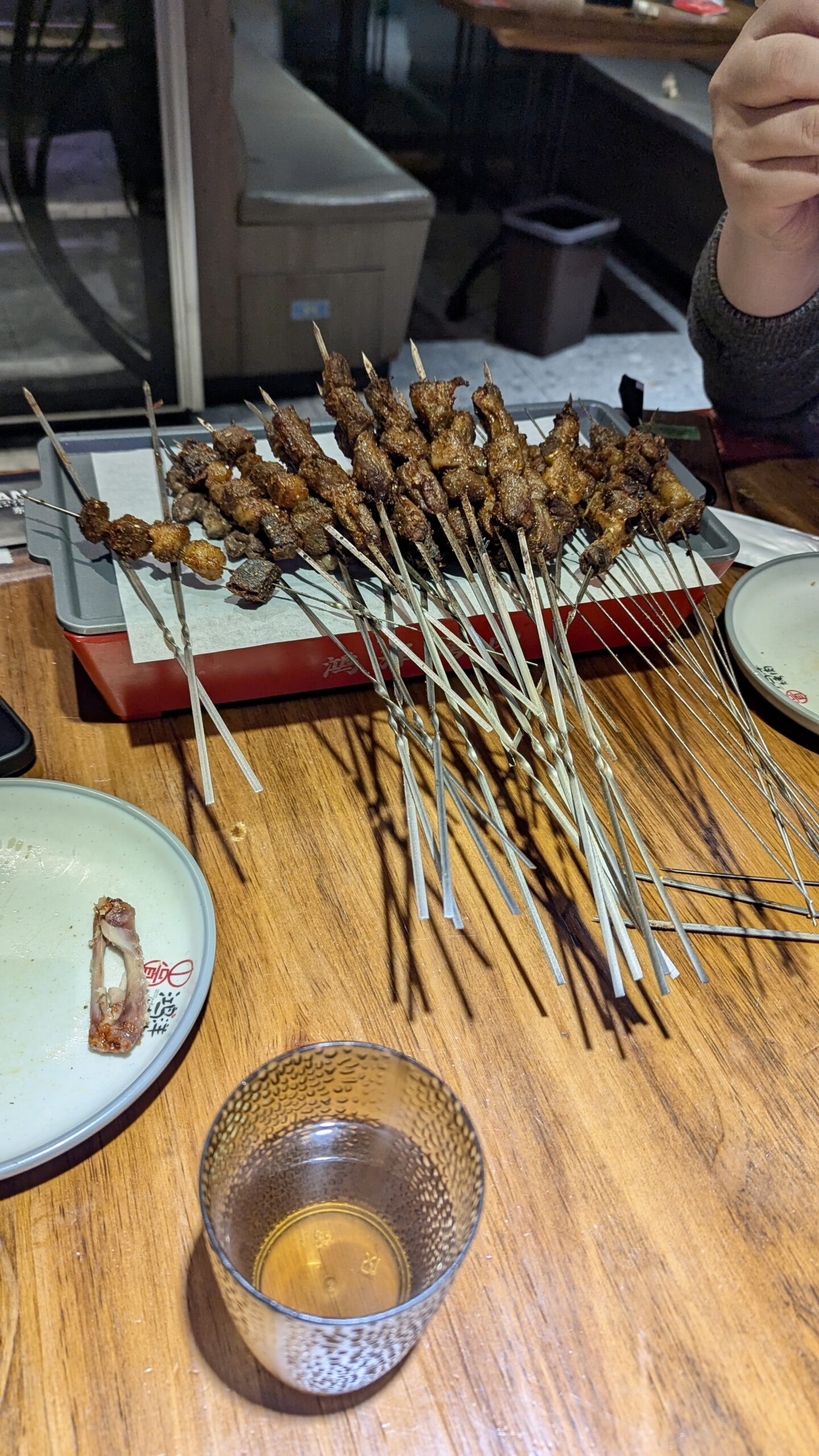 Nachts war die Straße besonders beeindruckend – wunderschön beleuchtet und voller Leben. Man konnte das pulsierende Nachtleben förmlich spüren. Während wir noch ein wenig durch die Straßen schlenderten, halfen wir Xinyang, ein Mitbringsel für seine Freundin in Harbin zu finden. Danach führte uns Wang gegen 0:30 Uhr in ein chinesisches BBQ-Restaurant.
